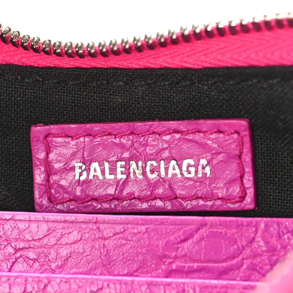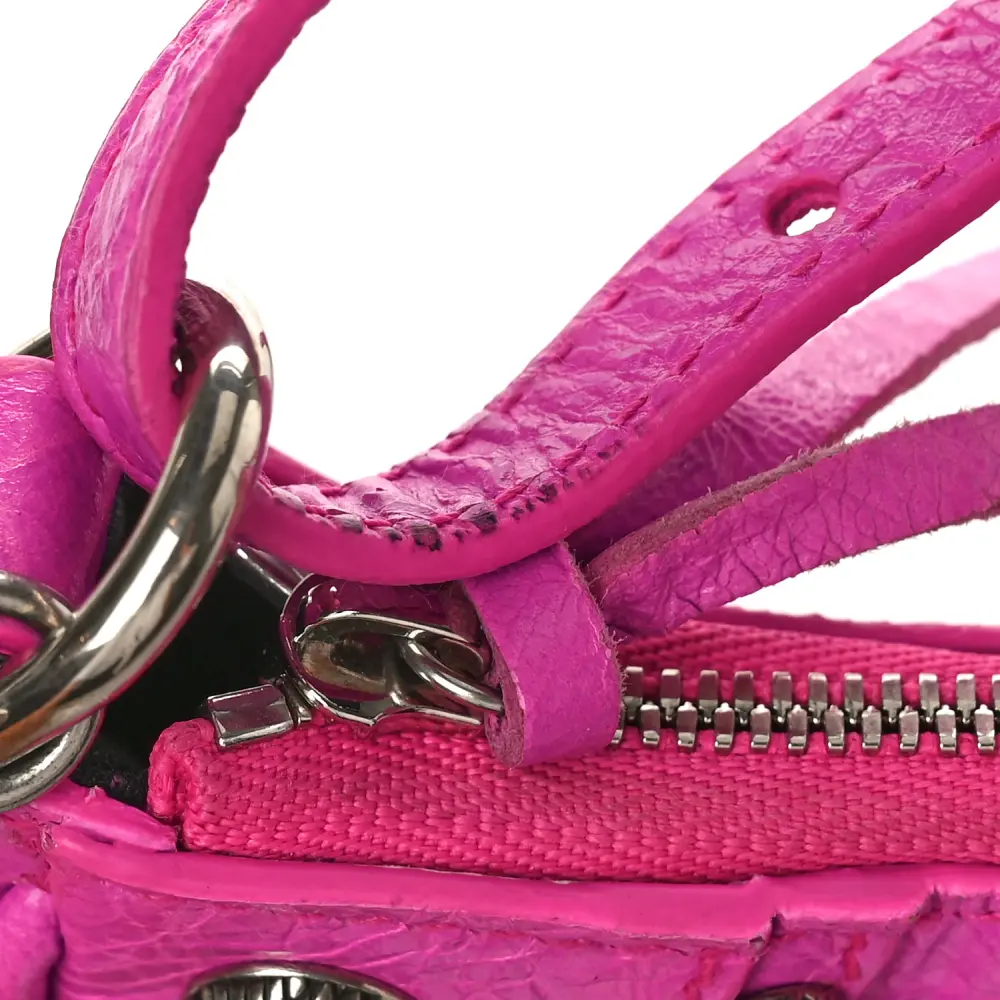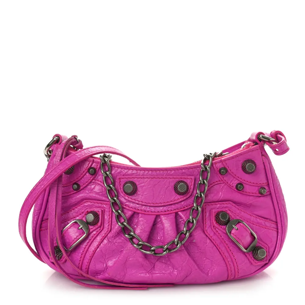 This Balenciaga Le Cagole Mini Purse With Chain in Lipstick Pink is crafted from Agneau Arena leather for a textured and vibrant finish. Silver hardware and a compact silhouette make it a stylish and practical accessory. Perfect for daily essentials, this purse is a chic choice for on-the-go fashion.