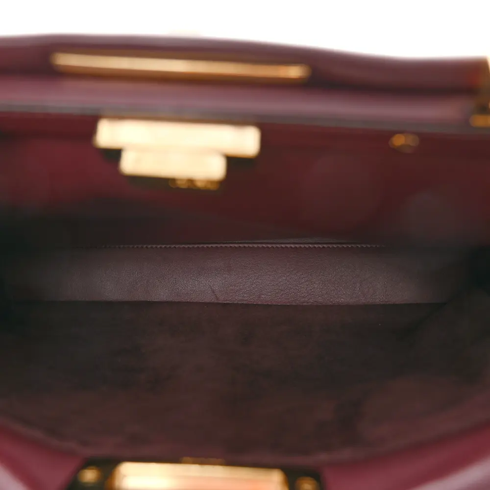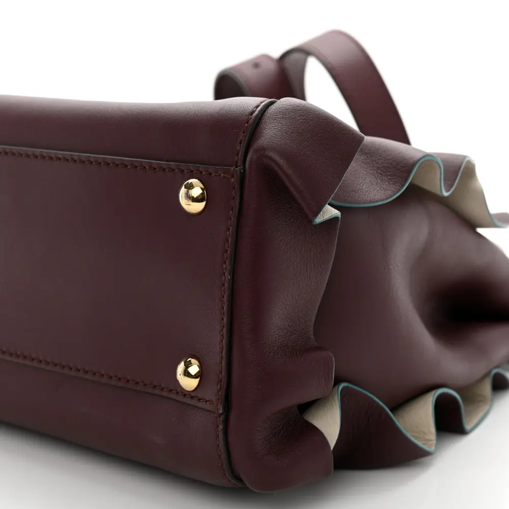 This Fendi Medium Peekaboo Iconic Satchel in Bordeaux/Latte features Bi-Color Seta Vitello Leather Waves. Gold hardware adds a refined touch to its design. Spacious compartments make it practical for daily needs. Perfect for work or formal occasions. A timeless addition to any elegant wardrobe. Classic craftsmanship meets innovative design.