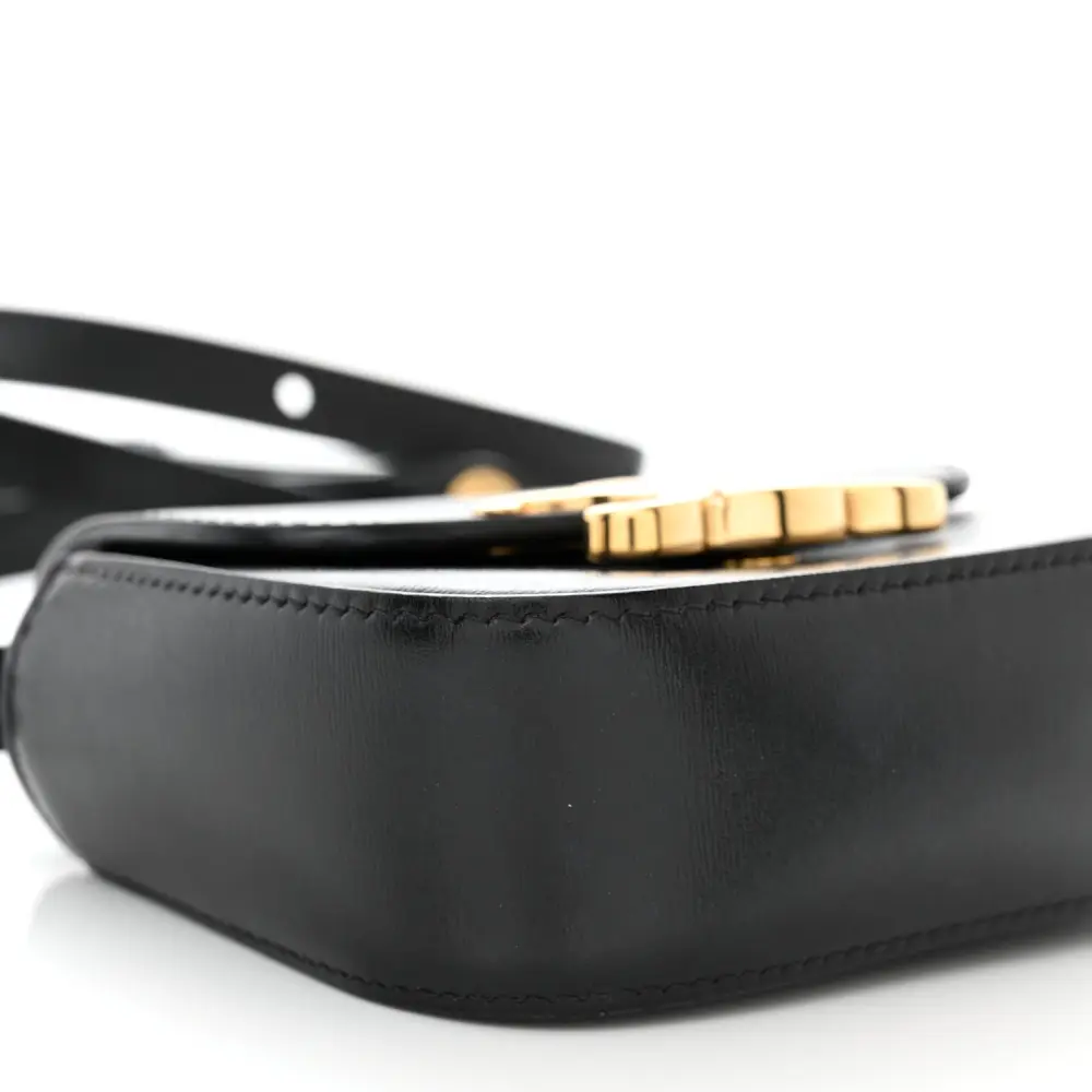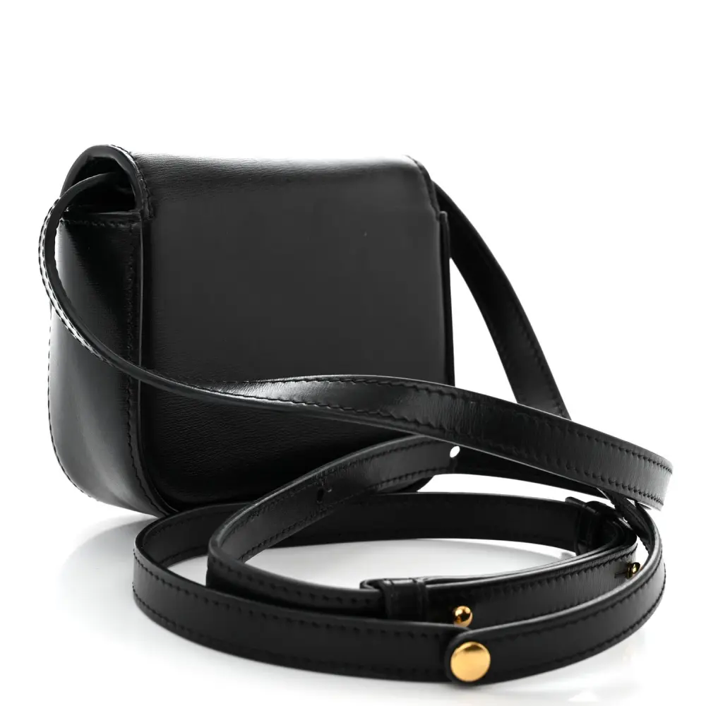 This Celine Mini Triomphe Bag in Black features shiny calfskin leather and gold hardware. Its compact size is ideal for essentials. The sleek design offers a sophisticated look. A timeless accessory for day-to-night transitions.