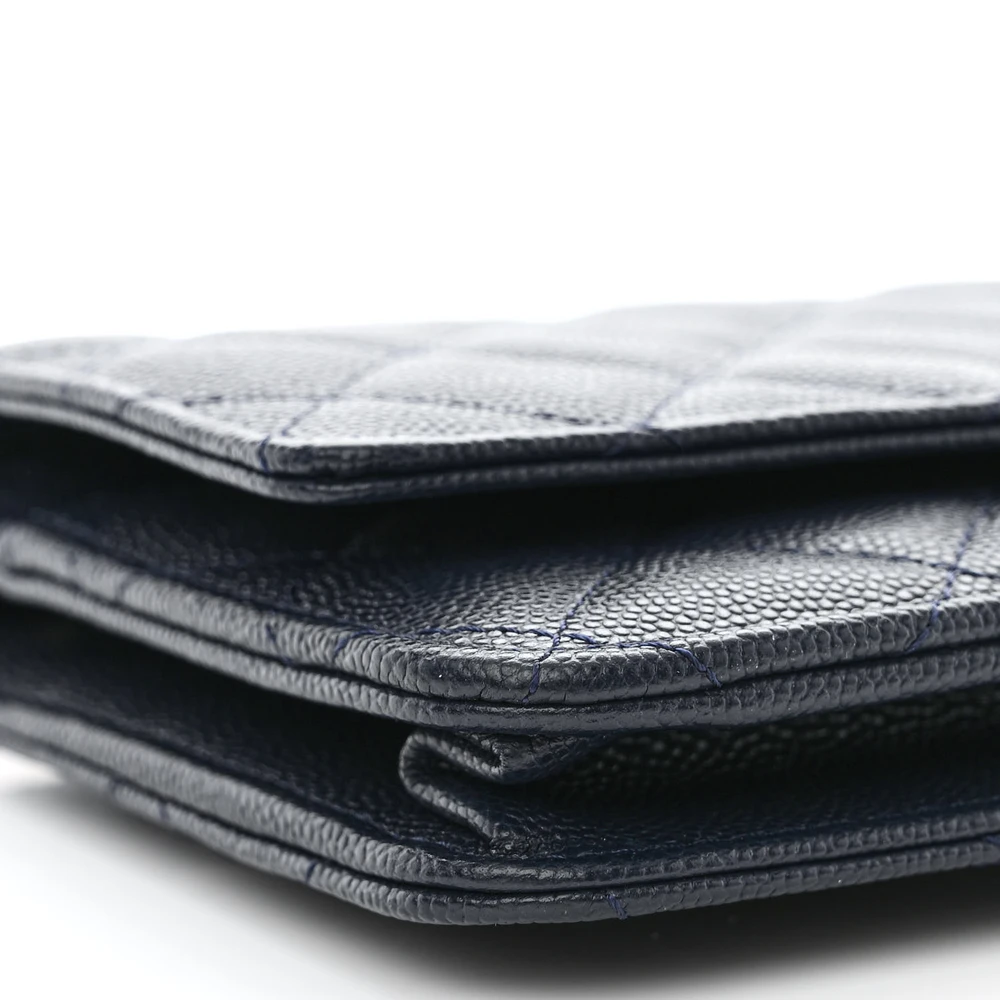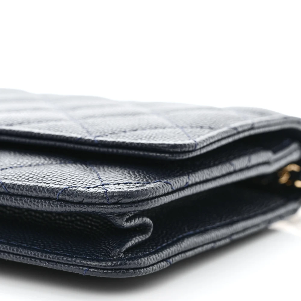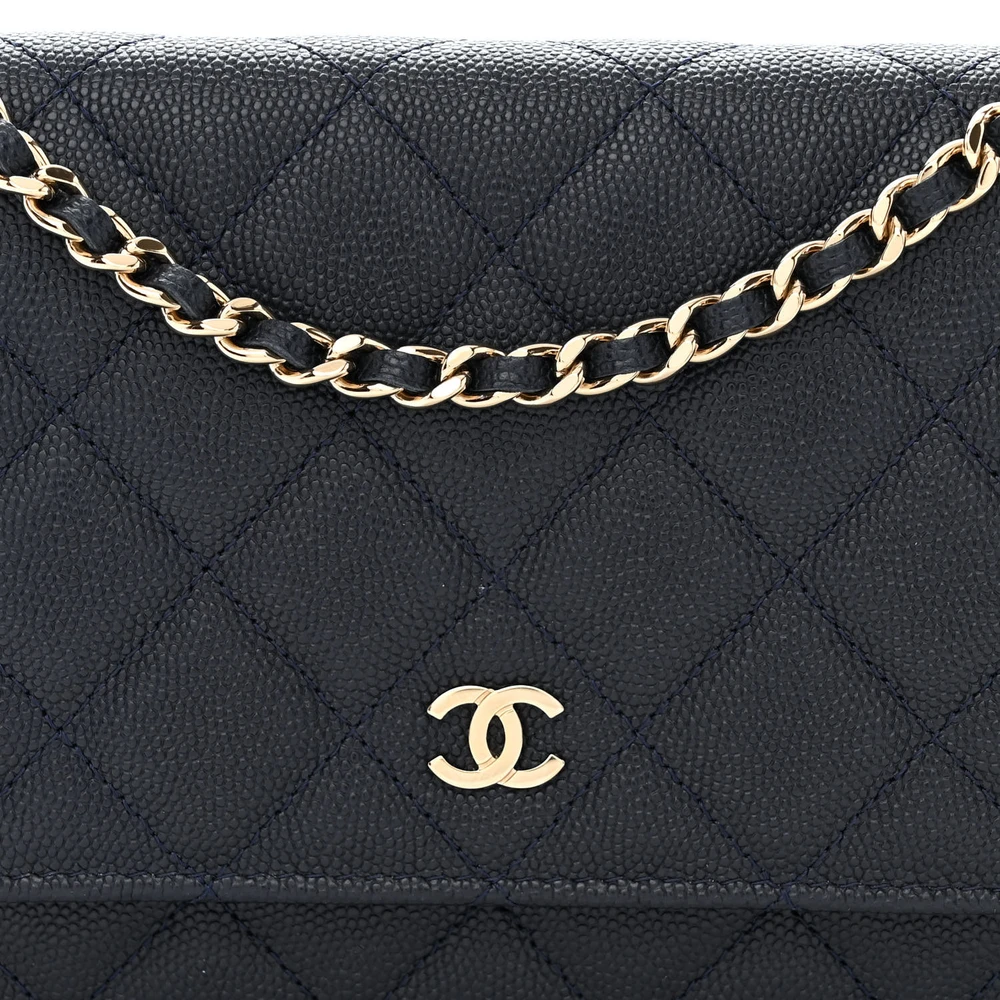 This Chanel Wallet On Chain (WOC) Small in Navy Blue Quilted Caviar Leather with Light Gold Hardware is a versatile and elegant accessory. The quilted navy blue caviar leather offers timeless sophistication, while light gold hardware adds a subtle shine. Compact and practical, it features compartments for cards, cash, and essentials. The chain strap allows for crossbody or shoulder wear, making it perfect for day-to-evening transitions. A chic piece that embodies Chanel’s classic style. Ideal for those who appreciate understated luxury.