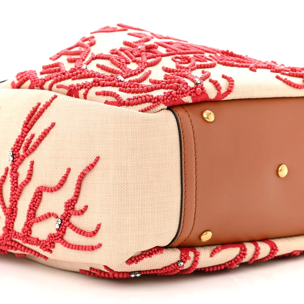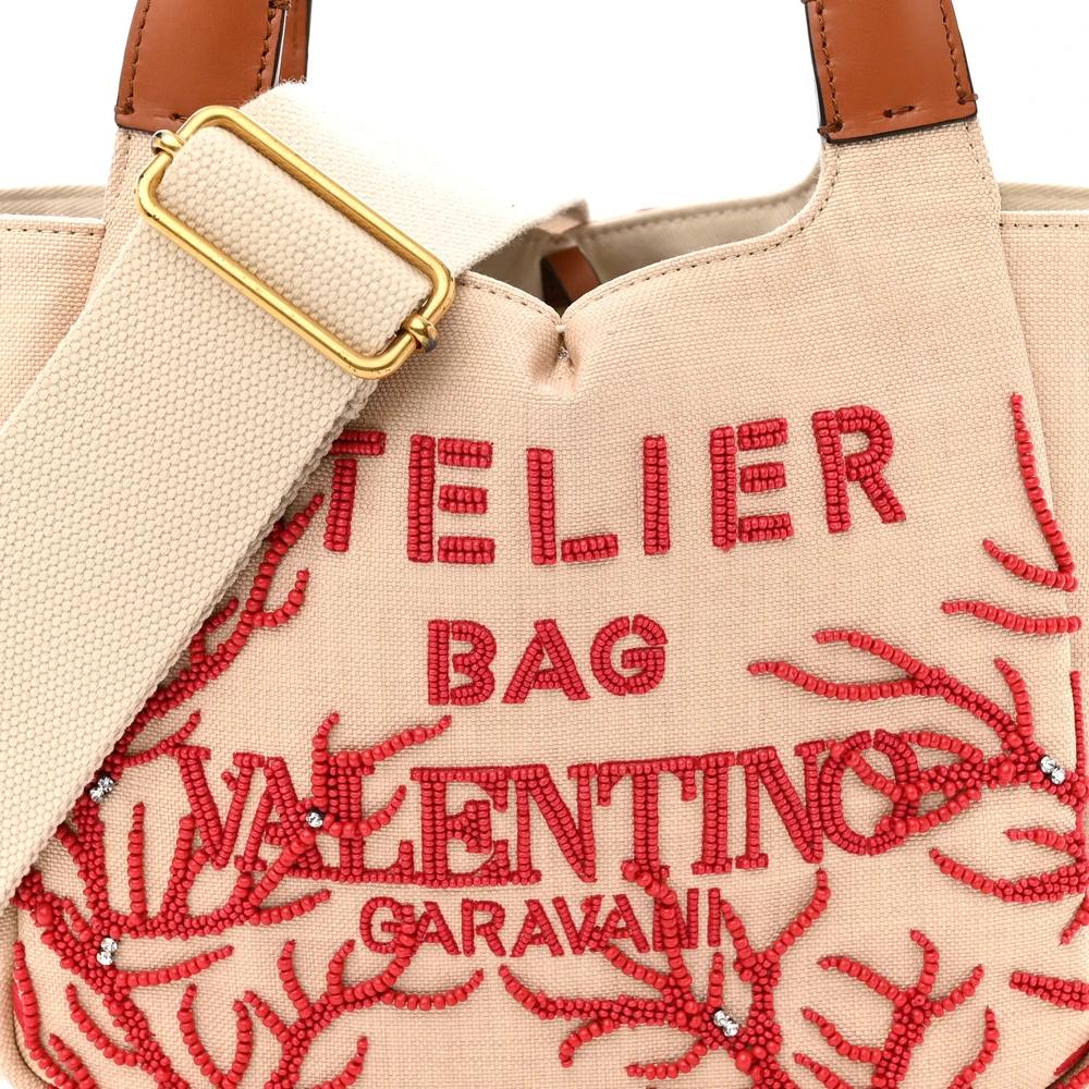 This Valentino Garavani Large Atelier Print Tote Bag in Naturale/Red is unique and eye-catching. Beaded canvas design with gold hardware adds a touch of luxury. Spacious interior fits all your essentials. Perfect for travel or casual outings. Combines functionality with artistic flair. A conversation-starting piece.
