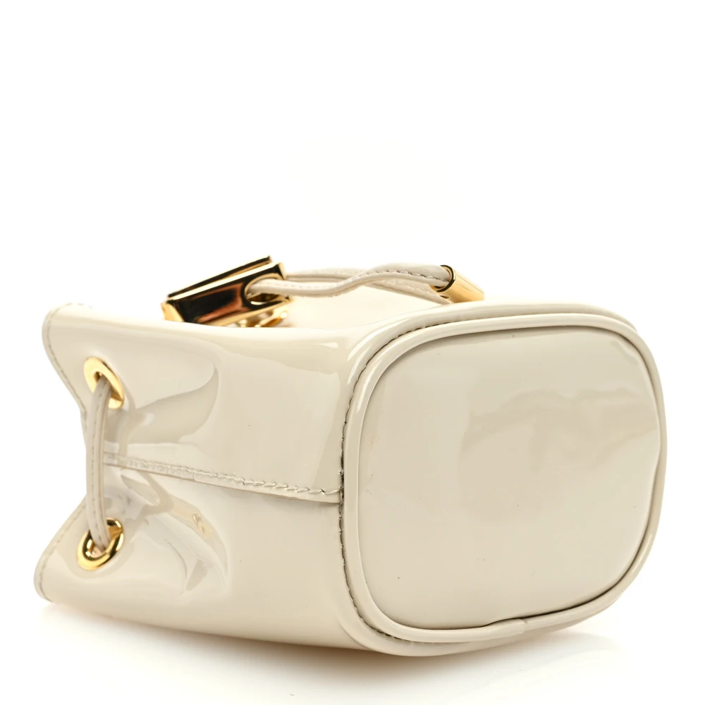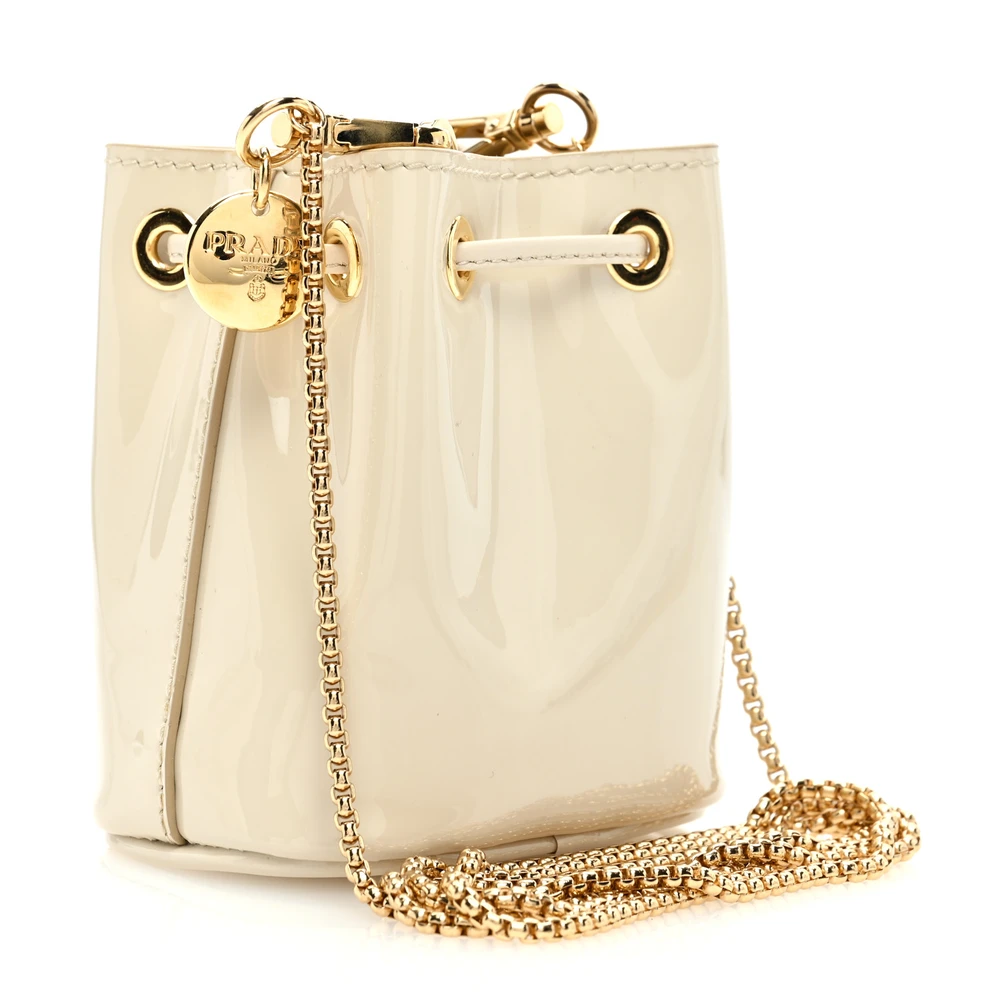 This Prada Mini Metal Triangle Logo Drawcord Pouch Shoulder Bag in Avorio is crafted from vernice leather. Gold hardware enhances its sophisticated design. Compact yet functional for daily essentials. Drawcord closure adds a chic touch. Perfect for casual or formal occasions. A stylish and versatile accessory.