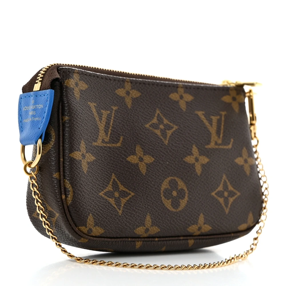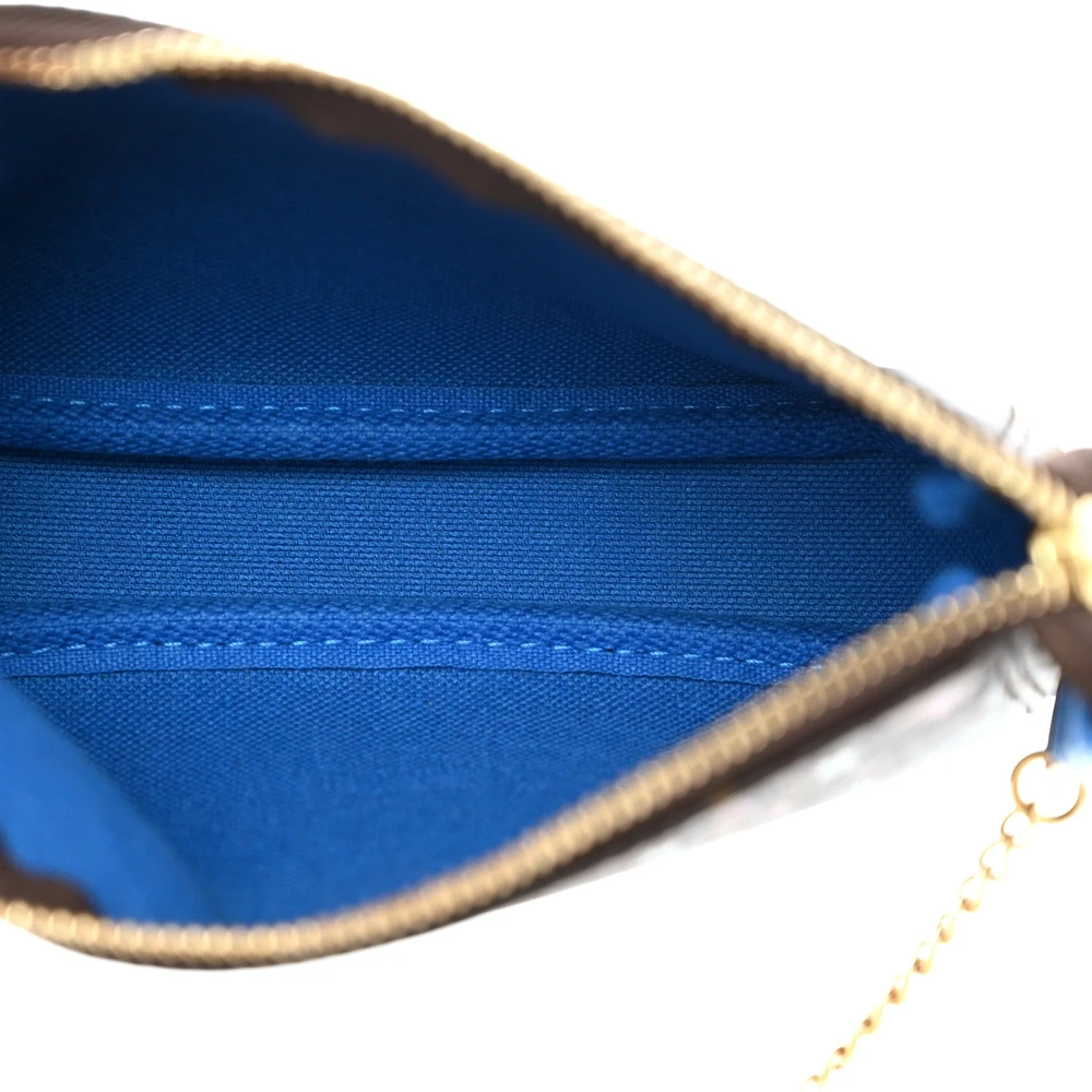 This Louis Vuitton Monogram 2019 Christmas Animation Mini Venice Pochette Accessories in blue is a playful and festive piece. Featuring Vivienne sailing in a gondola on the classic monogram canvas, this mini pochette is accented with gold hardware and a colorful design. The interior offers a vibrant blue fabric lining, making this bag a cheerful and stylish accessory for the holiday season.