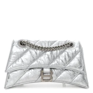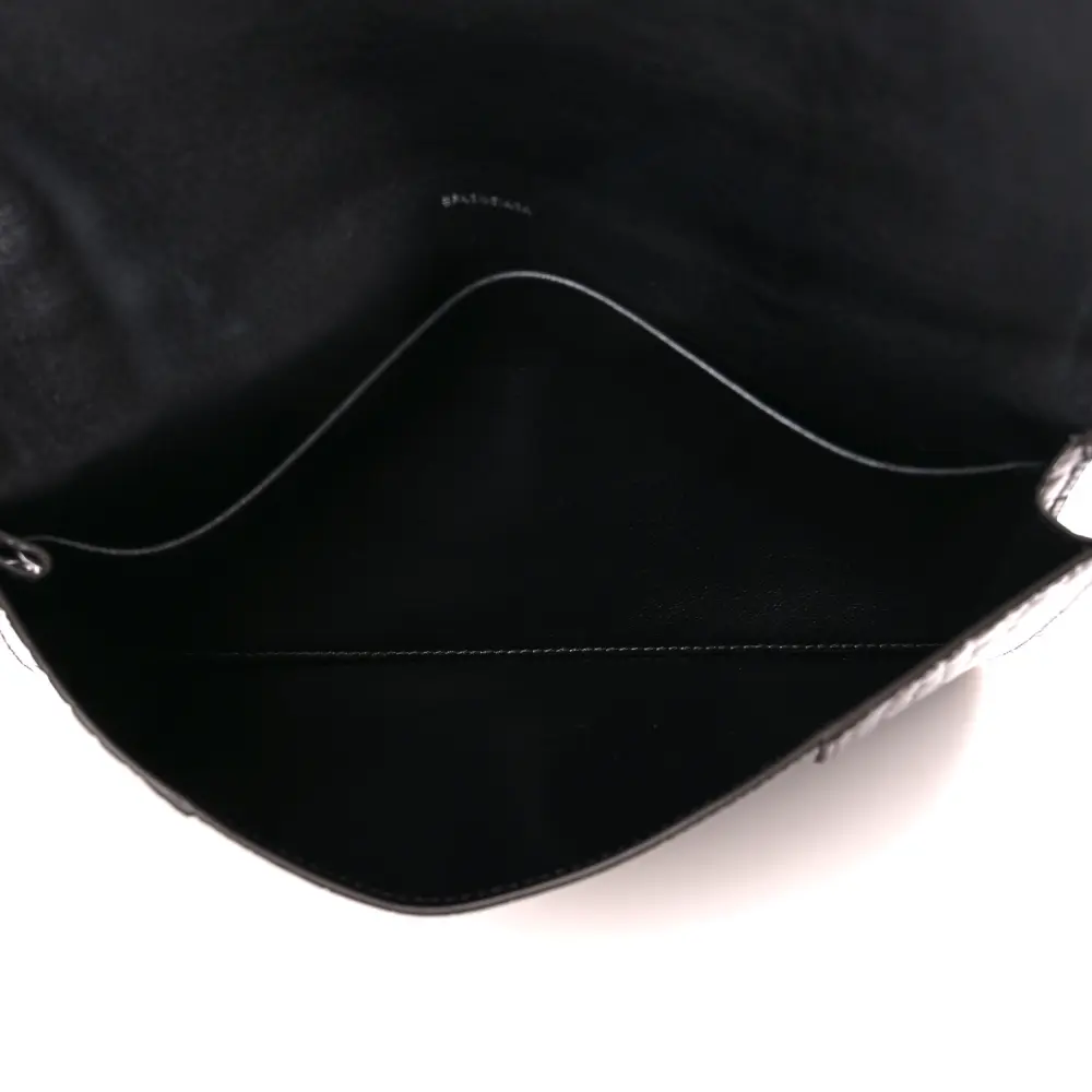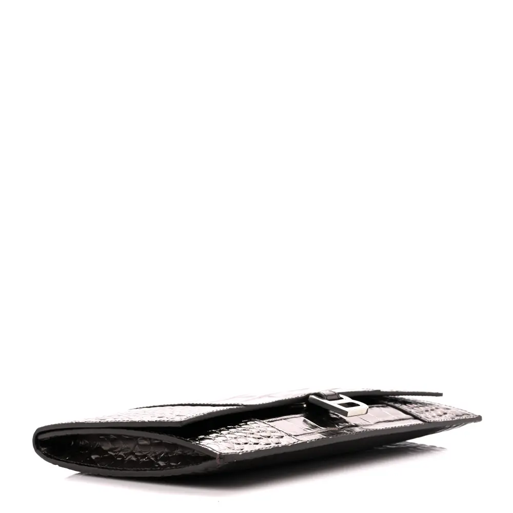 This Balenciaga Medium Hourglass Flap Flat Pouch in Metallic Dark Bronze features crocodile-embossed shiny calfskin leather for a sleek and polished design. The metallic finish and silver hardware add a luxurious touch to its elegant silhouette. Ideal for evening events or as a sophisticated accessory for formal occasions. Compact yet functional, it’s perfect for carrying essentials in style. A refined addition to any accessory collection.