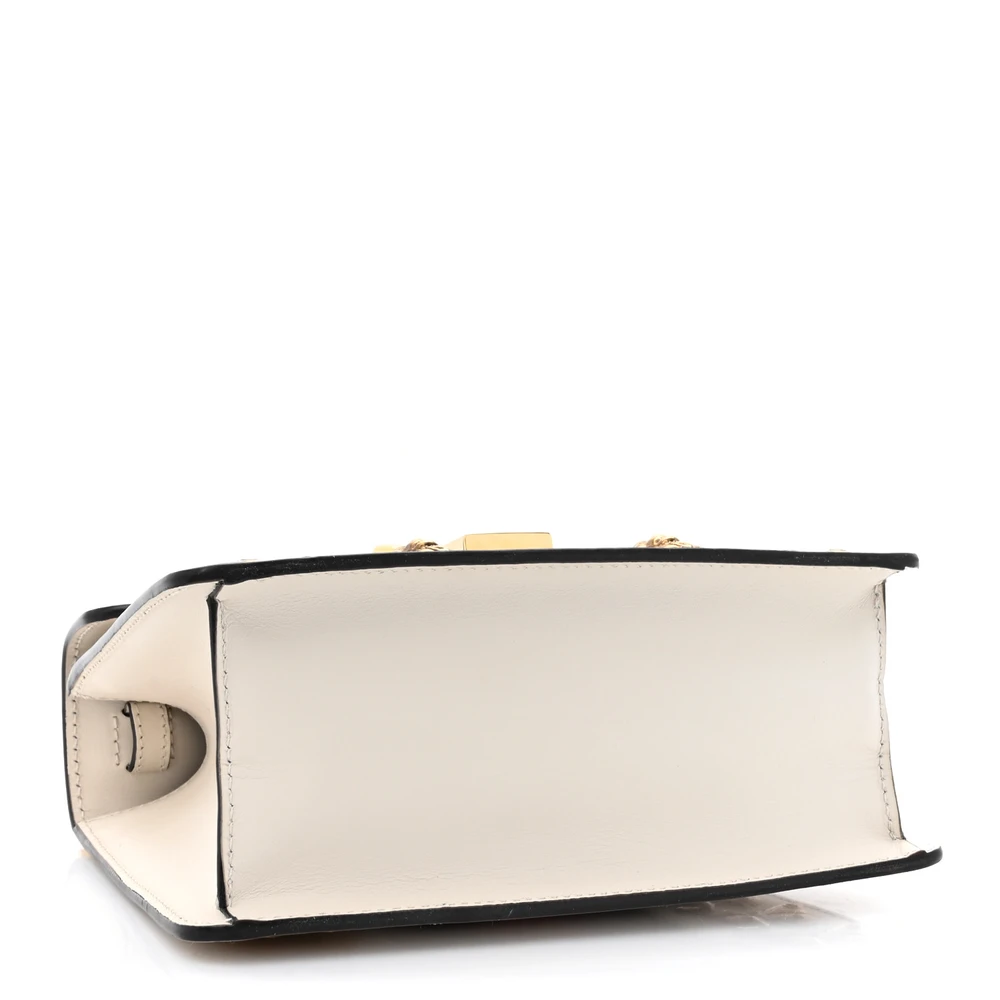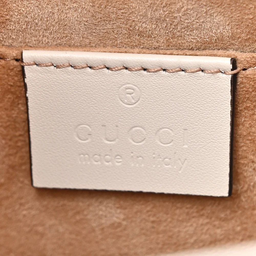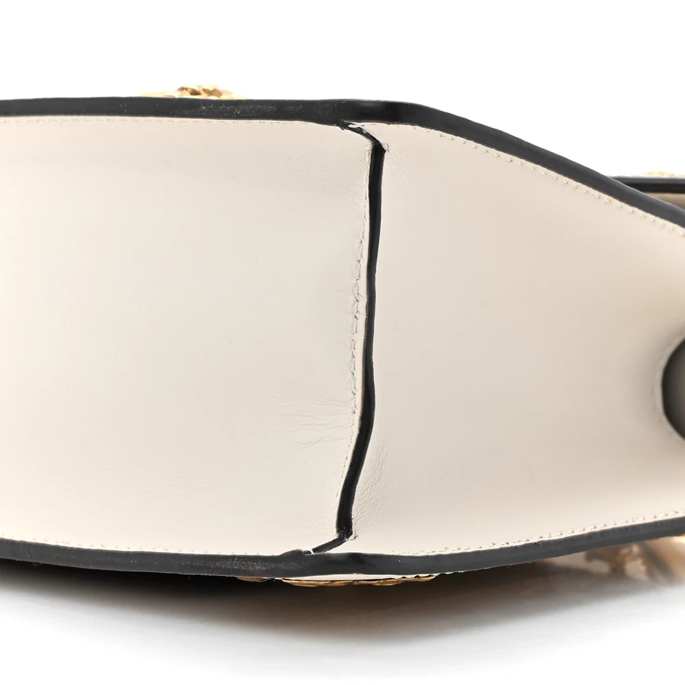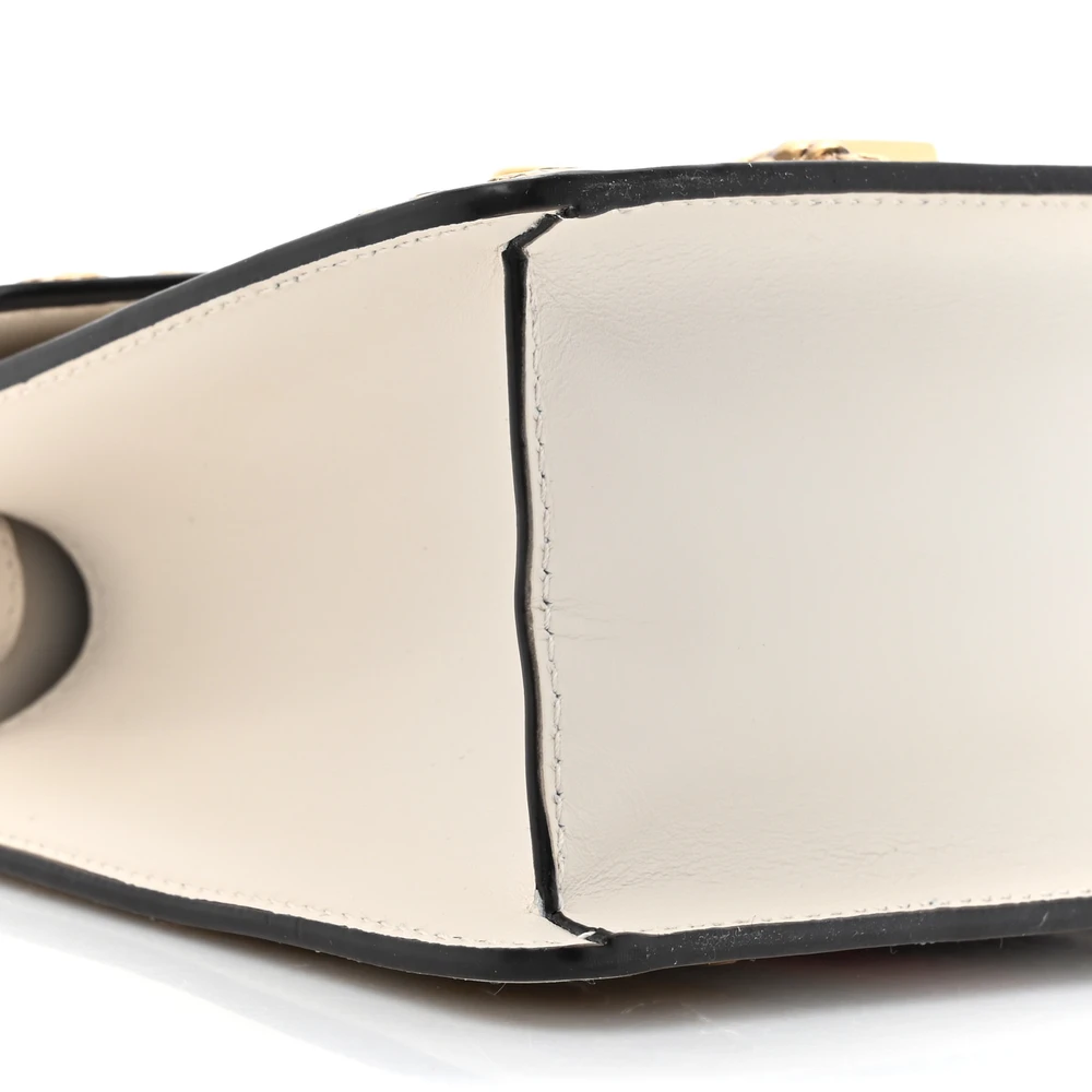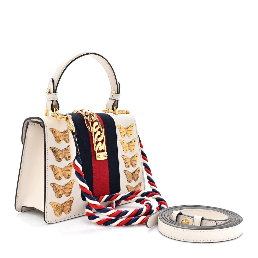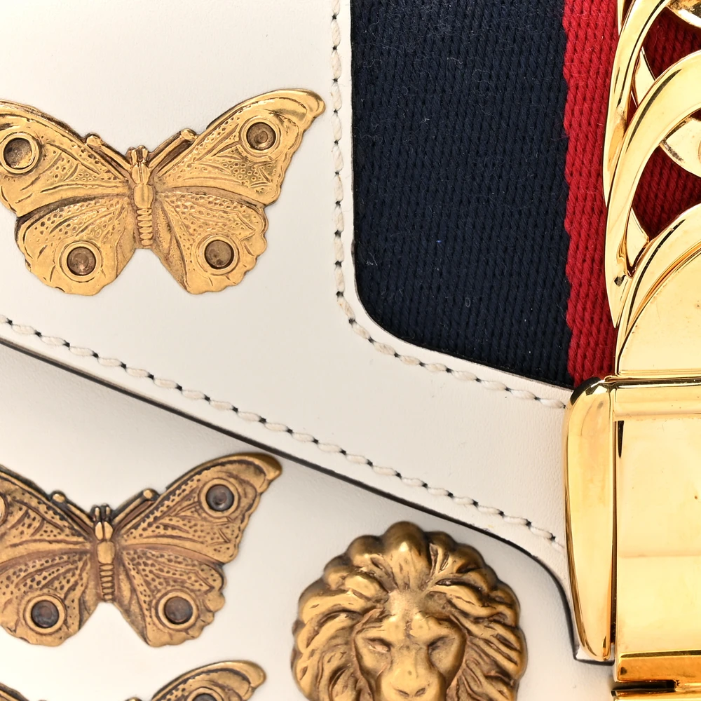 This Gucci Mini Sylvie Top Handle Bag is crafted in white calfskin leather. Animal studs and gold hardware add a bold touch. Compact size perfect for essentials. Iconic Sylvie web stripe enhances its unique appeal. A statement piece for any collection.