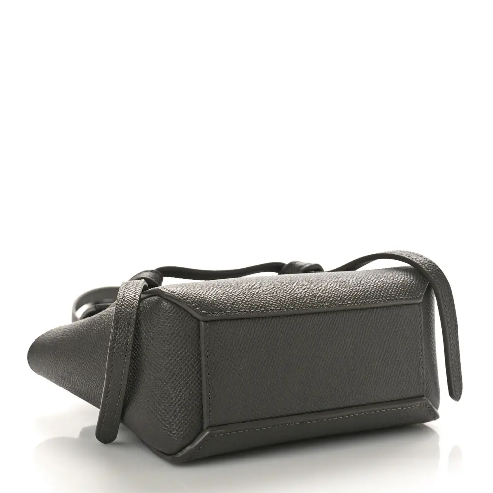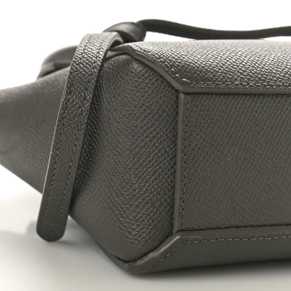 This Celine Pico Belt Bag in Grey is crafted from grained calfskin leather with gold hardware. Its compact size is perfect for carrying essentials. The structured silhouette includes a top handle and adjustable strap. A stylish and functional accessory for modern living.