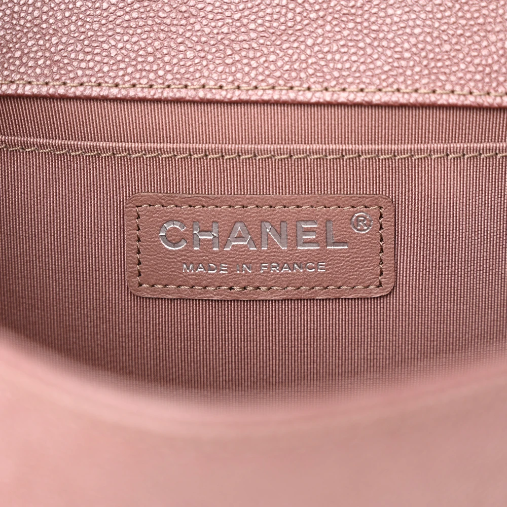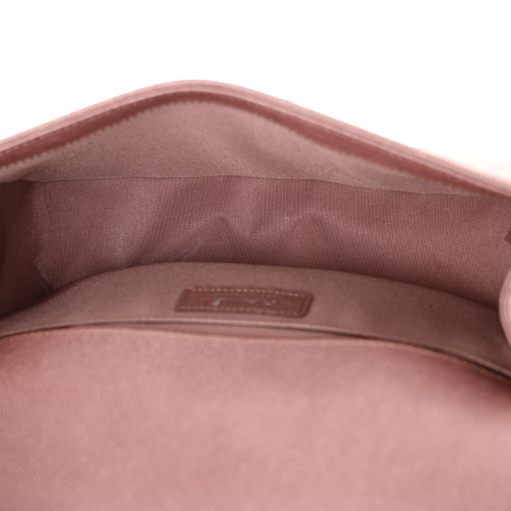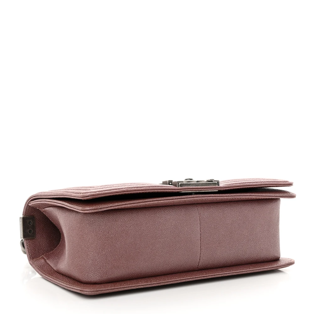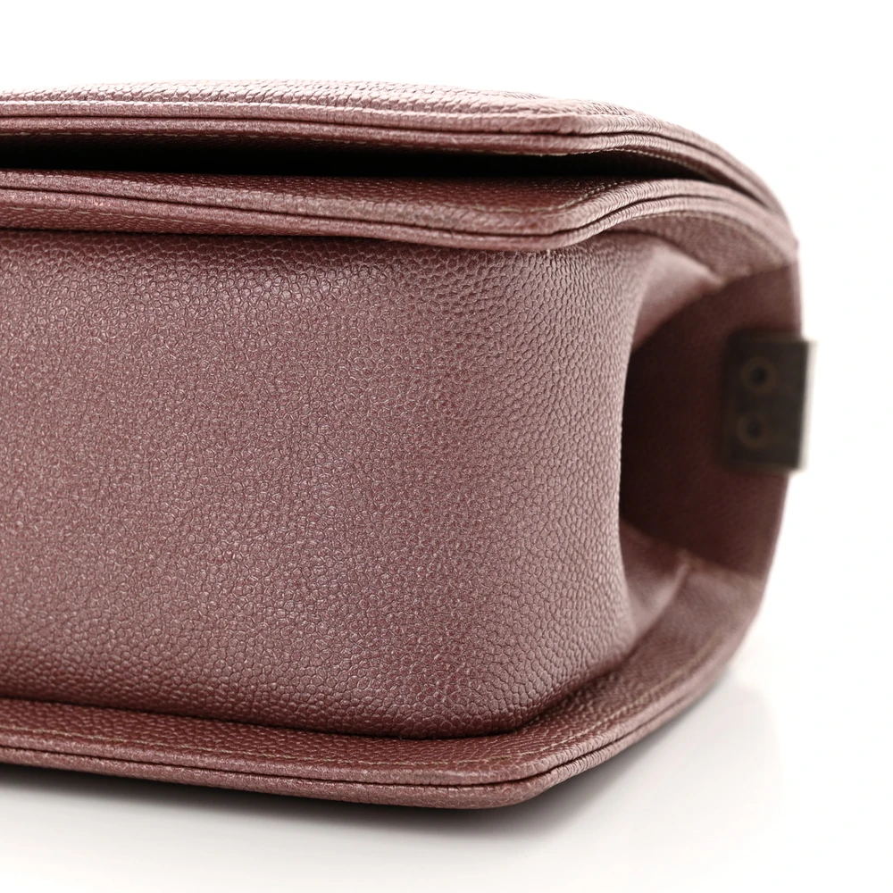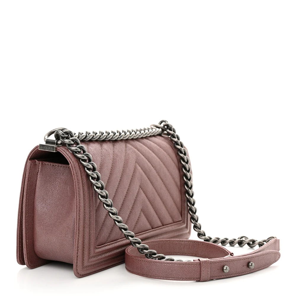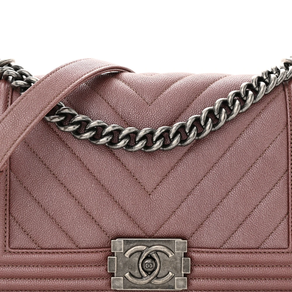 This Chanel Boy Flap Medium in Metallic Dark Pink Chevron Quilted Caviar Leather with Ruthenium Hardware is a glamorous yet edgy accessory. The metallic finish on the chevron quilting adds a contemporary touch to the durable caviar leather. Ruthenium hardware provides a striking contrast, elevating its bold aesthetic. The medium size is perfect for carrying essentials with ease. Its structured silhouette makes it versatile for day-to-evening wear. A must-have for those who love modern luxury.