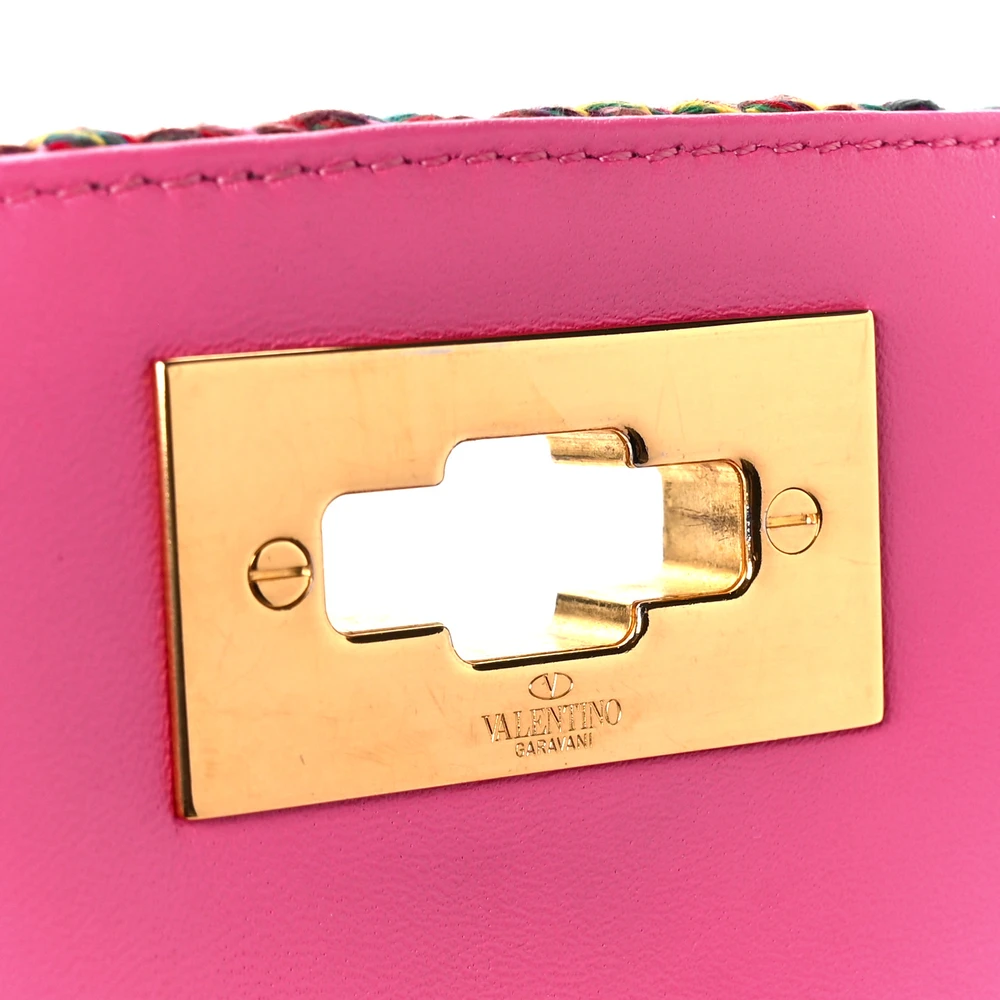 This Valentino Garavani Large Roman Stud Shoulder Bag in Multicolor/Feminine Pink is bold and chic. Wool woven fabric with gold hardware creates a unique look. Spacious for daily essentials while adding a vibrant touch. Perfect for casual outings or special occasions.