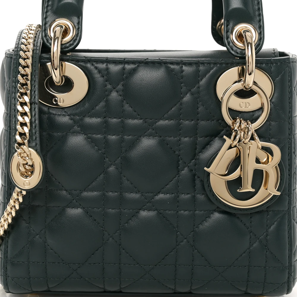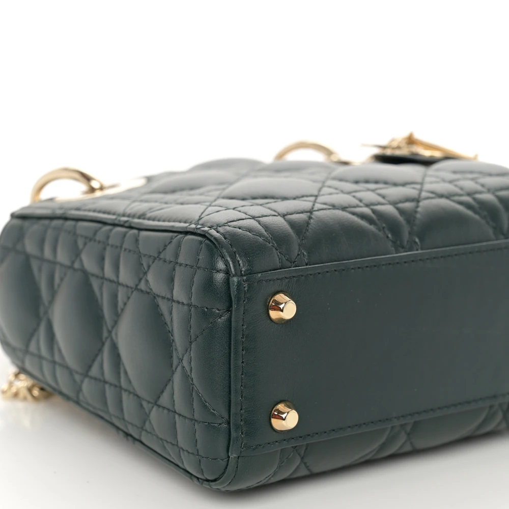 This Dior Mini Lady Dior in Dark Green Cannage Lambskin Leather offers a unique twist on an iconic design. Light gold hardware highlights its rich green hue, making it a standout accessory. Compact and stylish, it’s perfect for carrying essentials. The Cannage stitching reflects Dior’s timeless artistry. Ideal for both casual and formal occasions. Add this elegant piece to your collection.