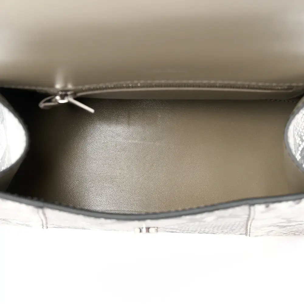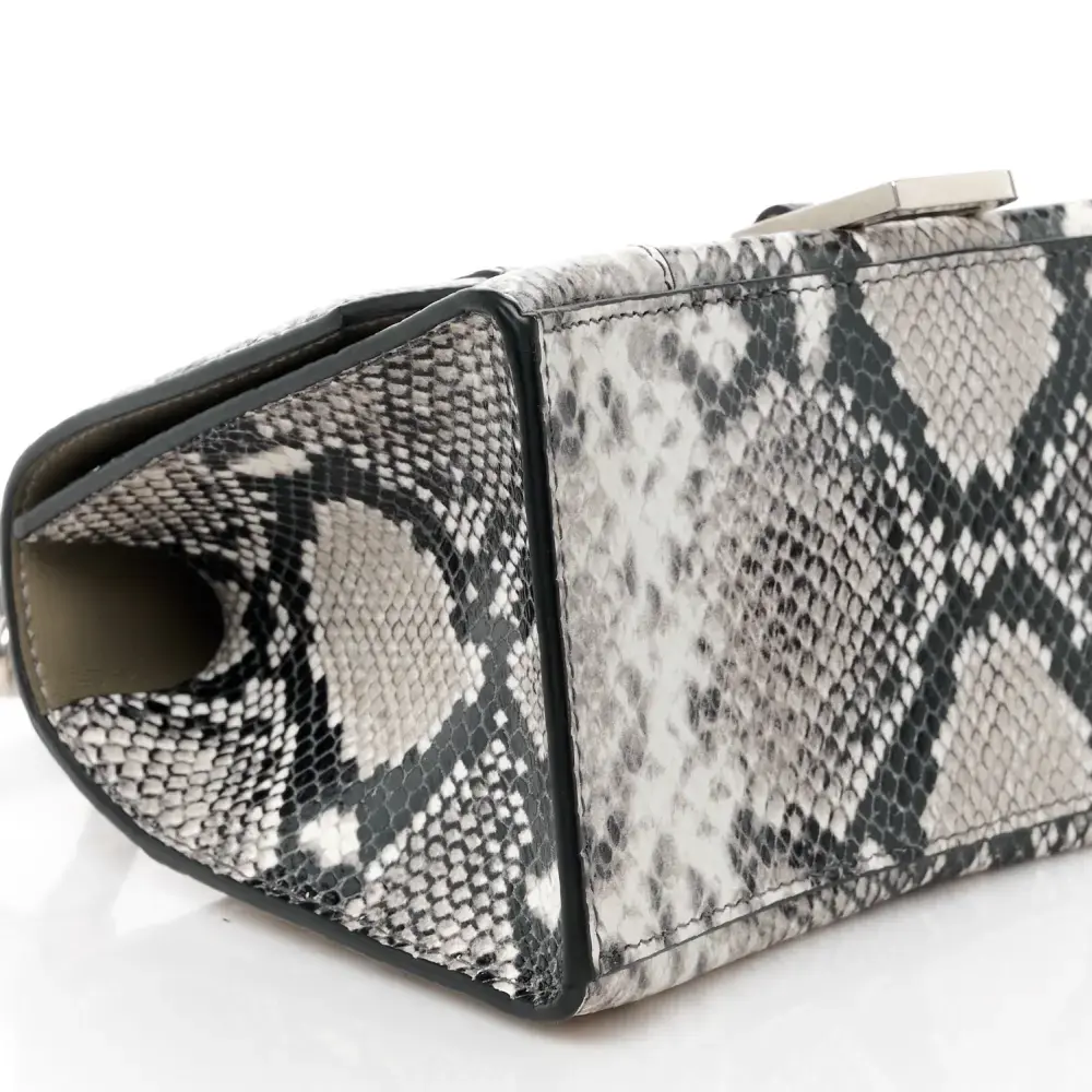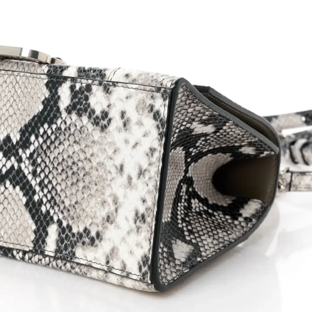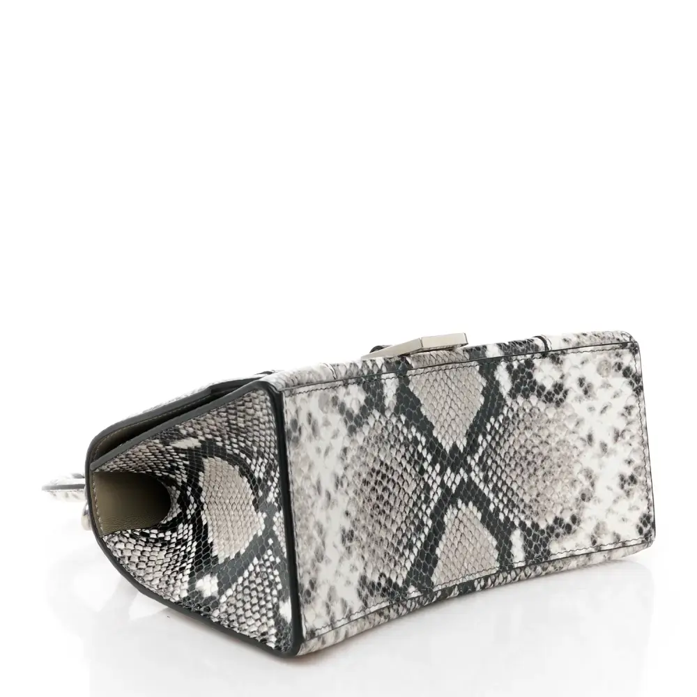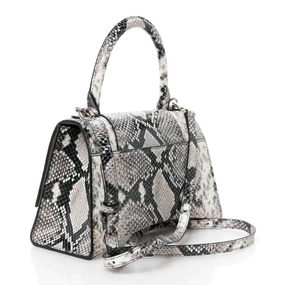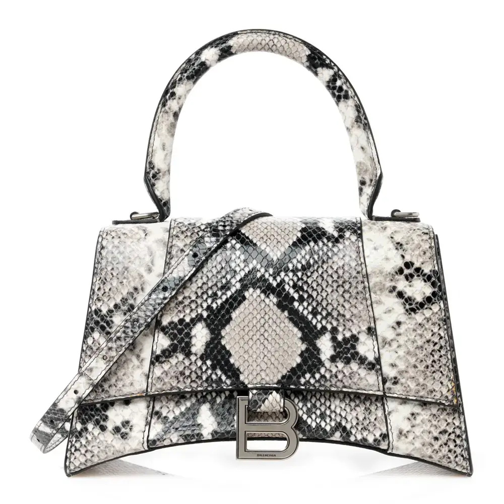 This Balenciaga Small Hourglass Top Handle Bag in Black/White features calfskin leather with a snake-effect finish and silver hardware. Its structured design and bold print make it a standout accessory for any ensemble. The compact size is ideal for essentials, while the top handle and strap provide versatile styling. Perfect for adding an edgy touch to your wardrobe, this bag reflects Balenciaga’s commitment to high-fashion innovation.