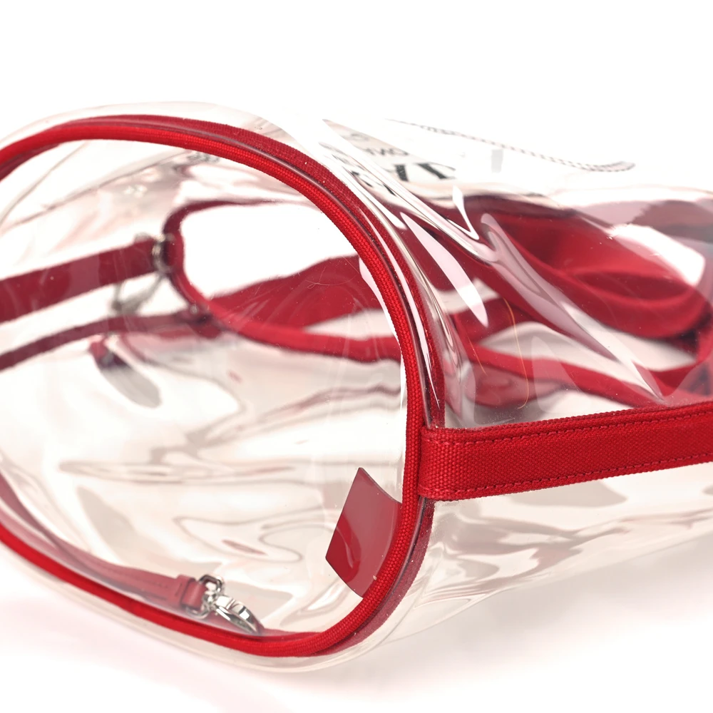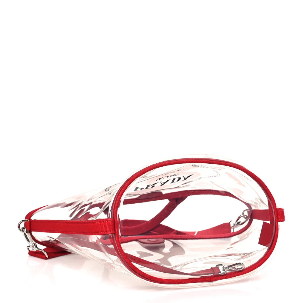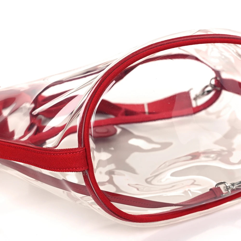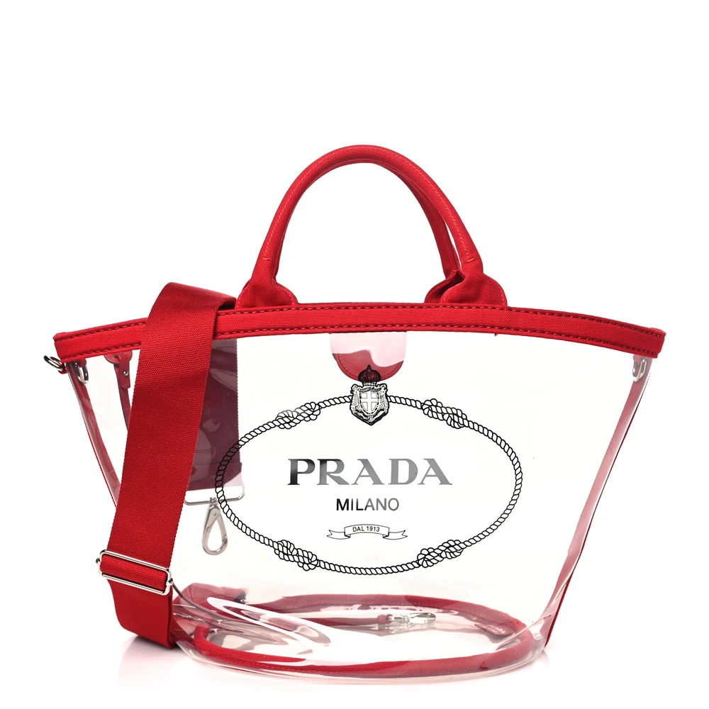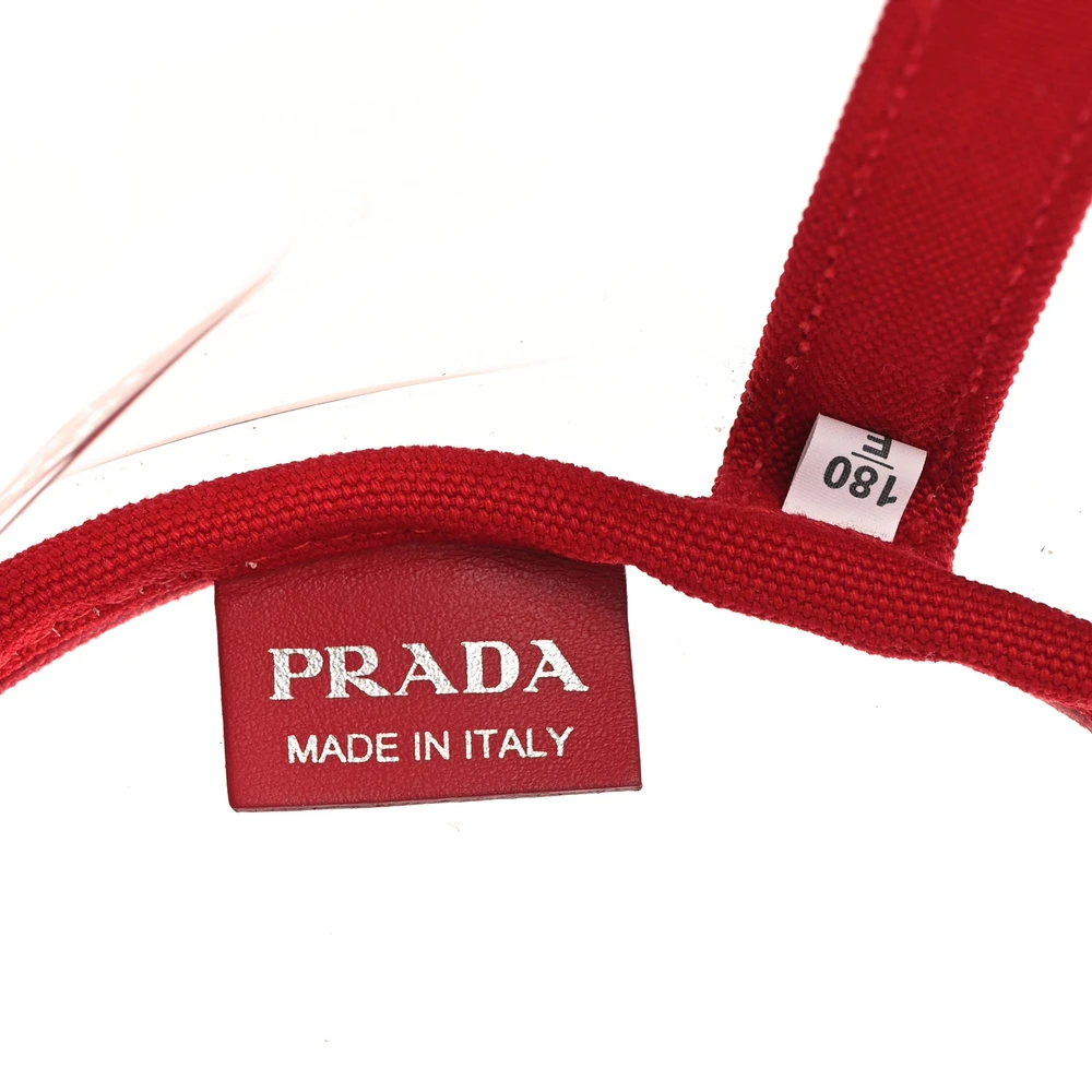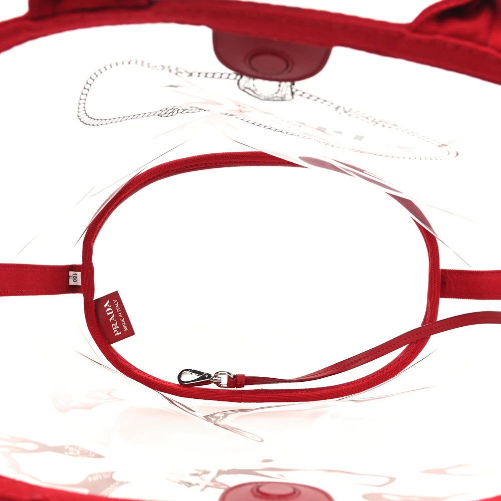 This Prada Small Shopper Tote in Rosso combines plexiglass and calfskin leather. Vibrant red hue makes a statement. Spacious enough for daily essentials. Comfortable handles ensure effortless carrying. Ideal for casual outings or errands. A unique and fashionable tote for any wardrobe.