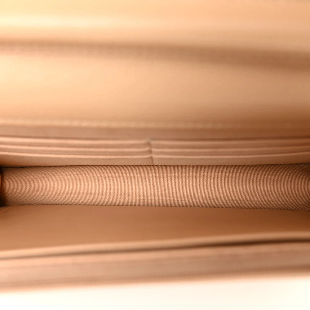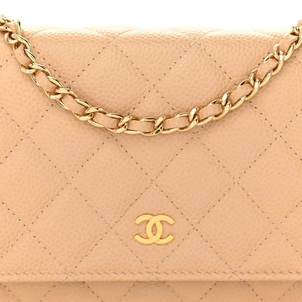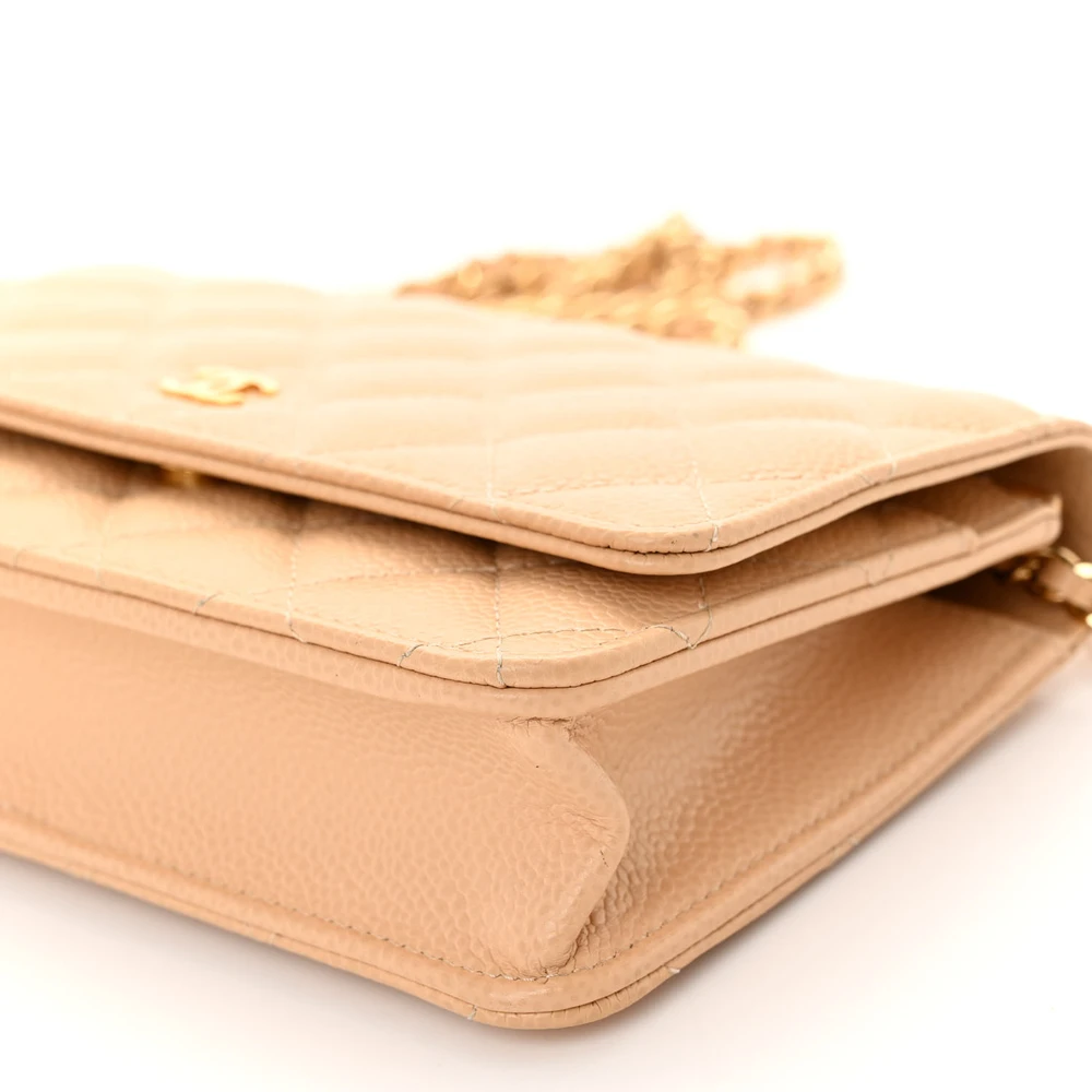 This Chanel Wallet On Chain (WOC) Small in Beige Quilted Caviar Leather with Gold Hardware is a timeless accessory. The iconic quilted design and luxurious beige caviar leather add sophistication to any outfit. Gold hardware enhances the elegance, making it perfect for day or evening use. The compact size is ideal for carrying essentials while maintaining a sleek profile. Inside, multiple compartments offer practical organization. A versatile piece that embodies Chanel’s classic aesthetic.