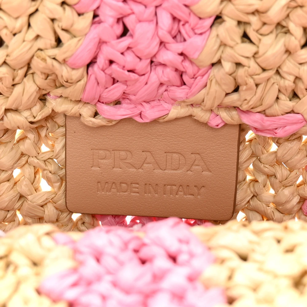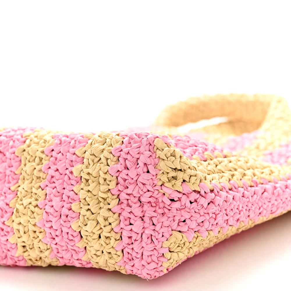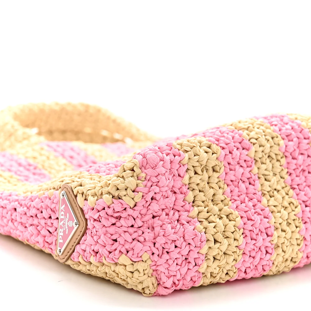 This Prada Small Effect Crochet Striped Logo Tote in Naturale/Petalo features yarn raffia construction. Striped design adds a trendy touch. Compact yet spacious enough for essentials. Comfortable handles for versatile carrying options. A stylish and chic tote for summer outings.