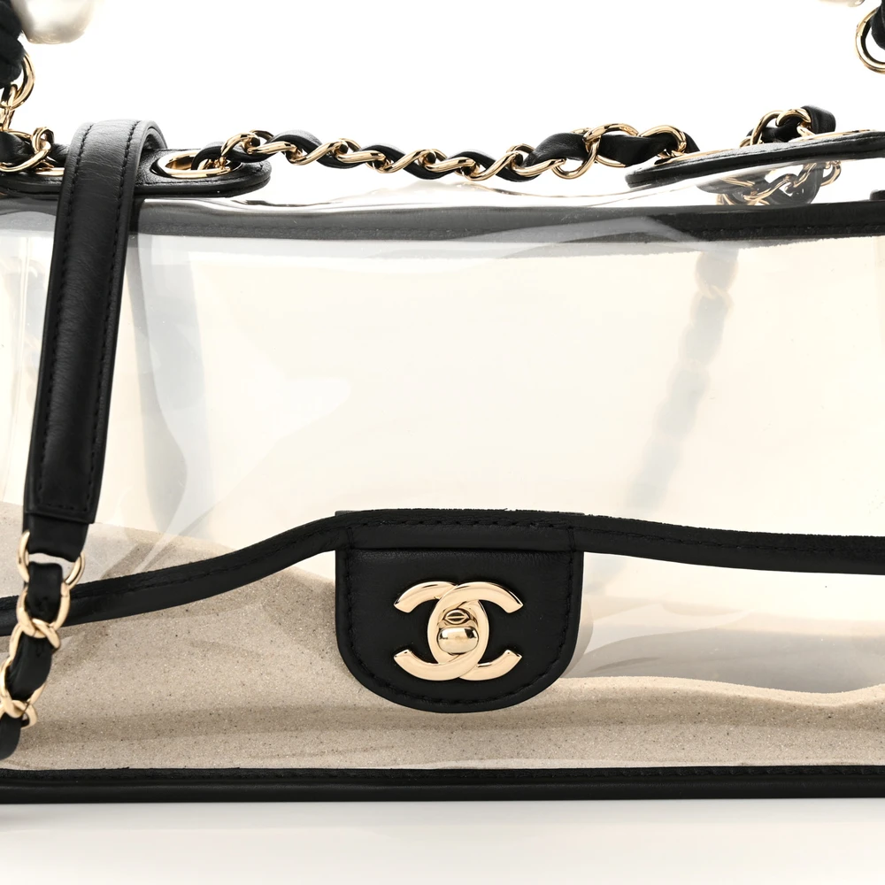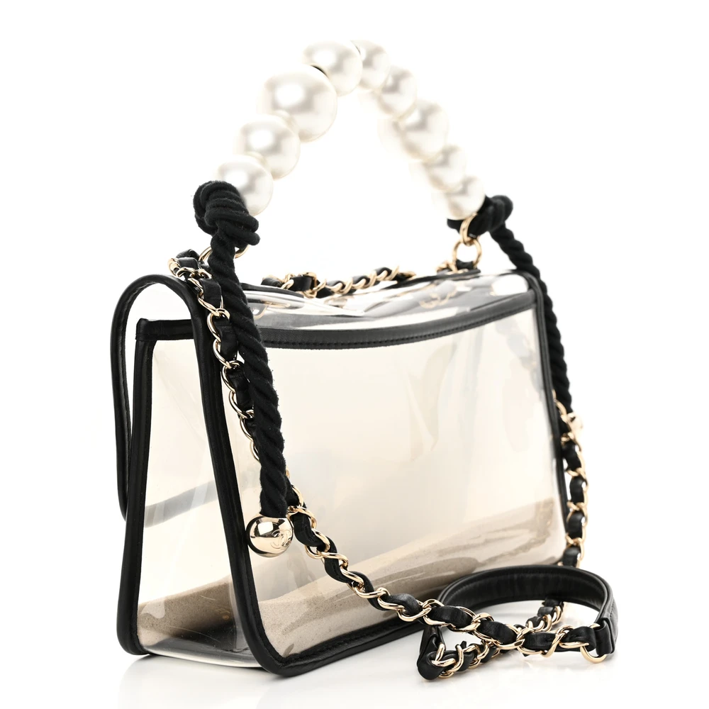 This Chanel Sand By The Sea Flap Small in Black/White is crafted from lambskin leather and PVC with a pearl strap. The light gold hardware adds a luxurious finish. Perfect for summer outings, it offers a modern and chic design. The compact size is ideal for essentials. The pearl strap adds elegance and uniqueness. A must-have for Chanel enthusiasts seeking a standout piece.