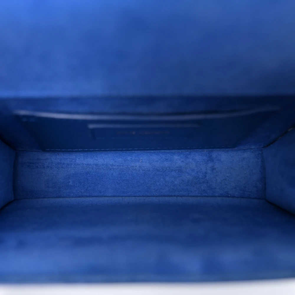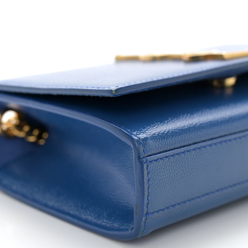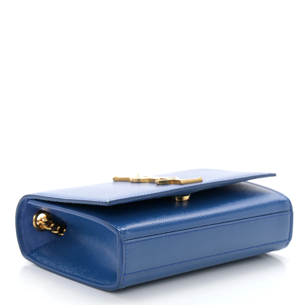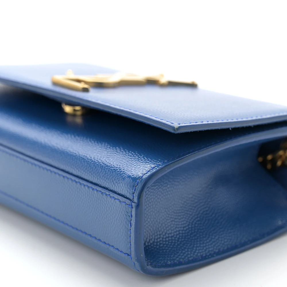 This Saint Laurent Small Kate Satchel in Royal Blue features Monogram Grain De Poudre Leather with gold hardware. Its compact size and bold color make it a standout piece for any wardrobe. The chain strap adds a touch of sophistication, making it ideal for both day and evening use.