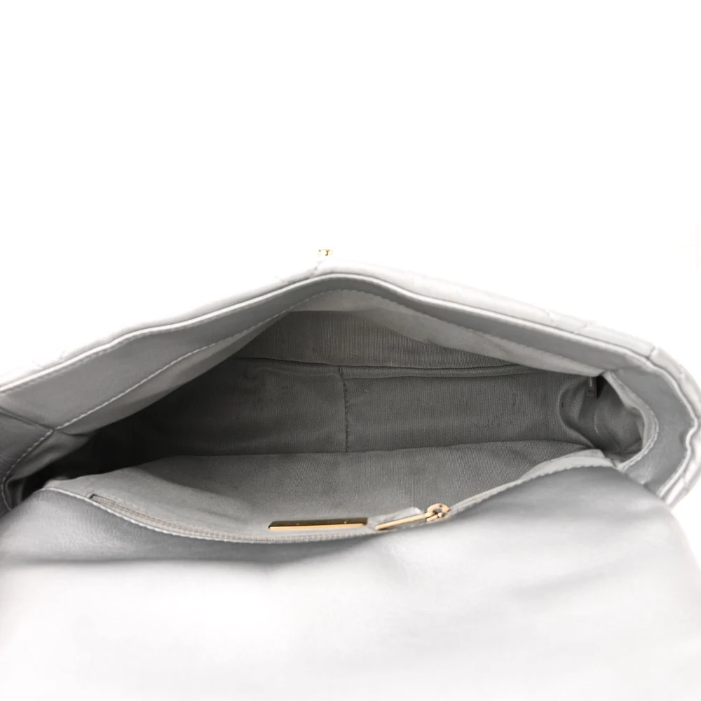 This Chanel Flap Large Chanel 19 in Metallic Silver Quilted Lambskin Leather with Mixed Metal Hardware is a striking and innovative bag. The metallic silver lambskin leather adds a futuristic touch, while the quilted design maintains Chanel’s iconic elegance. Mixed metal hardware enhances its bold aesthetic, perfect for making a statement. Spacious and practical, it’s ideal for both daily wear and special occasions. The oversized CC clasp adds a signature detail. A must-have for those who love standout luxury.