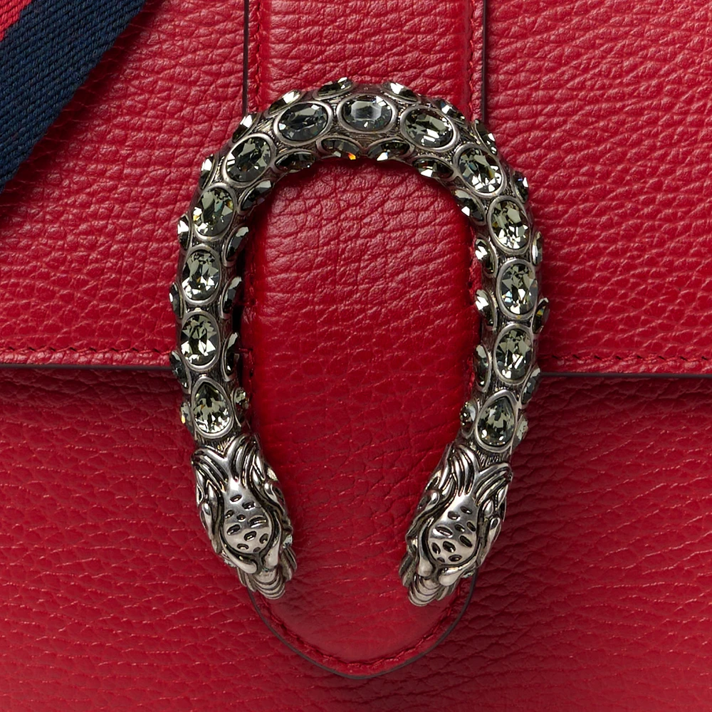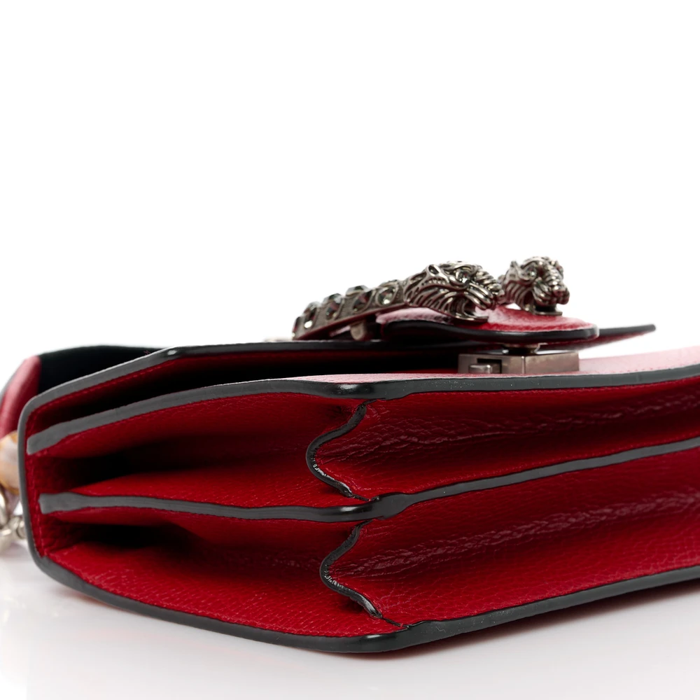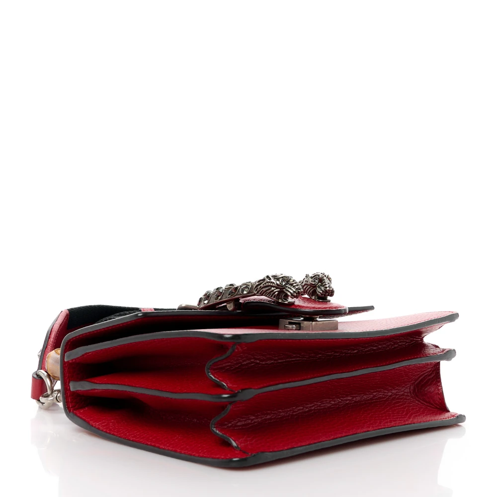 This Gucci Mini Web Dionysus Bamboo Top Handle Bag is crafted in hibiscus red dollar calfskin leather. Crystal details and aged silver hardware elevate its charm. Compact size with a unique bamboo handle. Iconic Dionysus closure adds classic appeal. A stylish accessory with functional versatility.