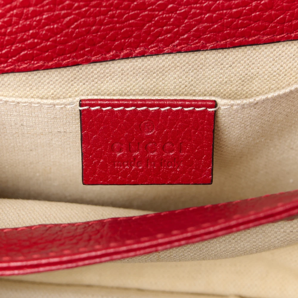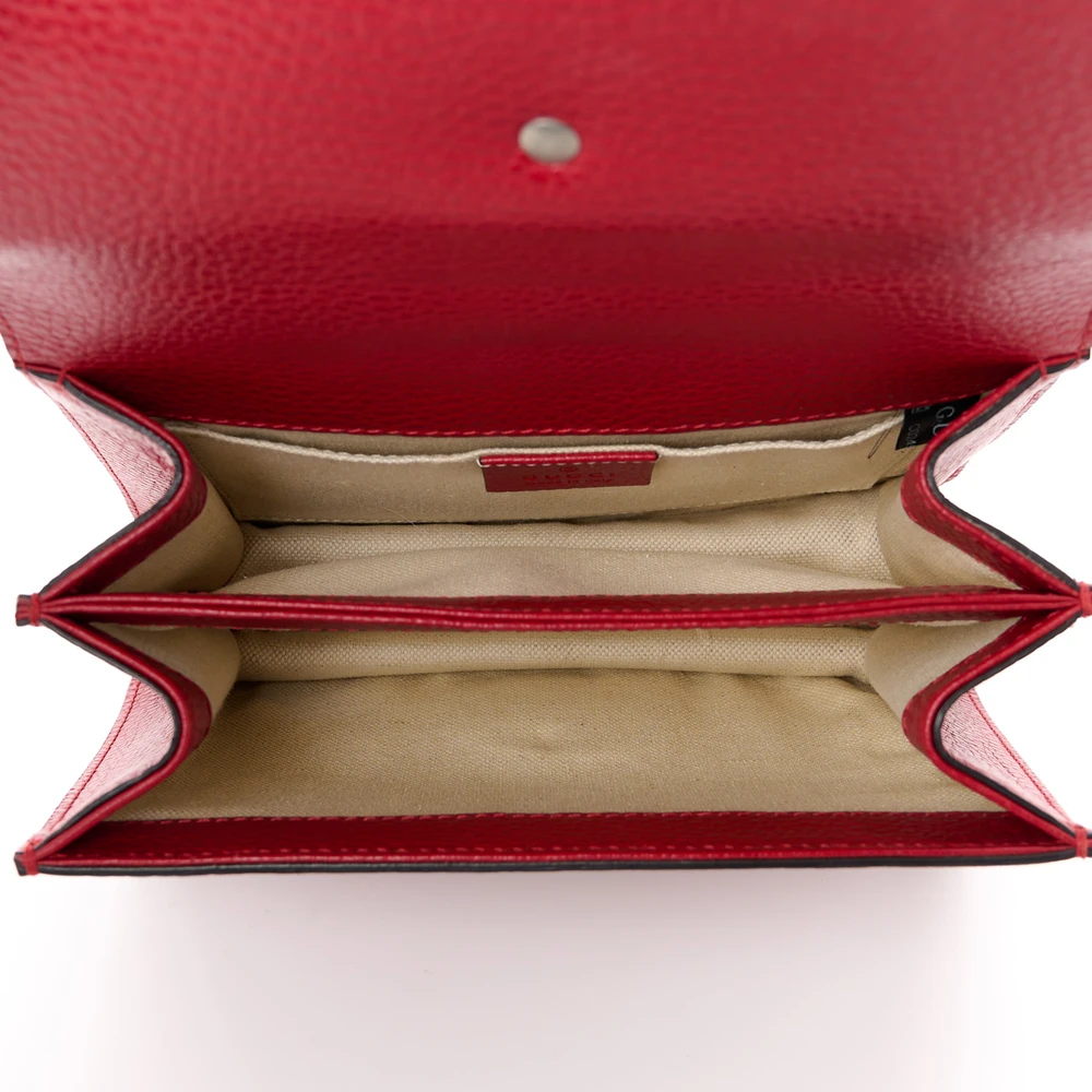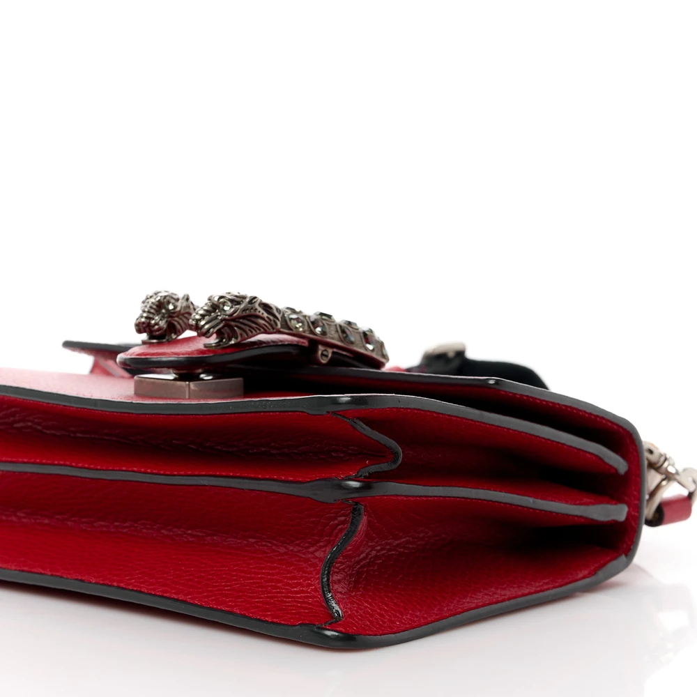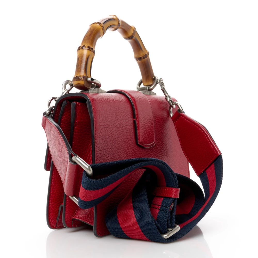 This Gucci Mini Web Dionysus Bamboo Top Handle Bag is crafted in hibiscus red dollar calfskin leather. Crystal details and aged silver hardware elevate its charm. Compact size with a unique bamboo handle. Iconic Dionysus closure adds classic appeal. A stylish accessory with functional versatility.