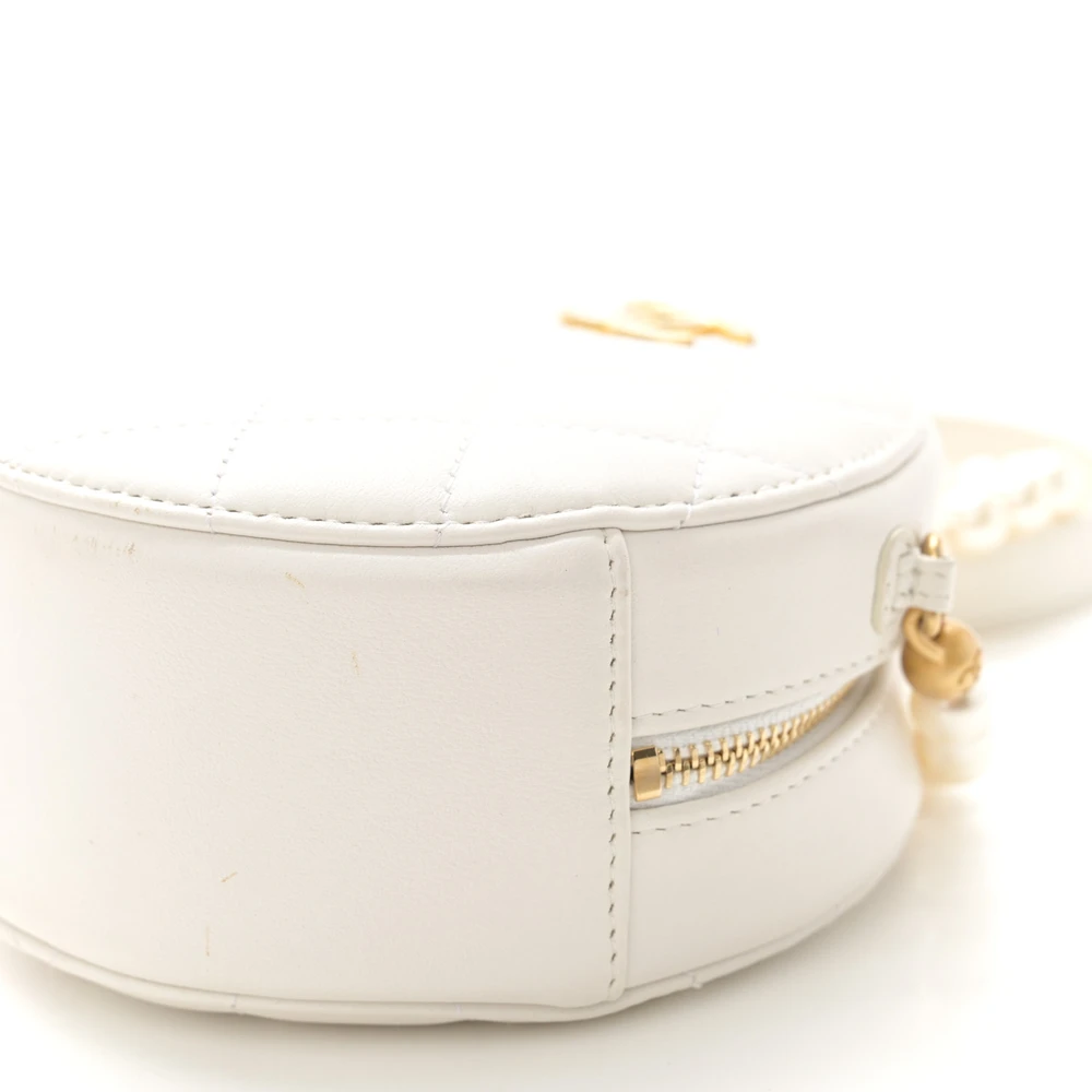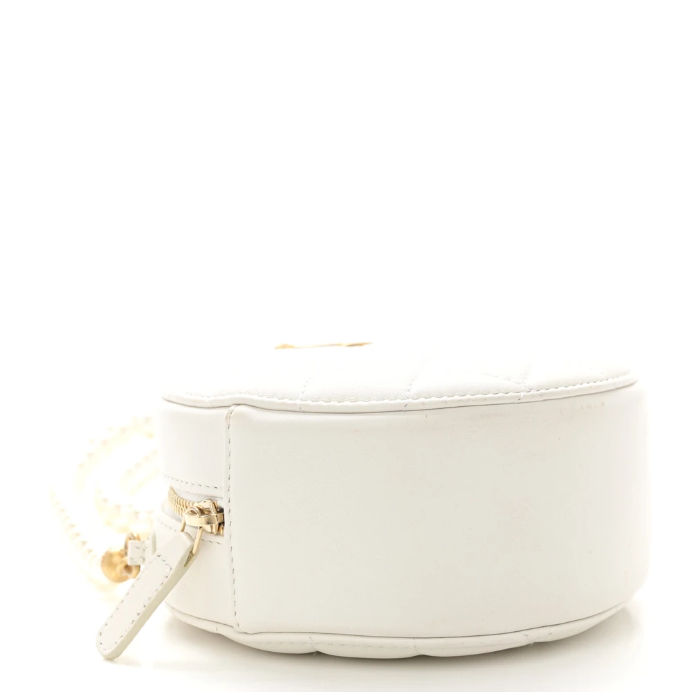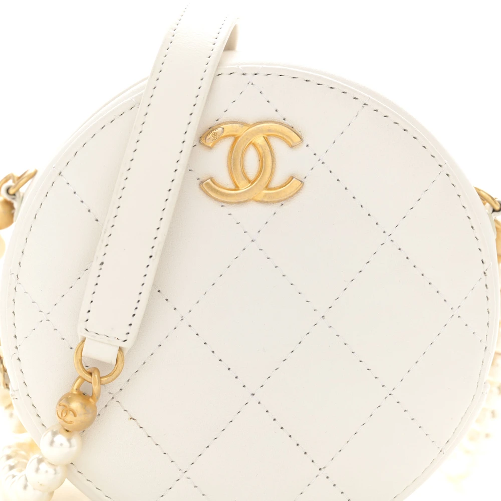This Chanel Pearl Round Clutch With Chain Mini in White Quilted Calfskin Leather is an epitome of elegance. Featuring gold hardware, the round silhouette is adorned with a touch of modern sophistication. The quilted pattern showcases Chanel’s signature craftsmanship. Perfect for special occasions, it can be carried crossbody or by the chain. Compact yet spacious for essentials, this clutch is a refined statement piece. A luxurious must-have for your collection.