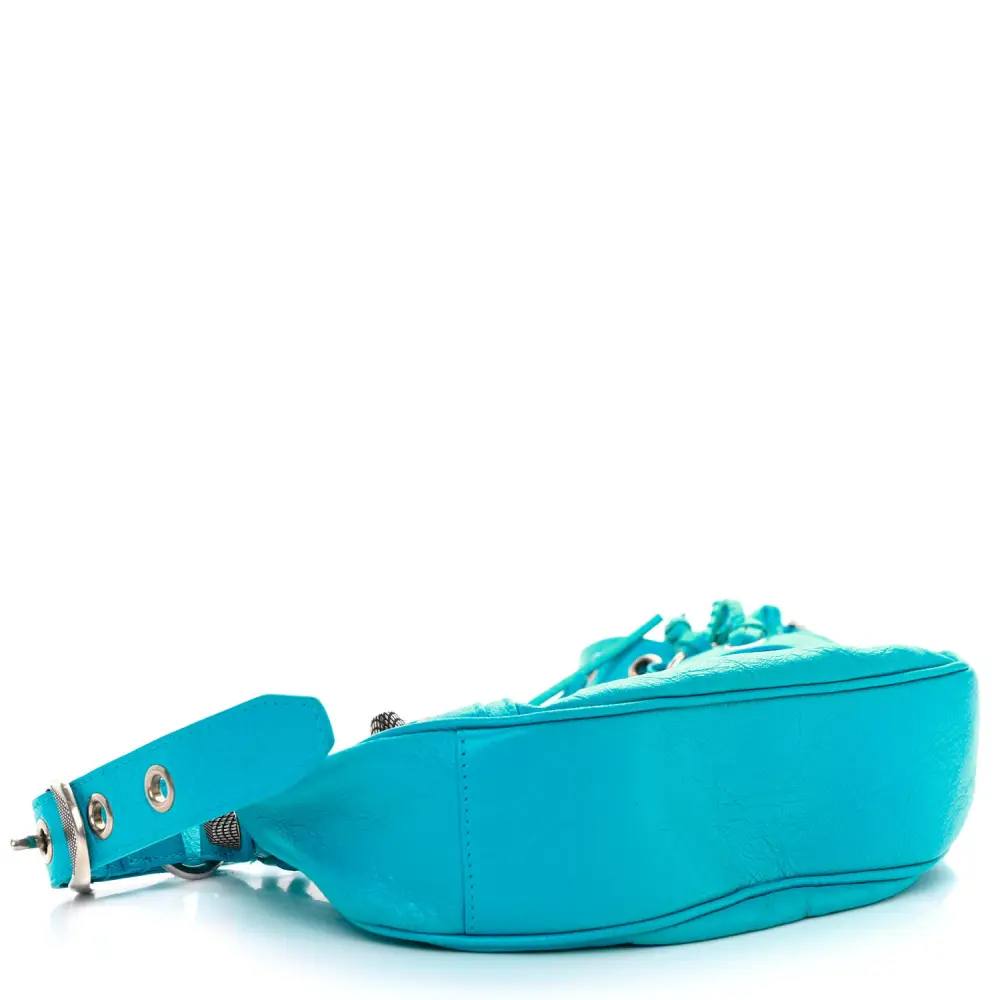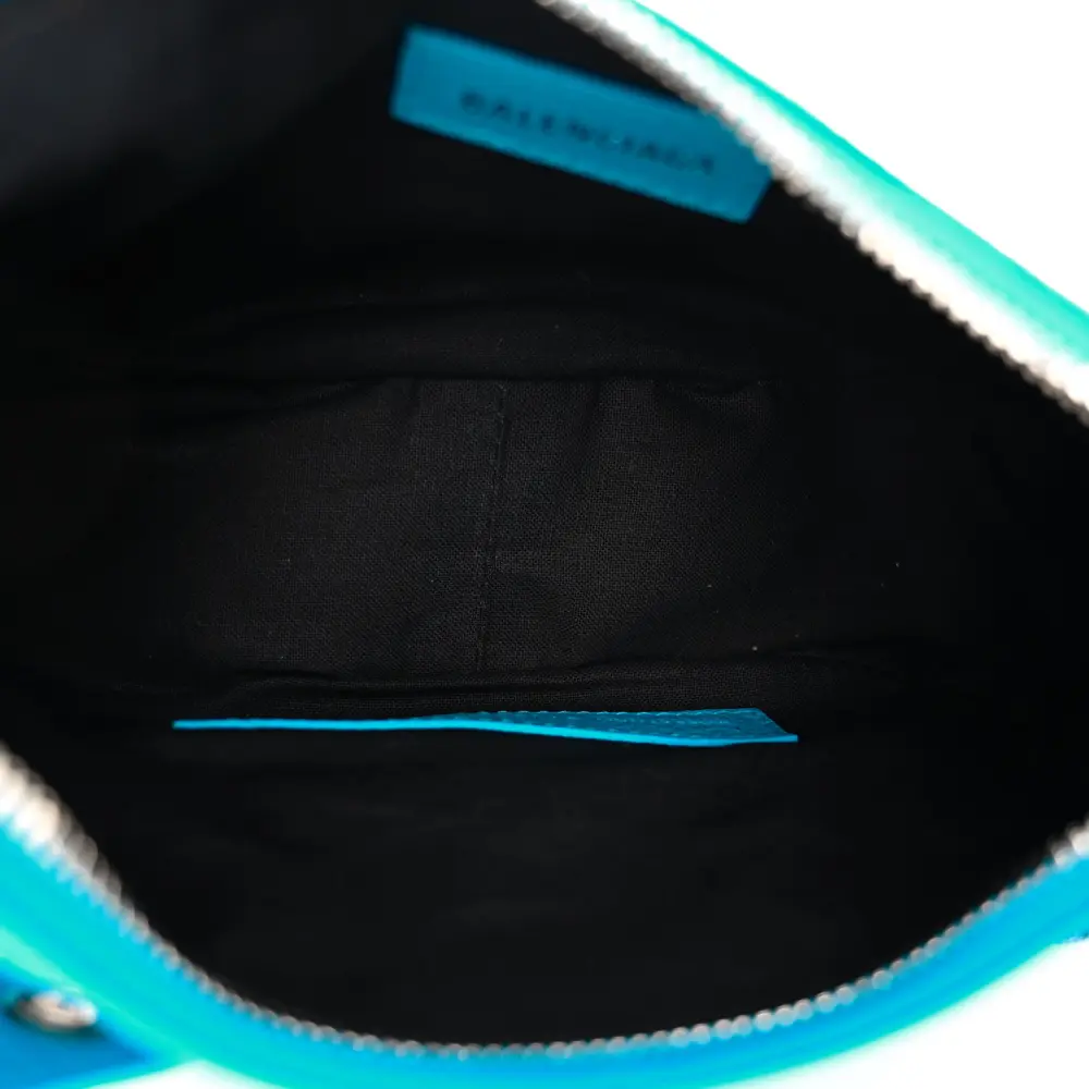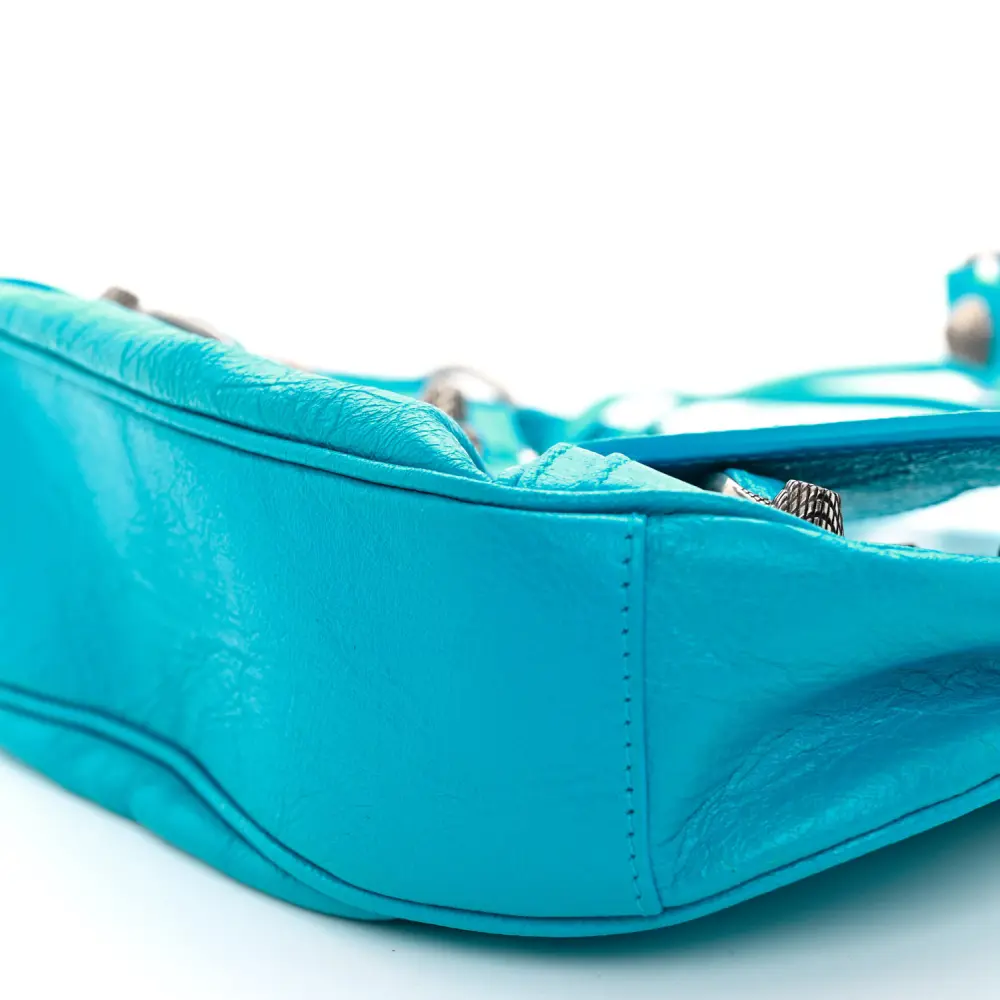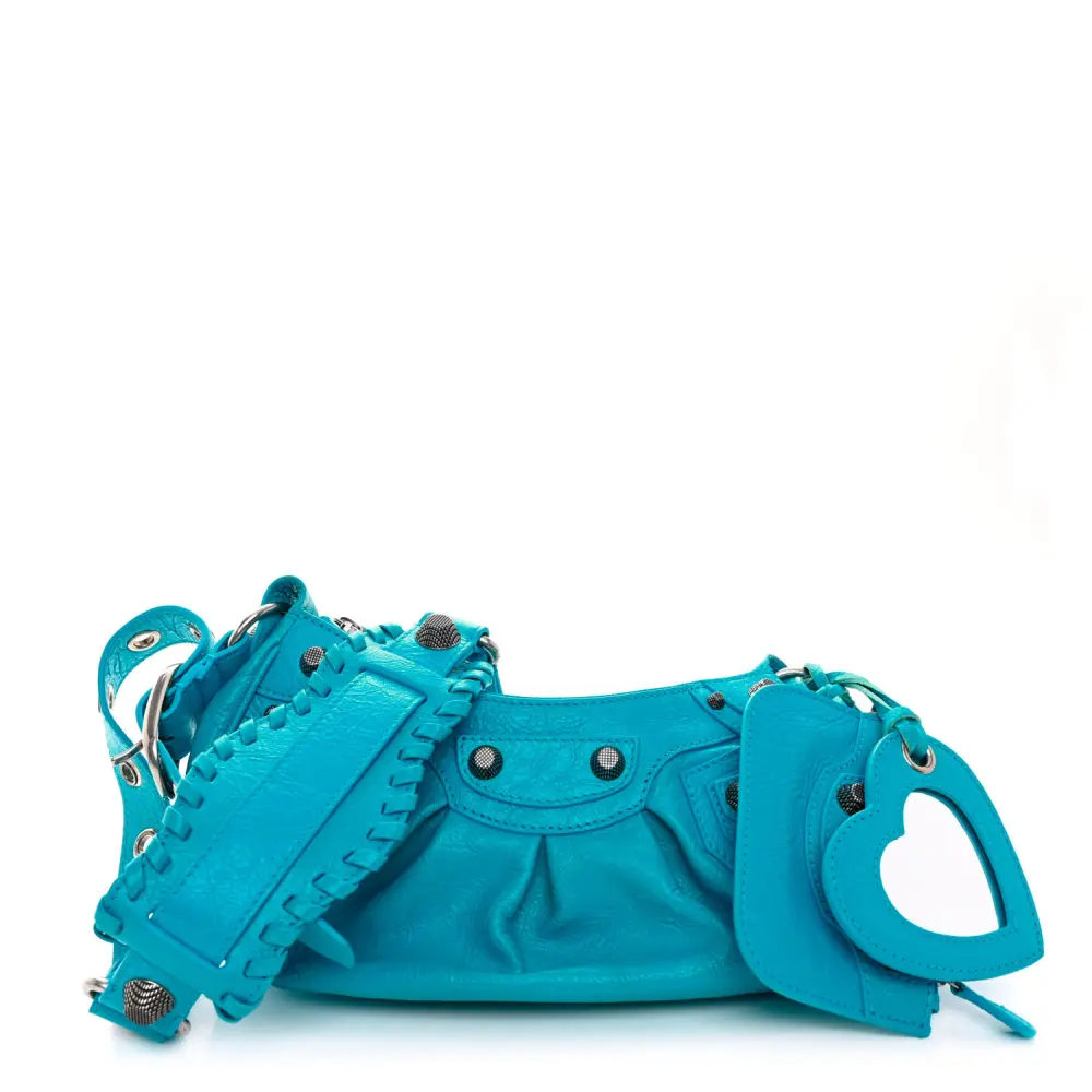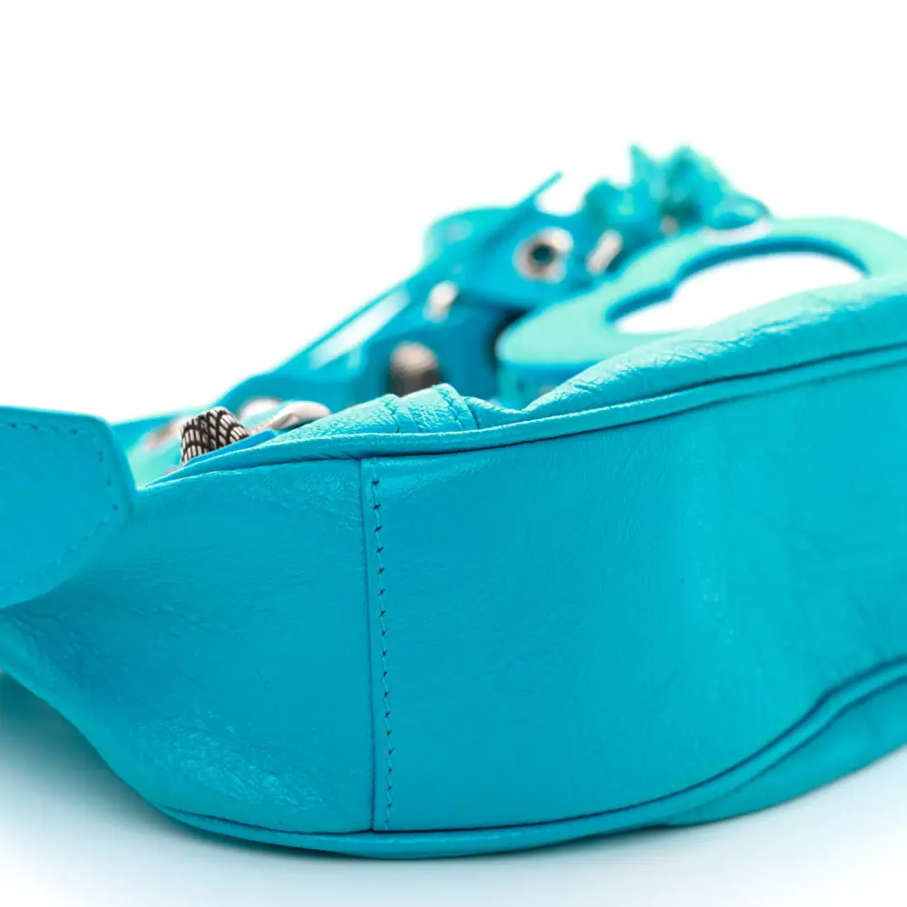 This Balenciaga XS Le Cagole Shoulder Bag in Cyan is crafted from Agneau Arena leather for a soft and luxurious feel. Silver hardware and stud detailing add edgy flair to its design. Compact and functional, it’s ideal for everyday essentials. The adjustable strap offers versatile wear, making it a chic choice for day-to-night transitions.
