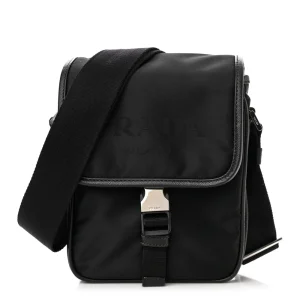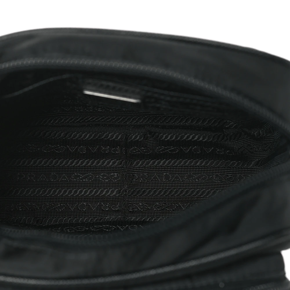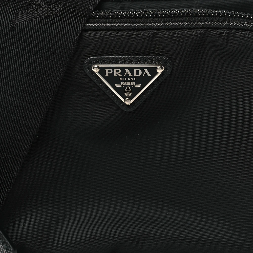 This Prada Medium Brique Crossbody Messenger Bag in Black combines Tessuto nylon and Saffiano leather. Silver hardware adds a sleek and modern look. Adjustable strap ensures versatile carrying options. Spacious compartments provide practical storage. Perfect for work or casual settings. A durable and stylish bag.