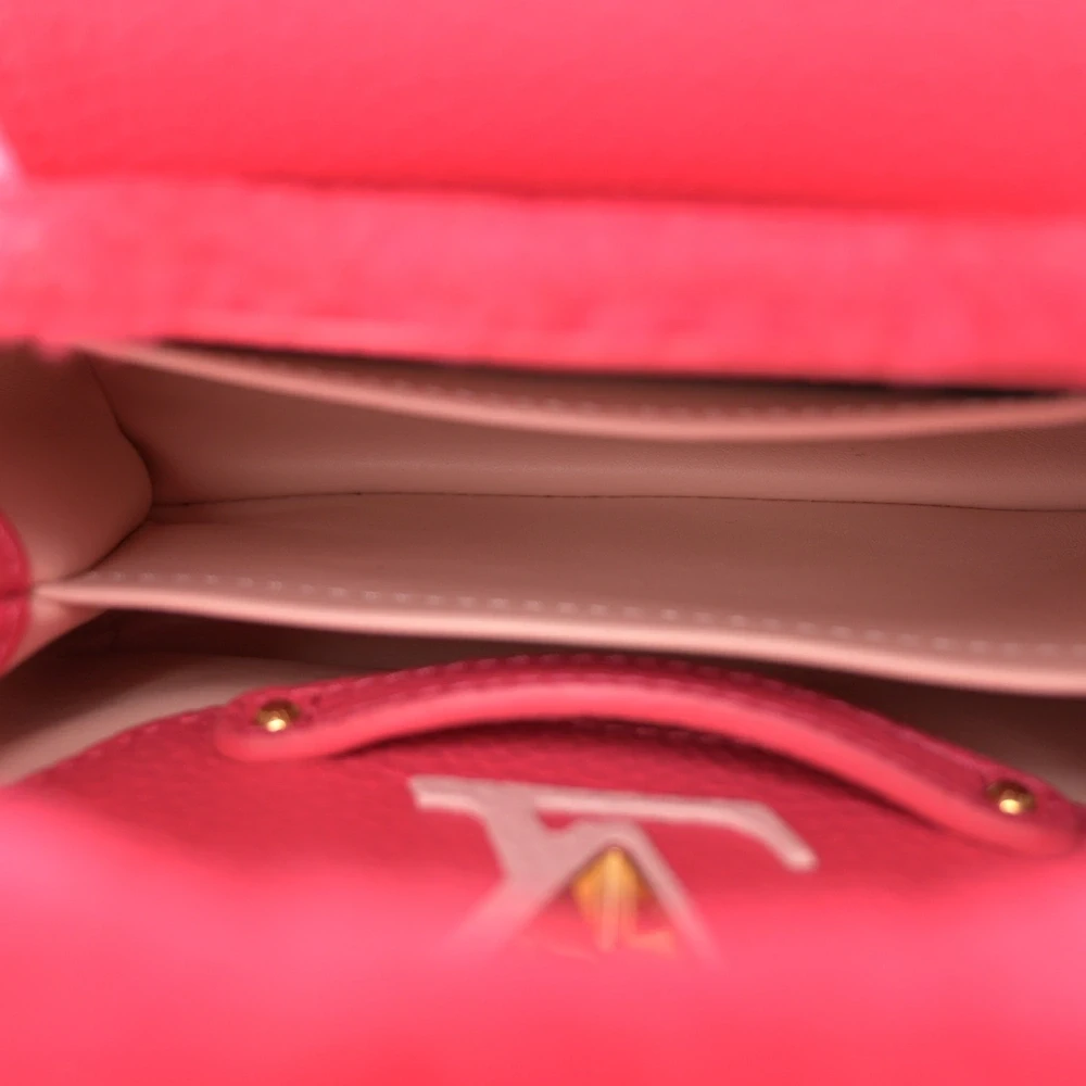 This Louis Vuitton Mini Capucines Pink Shearling & Calfskin Leather Rose Gold Hardware is a delicate and luxurious accessory that elevates any outfit. The combination of soft shearling and calfskin leather offers both style and comfort, while the rose gold hardware adds a touch of elegance. The mini size makes it perfect for carrying essentials, and the top handle provides a refined carry option. A timeless piece for those who appreciate luxury in every detail.