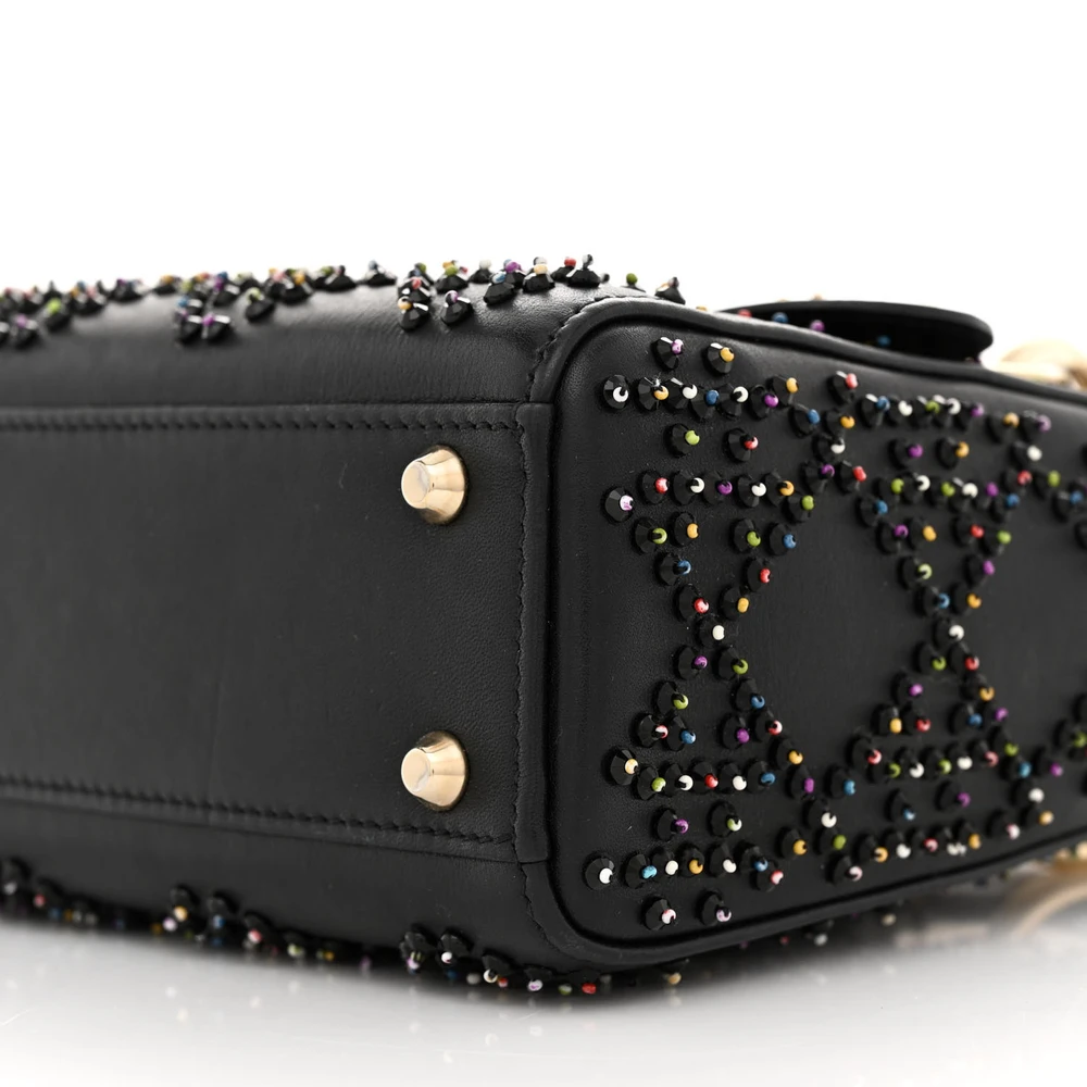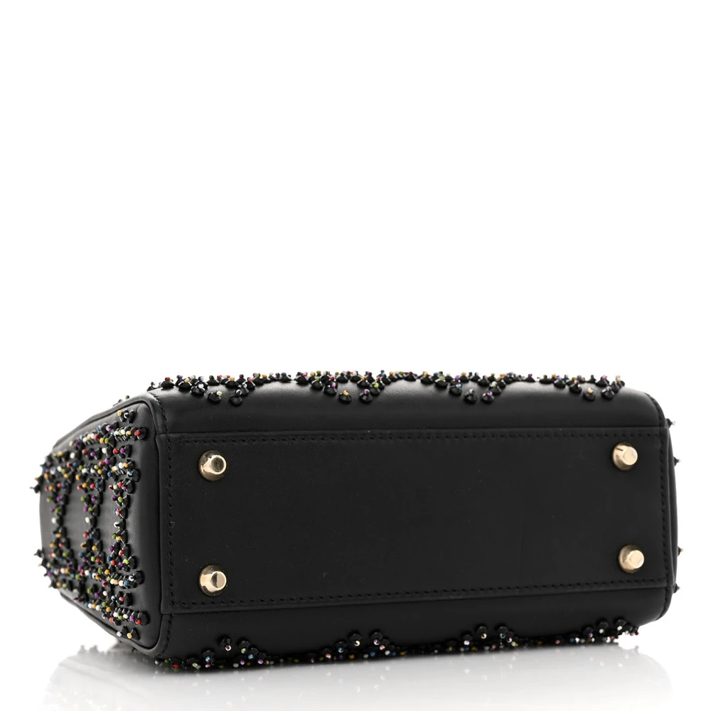 This Dior Mini Lady Dior in Black Beaded Embroidery Cannage Lambskin Leather is a dazzling and luxurious accessory. Gold hardware enhances its intricate design, perfect for exclusive events. A collector’s piece for those who appreciate fine artistry.