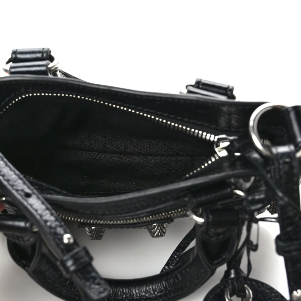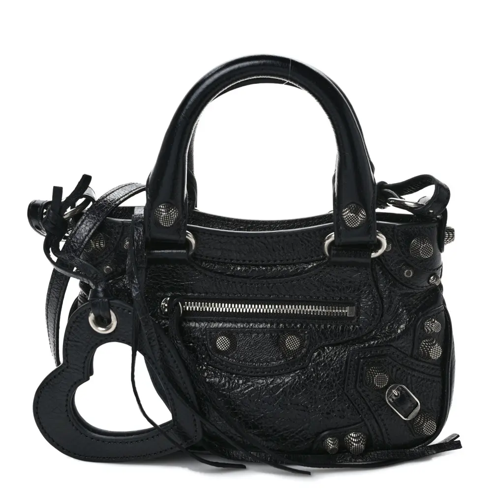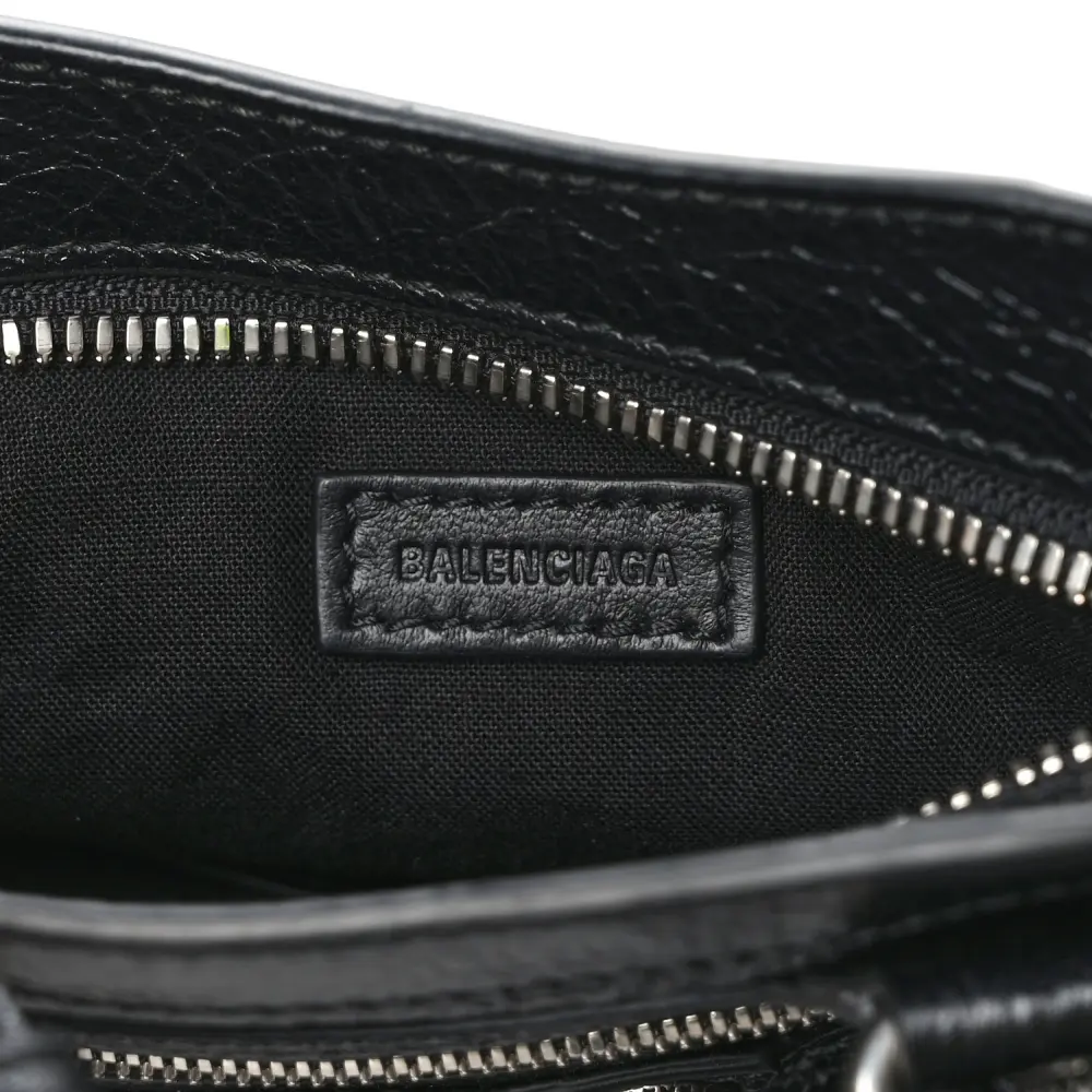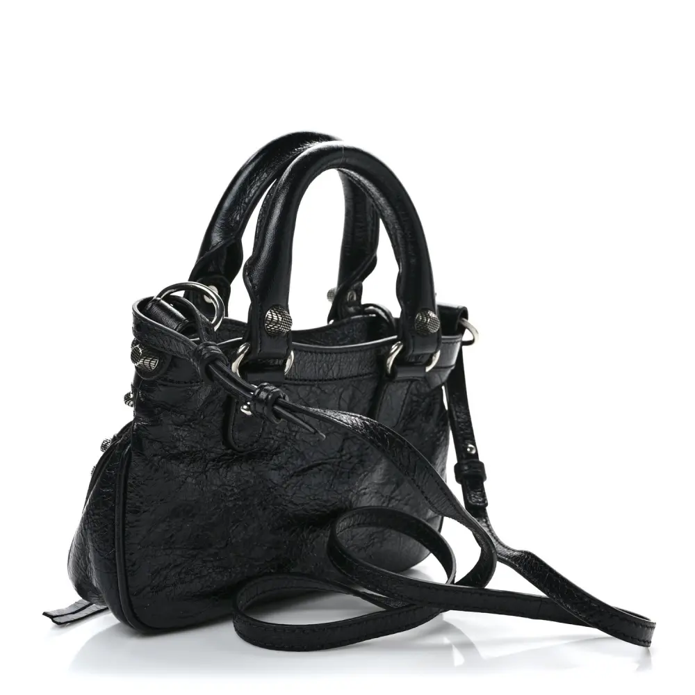 This Balenciaga Mini Neo Cagole Handbag in Black is made from Agneau Arena leather for a textured and edgy look. Silver hardware and signature stud accents enhance its bold aesthetic. Compact yet spacious, it’s perfect for carrying essentials in style. The detachable strap allows for versatile wear. A must-have for fans of contemporary accessories.