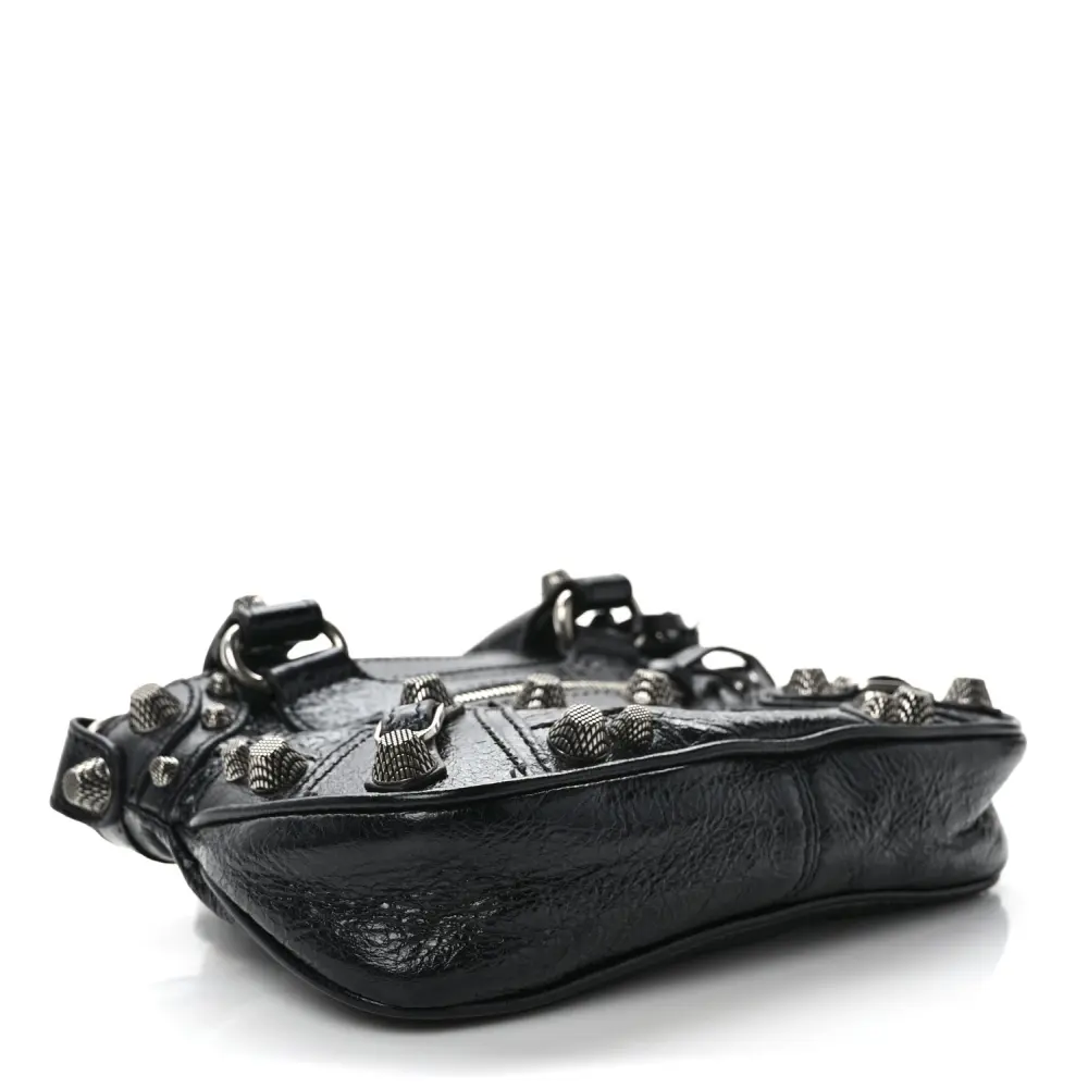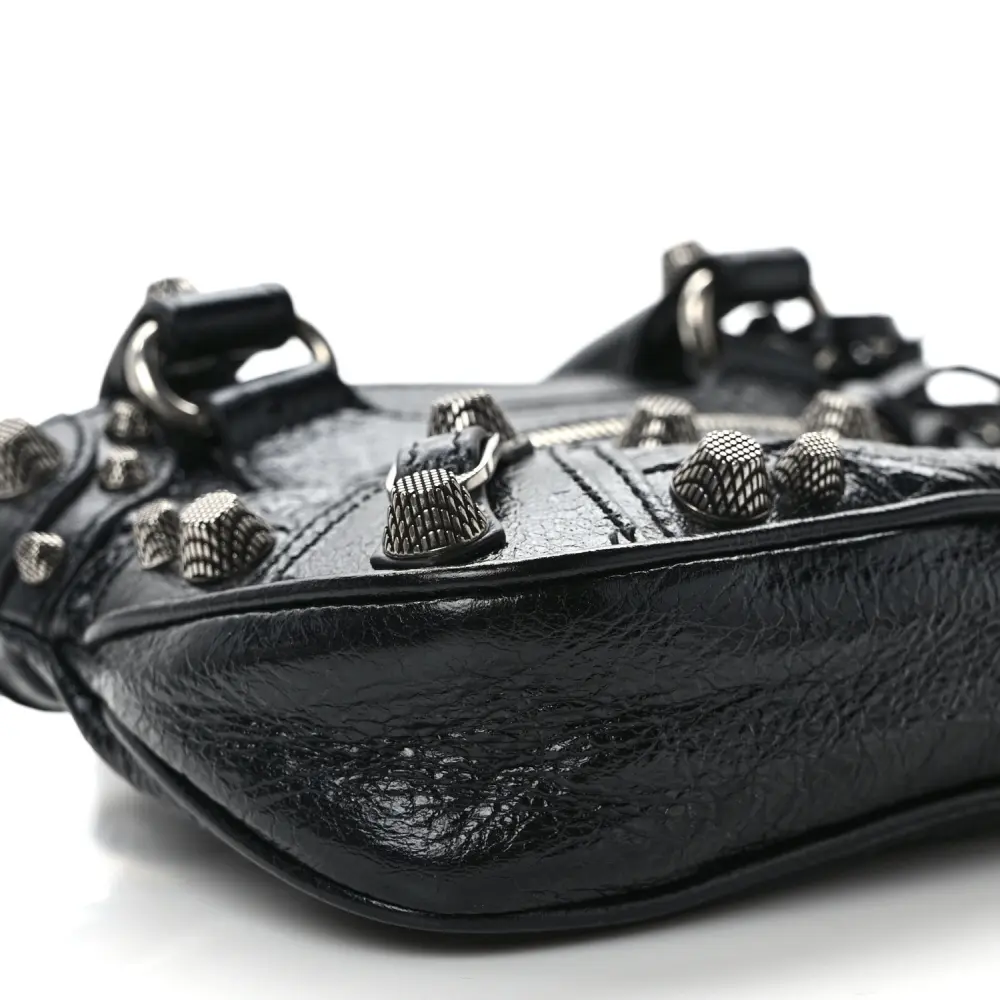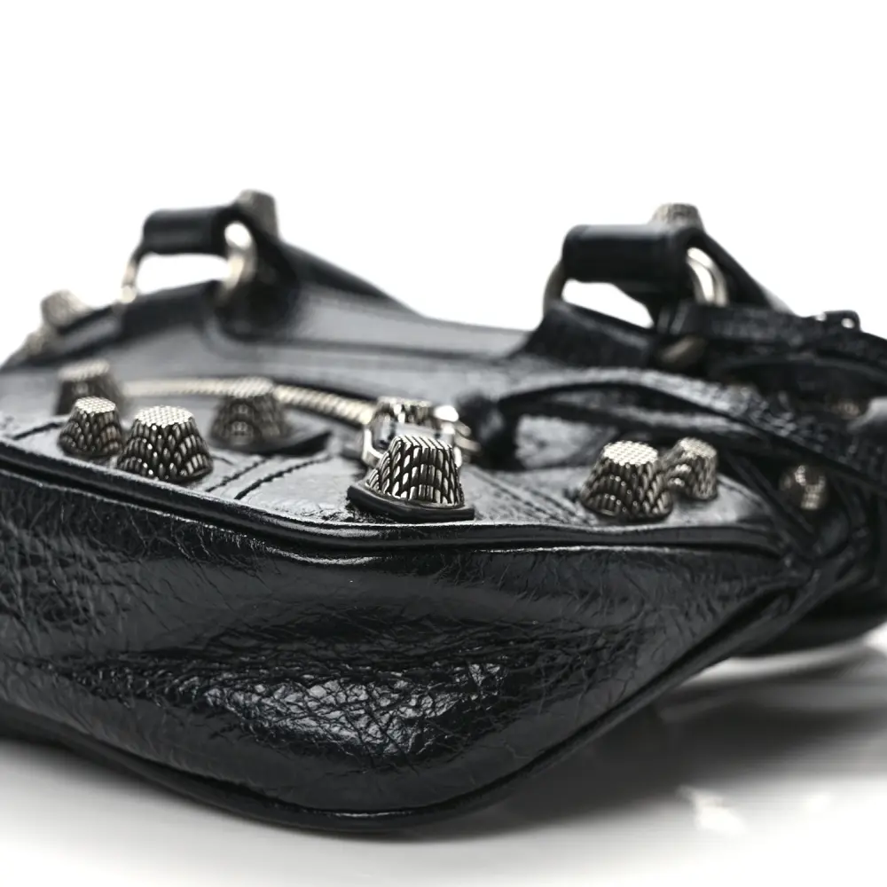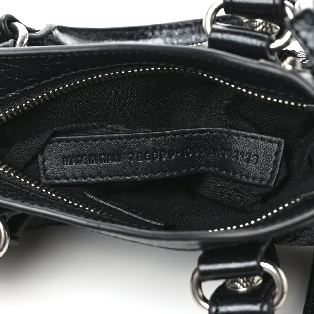 This Balenciaga Mini Neo Cagole Handbag in Black is made from Agneau Arena leather for a textured and edgy look. Silver hardware and signature stud accents enhance its bold aesthetic. Compact yet spacious, it’s perfect for carrying essentials in style. The detachable strap allows for versatile wear. A must-have for fans of contemporary accessories.