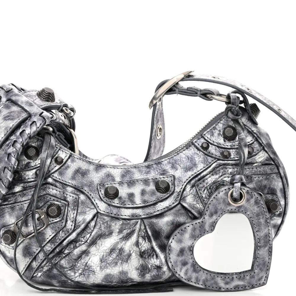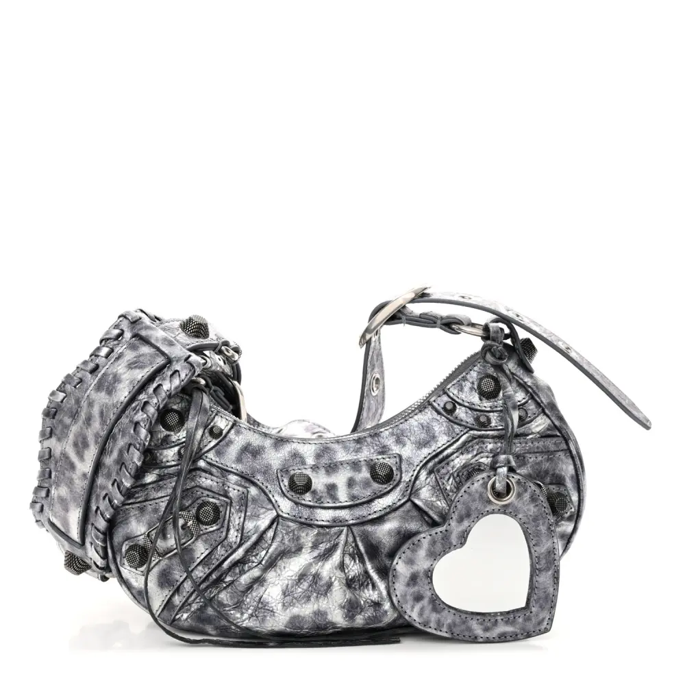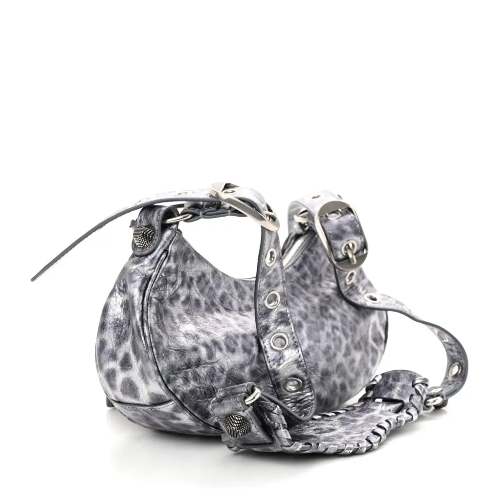 This Balenciaga XS Le Cagole Shoulder Bag in Metallic Dark Grey combines Agneau Arena leather with leopard accents for a bold and edgy design. Silver hardware and stud detailing add to its unique appeal. The compact silhouette is ideal for carrying essentials while making a style statement. Adjustable straps offer versatility, making it perfect for day or night wear. A daring addition to elevate your accessory collection.