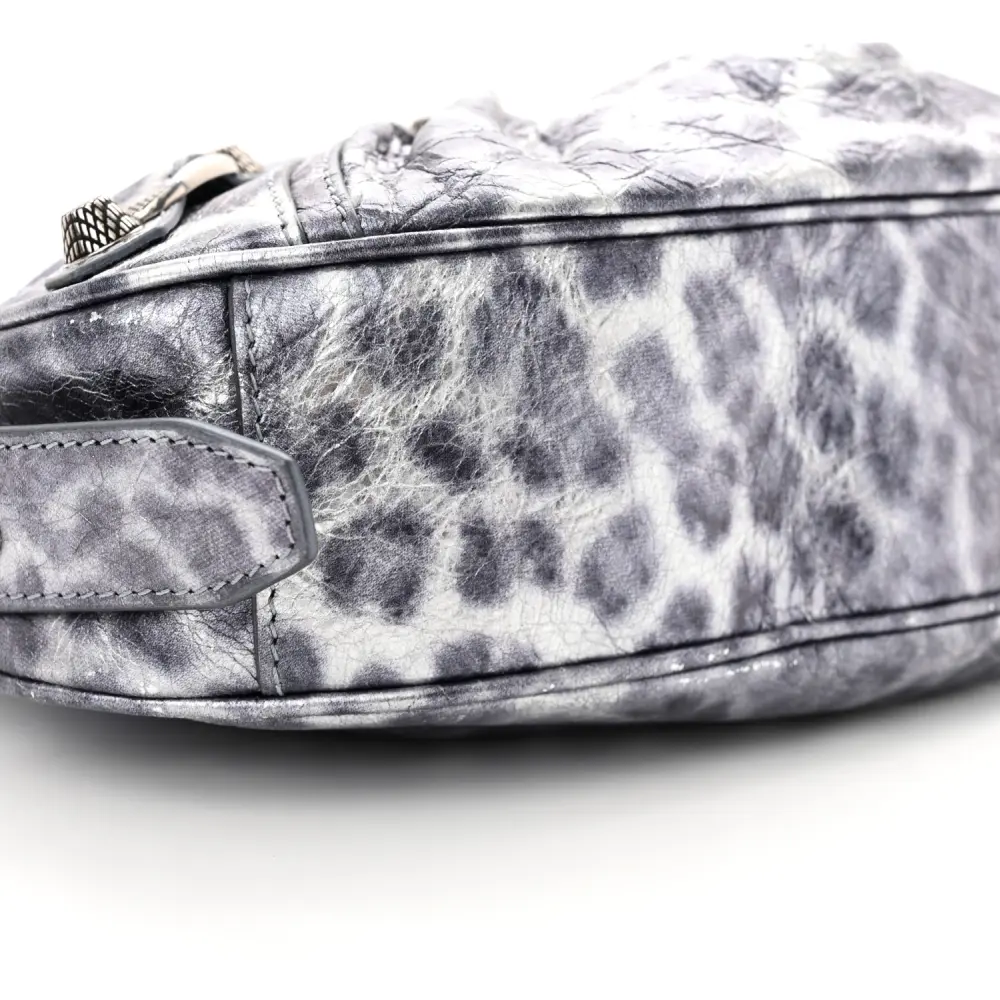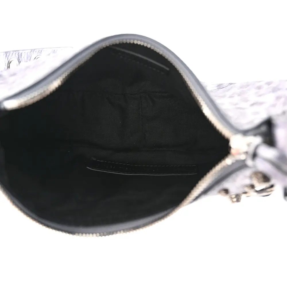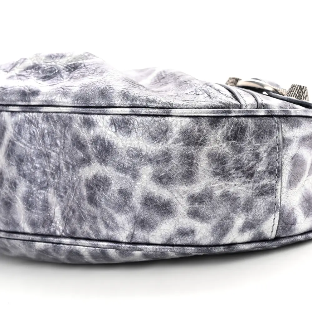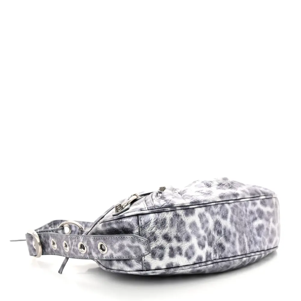 This Balenciaga XS Le Cagole Shoulder Bag in Metallic Dark Grey combines Agneau Arena leather with leopard accents for a bold and edgy design. Silver hardware and stud detailing add to its unique appeal. The compact silhouette is ideal for carrying essentials while making a style statement. Adjustable straps offer versatility, making it perfect for day or night wear. A daring addition to elevate your accessory collection.