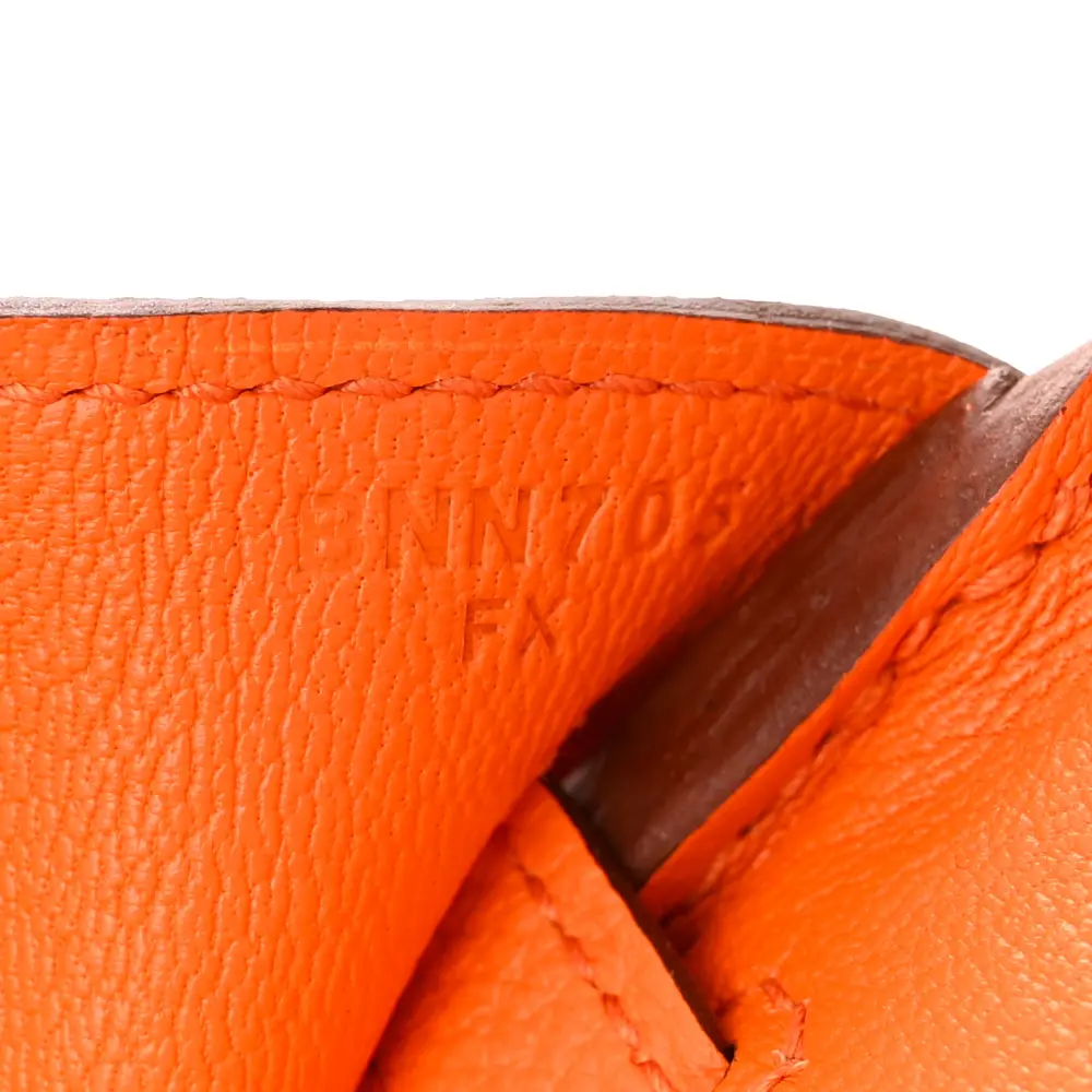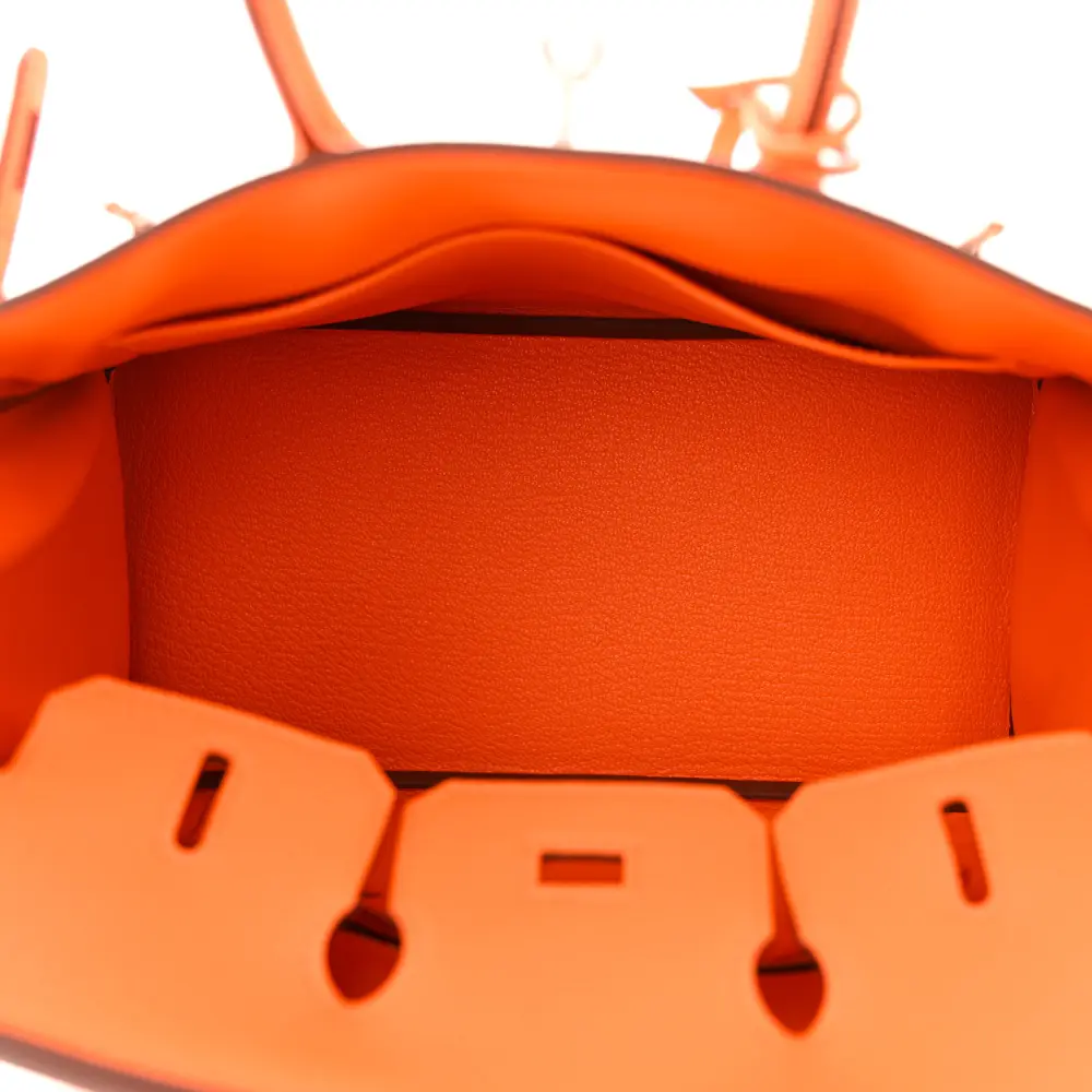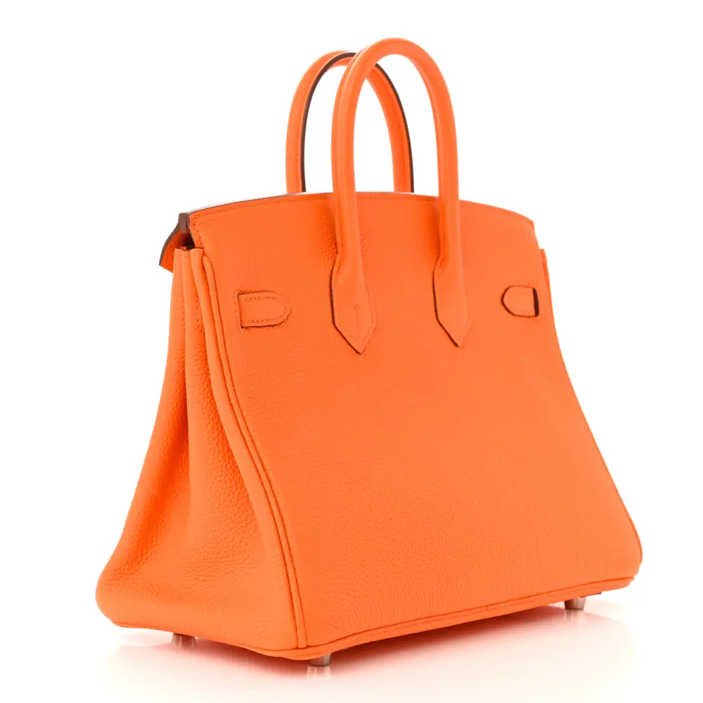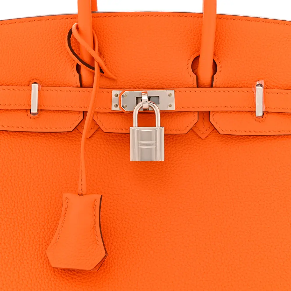 This Hermès Birkin 25 in Orange Minium Togo leather is a vibrant take on a classic design. The silver hardware provides a modern contrast to the bold orange hue. Dual top handles and a spacious interior make it functional and stylish. Crafted from durable Togo leather, it ensures longevity and elegance. Secured with the iconic Hermès turn-lock closure, it exudes sophistication. A must-have for any luxury bag enthusiast.