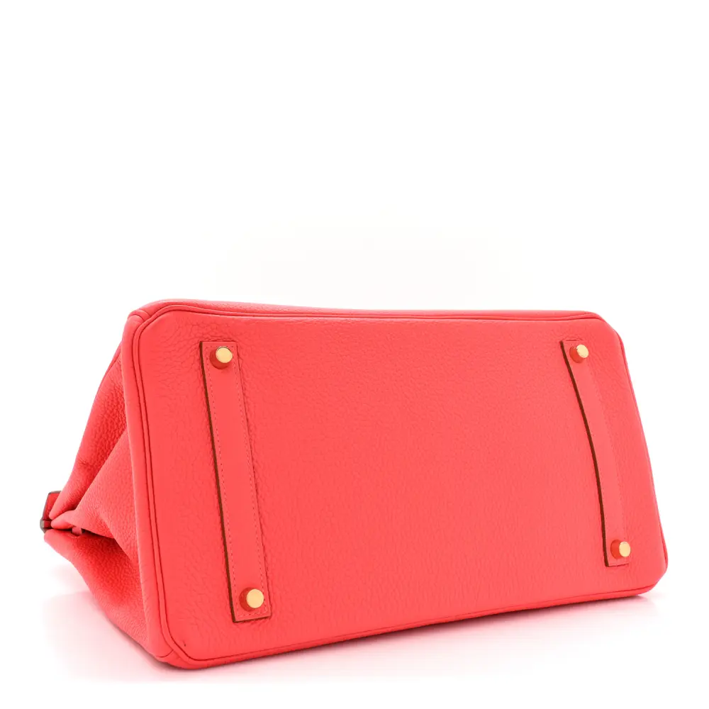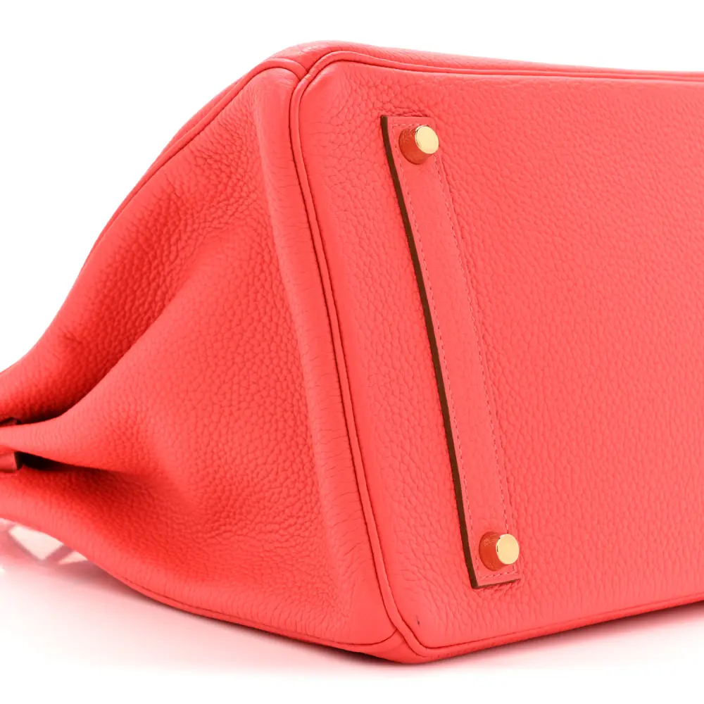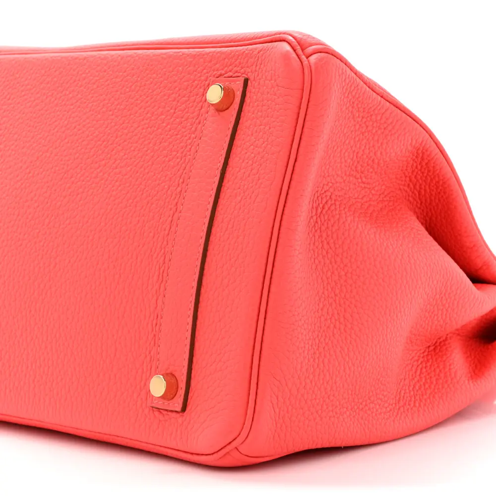 This Hermès Birkin 35 in Rose Jaipur Taurillon Clemence Leather is a vibrant classic. The rich pink hue is complemented by gold hardware for a luxurious touch. Its spacious interior accommodates daily essentials with ease. Durable leather ensures longevity while maintaining a soft feel. A statement piece that transitions from day to night effortlessly. A must-have for Birkin enthusiasts.