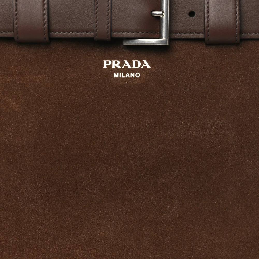 This Prada Large Double Belt Tote in Cacao is crafted from Scamosciato suede leather. Spacious and structured, it’s perfect for work or travel. The double belt detail adds a unique touch. Sturdy handles ensure easy carrying. A luxurious and practical accessory. Ideal for elevating everyday looks.