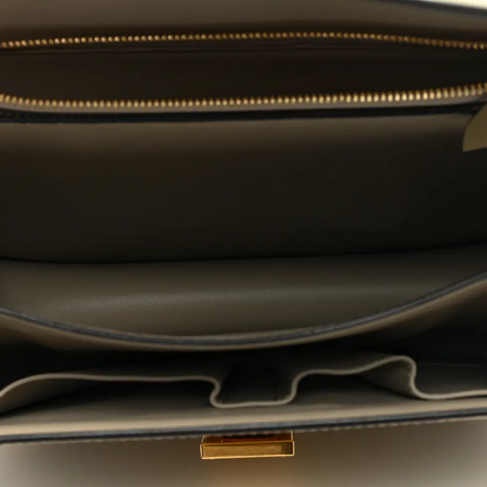 This Celine Medium Classic Box Flap Bag in Quartz is crafted from spazzolato calfskin leather with gold hardware. Its structured design offers understated elegance. Spacious yet compact, it fits essentials securely with a flap closure. A polished choice for any occasion.