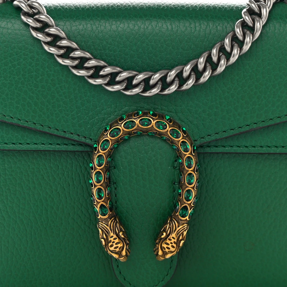 This Gucci Mini Dionysus Shoulder Bag comes in emerald calfskin leather. Aged silver hardware adds a refined touch. Compact design is ideal for carrying essentials. Iconic Dionysus closure enhances its classic appeal. Perfect for both casual and formal occasions. A luxurious statement piece.