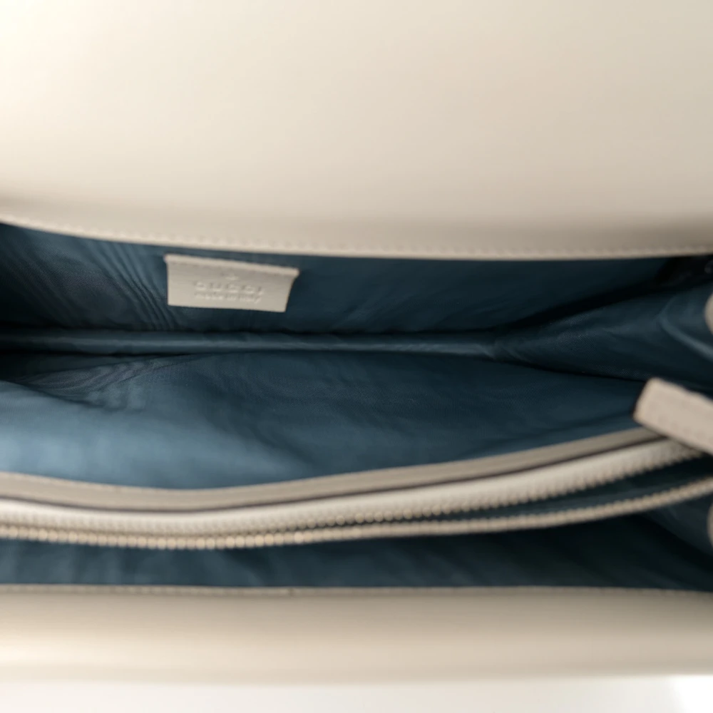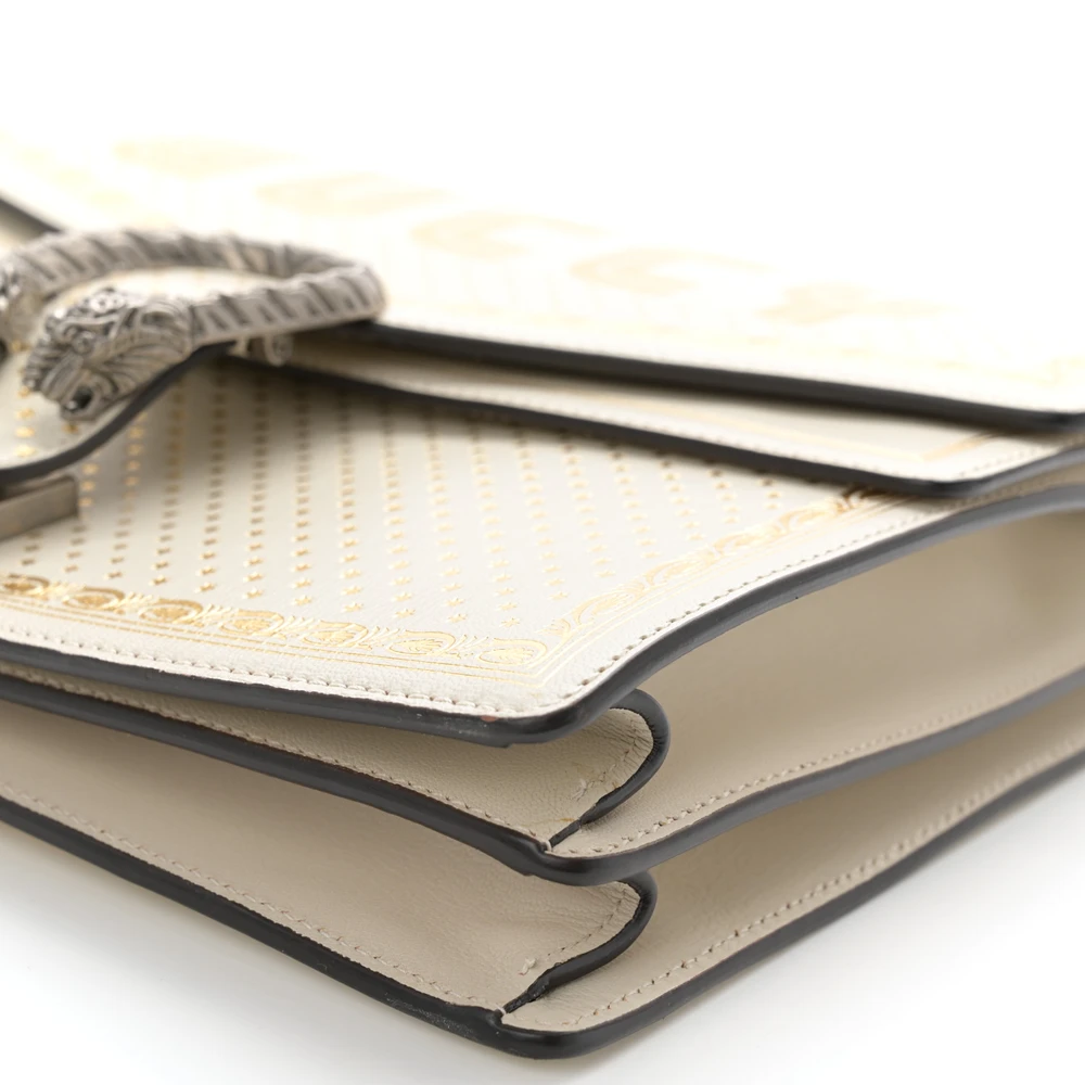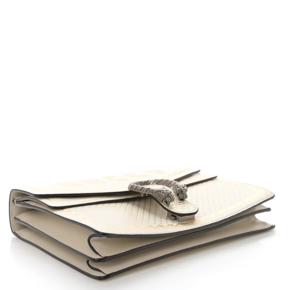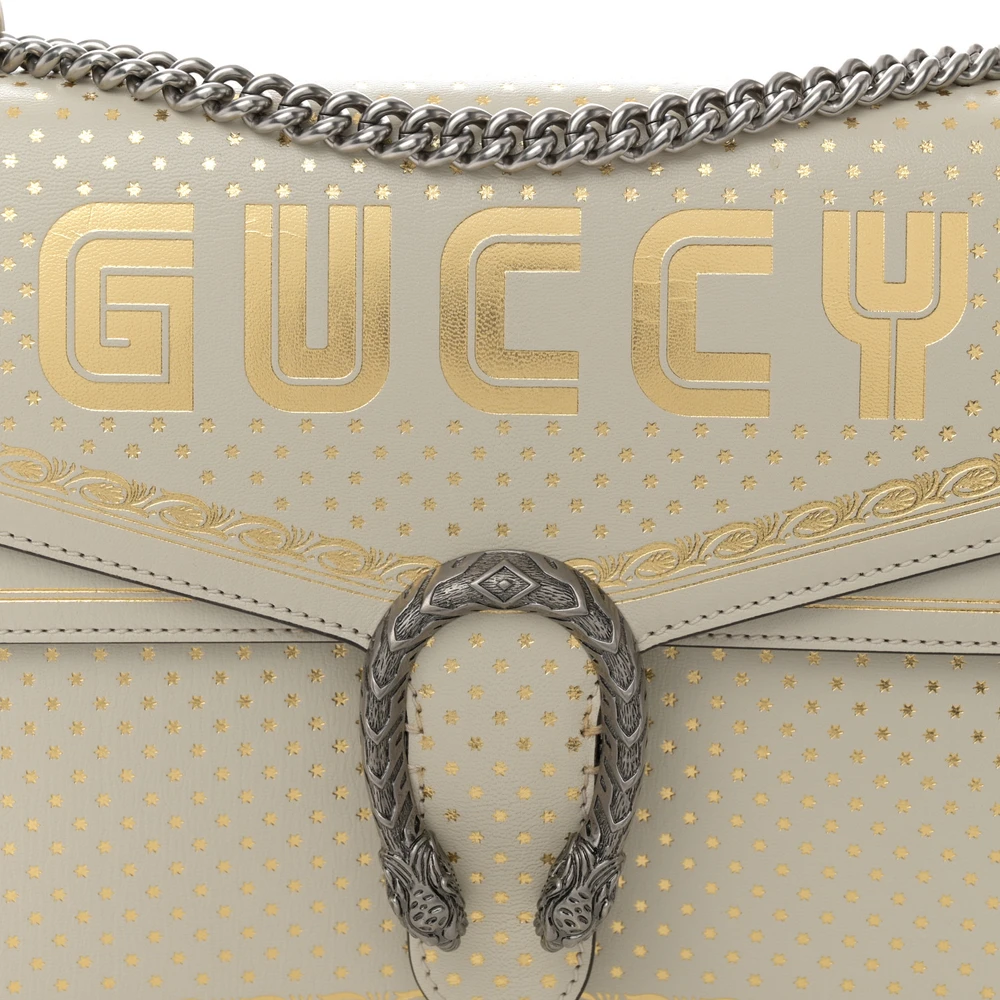 This Gucci x Sega Medium Guccy Stars Dionysus Shoulder Bag combines mystic white and gold calfskin leather. Aged silver hardware creates a vintage-inspired look. Star detailing adds playful charm to the structured design. Perfectly sized for carrying daily essentials. Adjustable strap ensures comfortable wear. A unique piece for fashion-forward individuals.