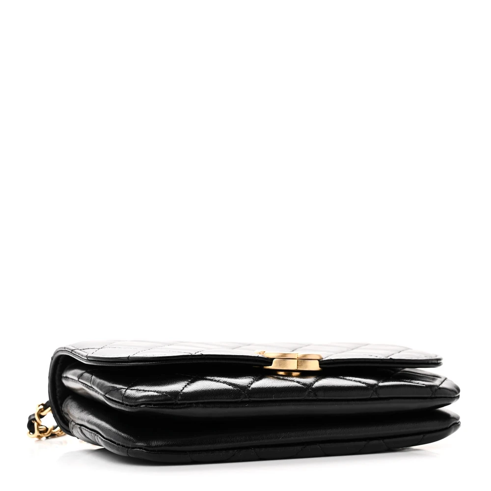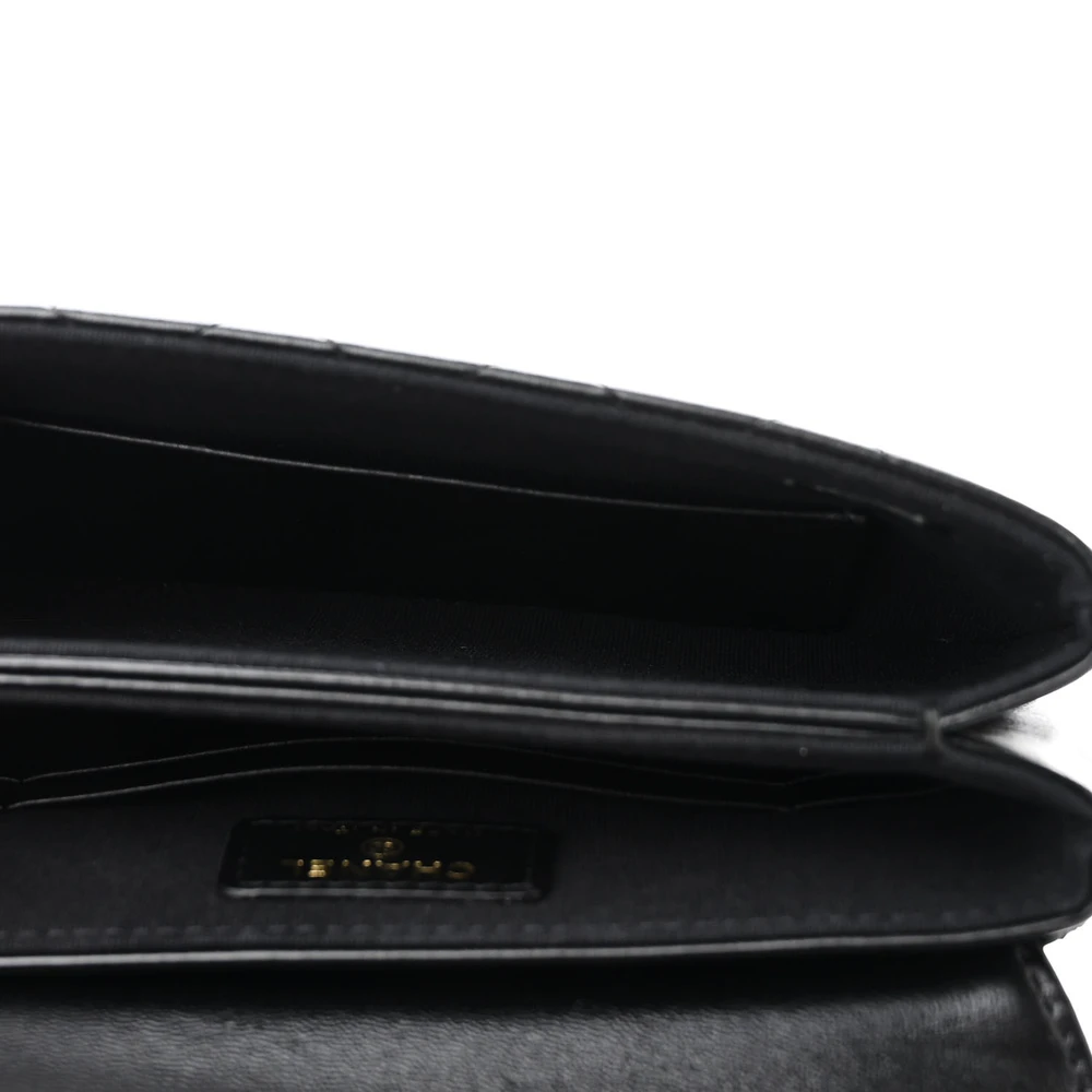 This Chanel Flap Phone Holder With Chain Small in Black Quilted Shiny Lambskin Leather with Gold Hardware is a chic and practical accessory. The shiny lambskin leather and gold hardware create a luxurious appeal. Compact yet functional, it’s ideal for carrying a phone and small items. The chain strap offers hands-free convenience. Its quilted design highlights Chanel’s iconic craftsmanship. A versatile piece for everyday elegance.