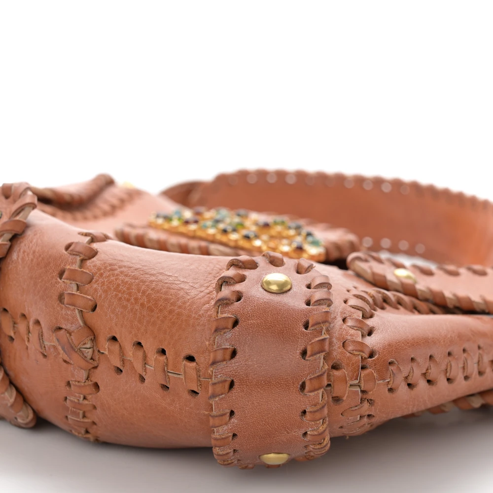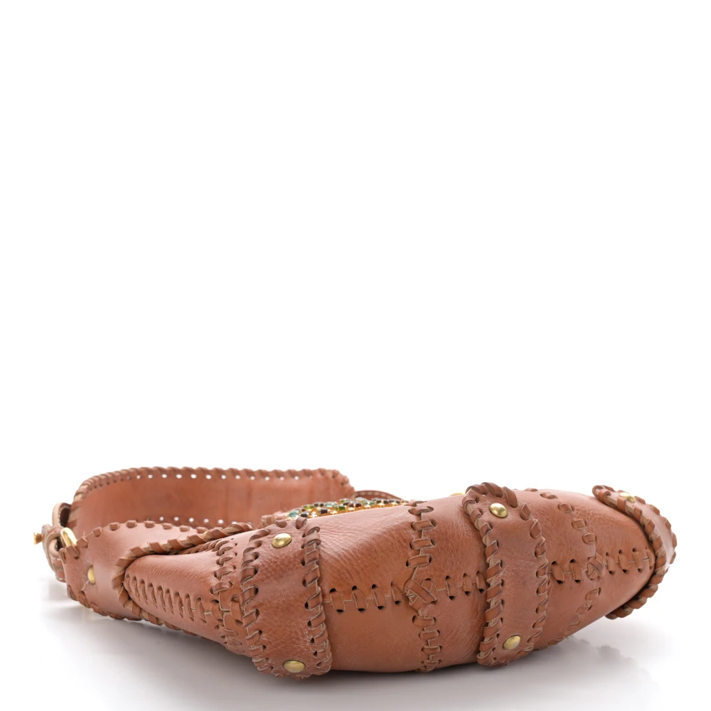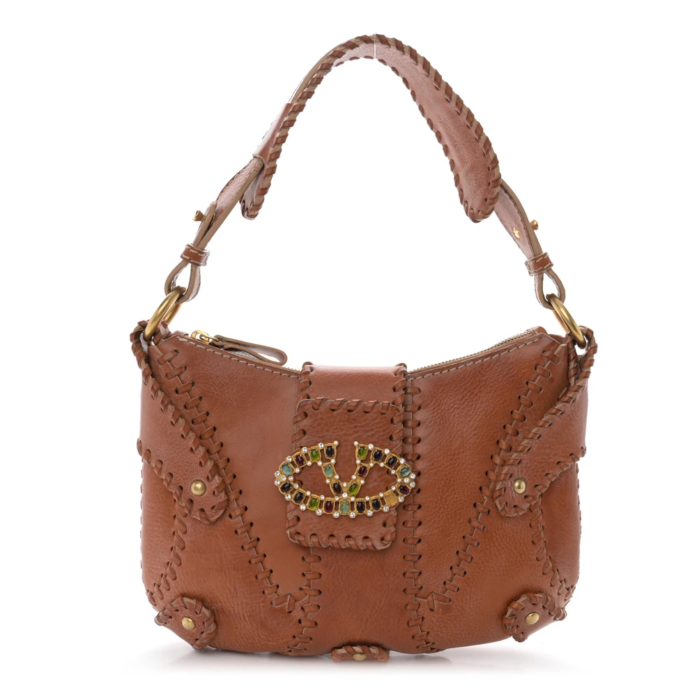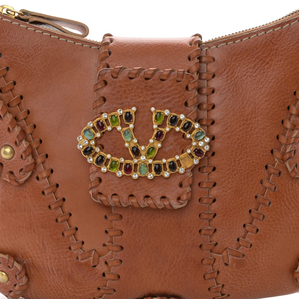 This Valentino Garavani Medium Crystal Logo Catch Shoulder Bag in Brown is luxurious. Beaded and stitched calfskin leather creates a sophisticated design. Spacious for daily needs or evening use. Crystal logo detailing adds a touch of glamour. Perfect for formal events or casual outings. A standout piece in any collection.