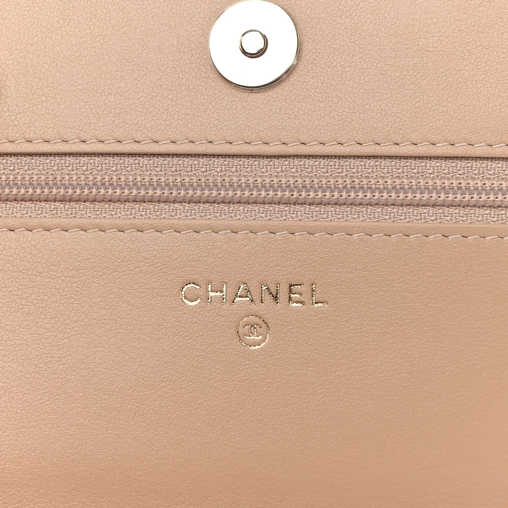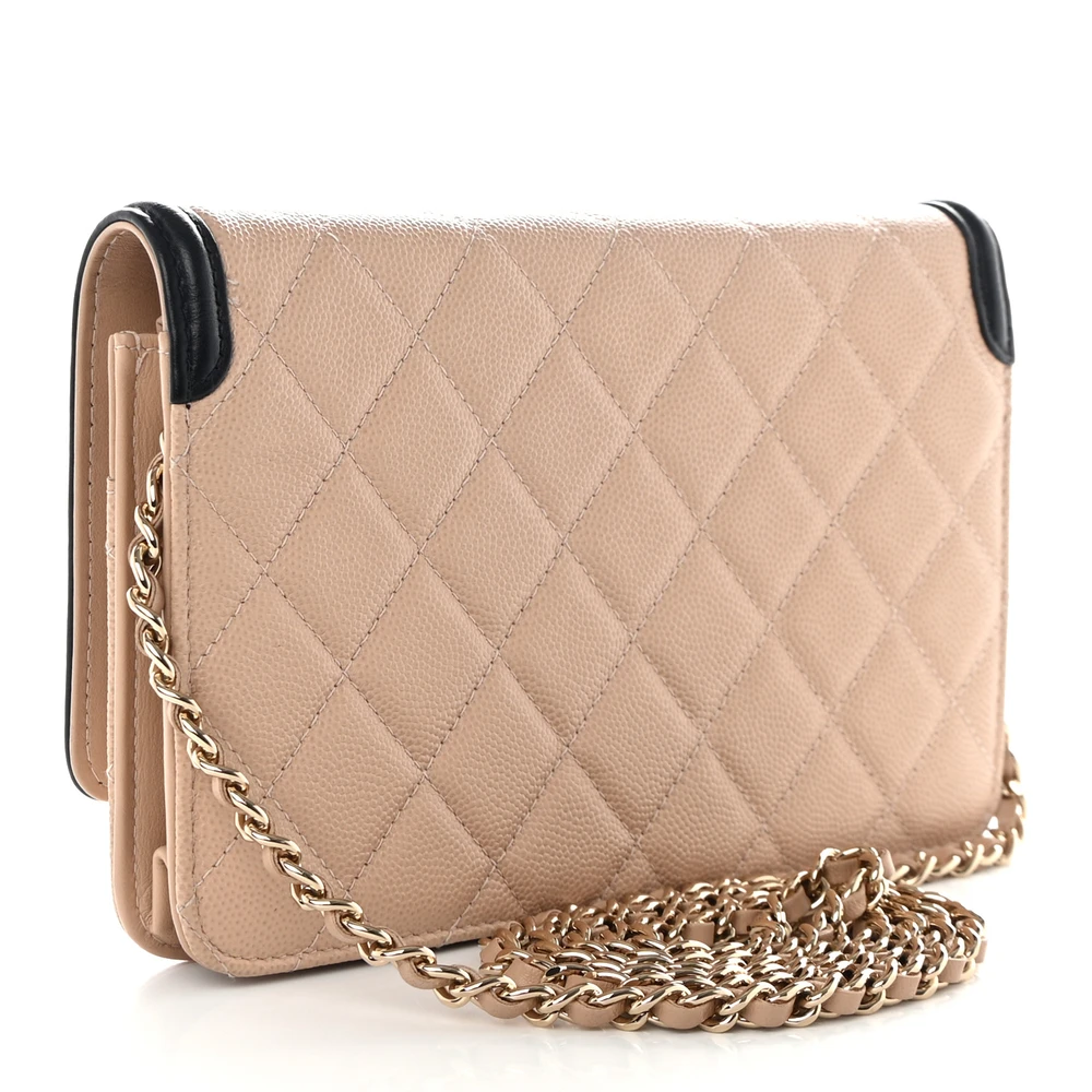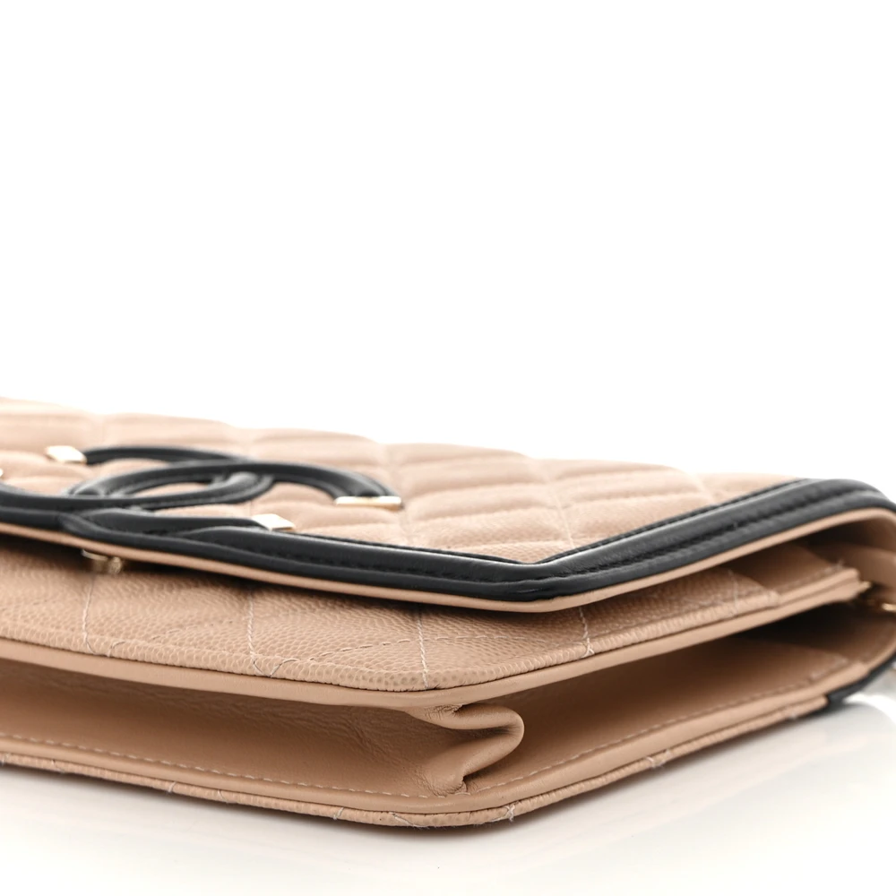 This Chanel CC Filigree Wallet On Chain (WOC) Small in Beige/Black Quilted Caviar Leather with Gold Hardware is a refined and elegant accessory. The beige and black colorway creates a striking contrast, complemented by the durable caviar leather. Gold hardware adds a touch of luxury, elevating its classic aesthetic. Compact yet functional, it features organized compartments for everyday essentials. The chain strap provides versatile carrying options. A sophisticated piece for both casual and formal occasions.