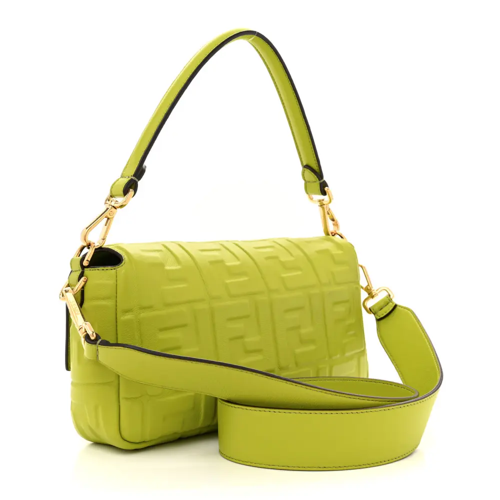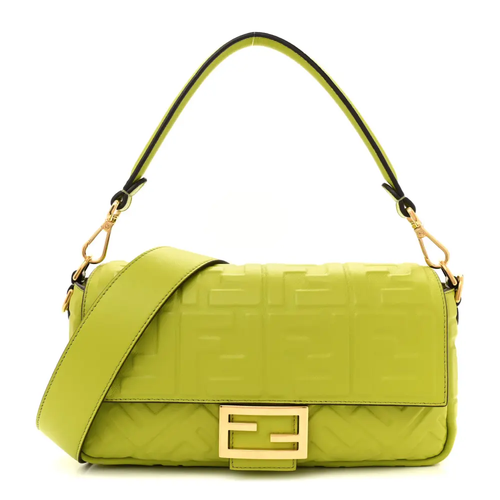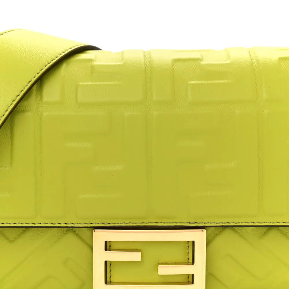 This Fendi FF 1974 Embossed Baguette in Wasabi Nappa Leather is bold and contemporary. Gold hardware accents its unique color and design. Spacious yet compact for your essentials. Perfect for casual outings or elevated looks. A vibrant addition to any accessory collection. A stylish choice for those who love statement pieces.