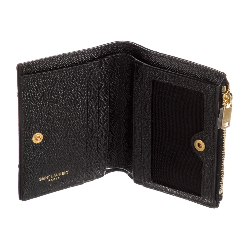 This Saint Laurent Medium Compact Wallet combines modern design with iconic craftsmanship. Crafted from black grained calfskin leather, it features a textured finish that resists wear. The gold hardware adds a luxurious touch to its sleek look. Spacious yet compact, it keeps your essentials secure. This wallet conveys bold elegance with timeless appeal.