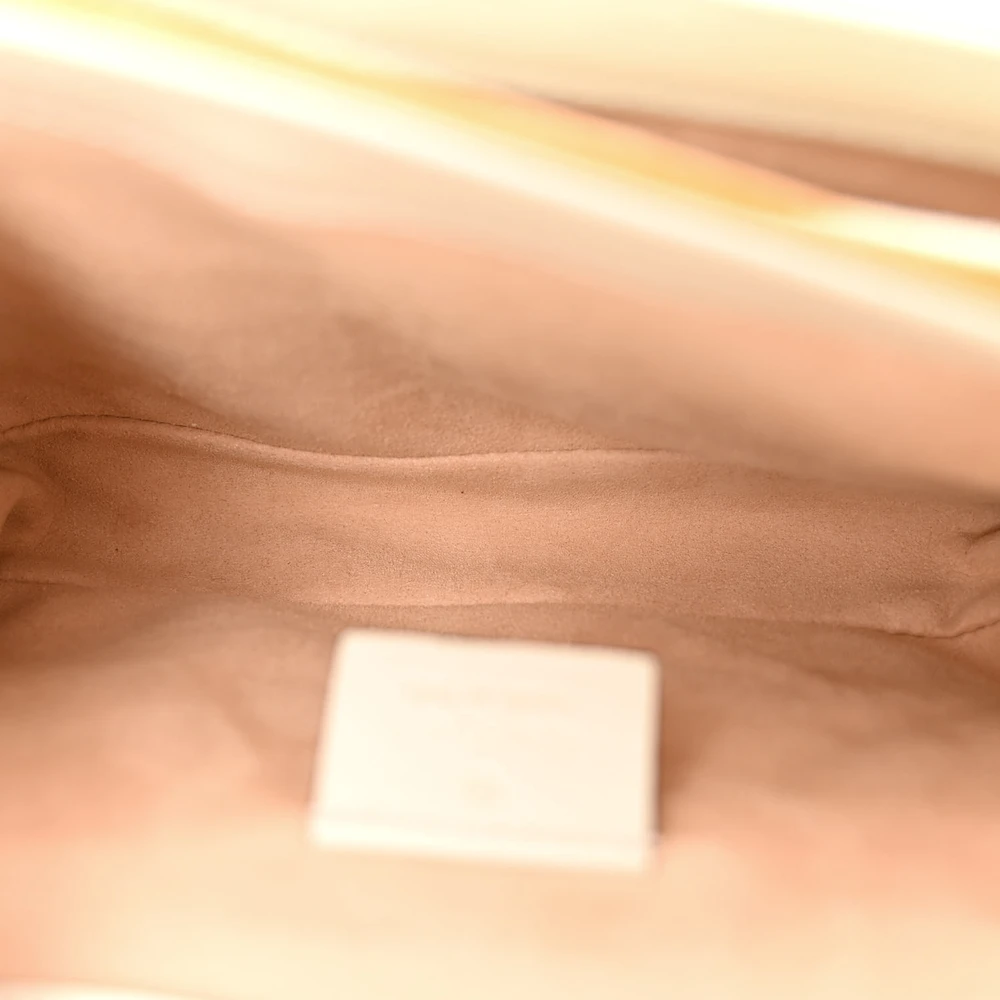 This Gucci Mini Padlock Flap Pocket Shoulder Bag showcases beige/mystic white GG Supreme monogram canvas. Sun oil calfskin leather adds a vibrant touch. Gold hardware highlights its luxurious appeal. Compact and chic for carrying essentials. A timeless accessory for day or night.
