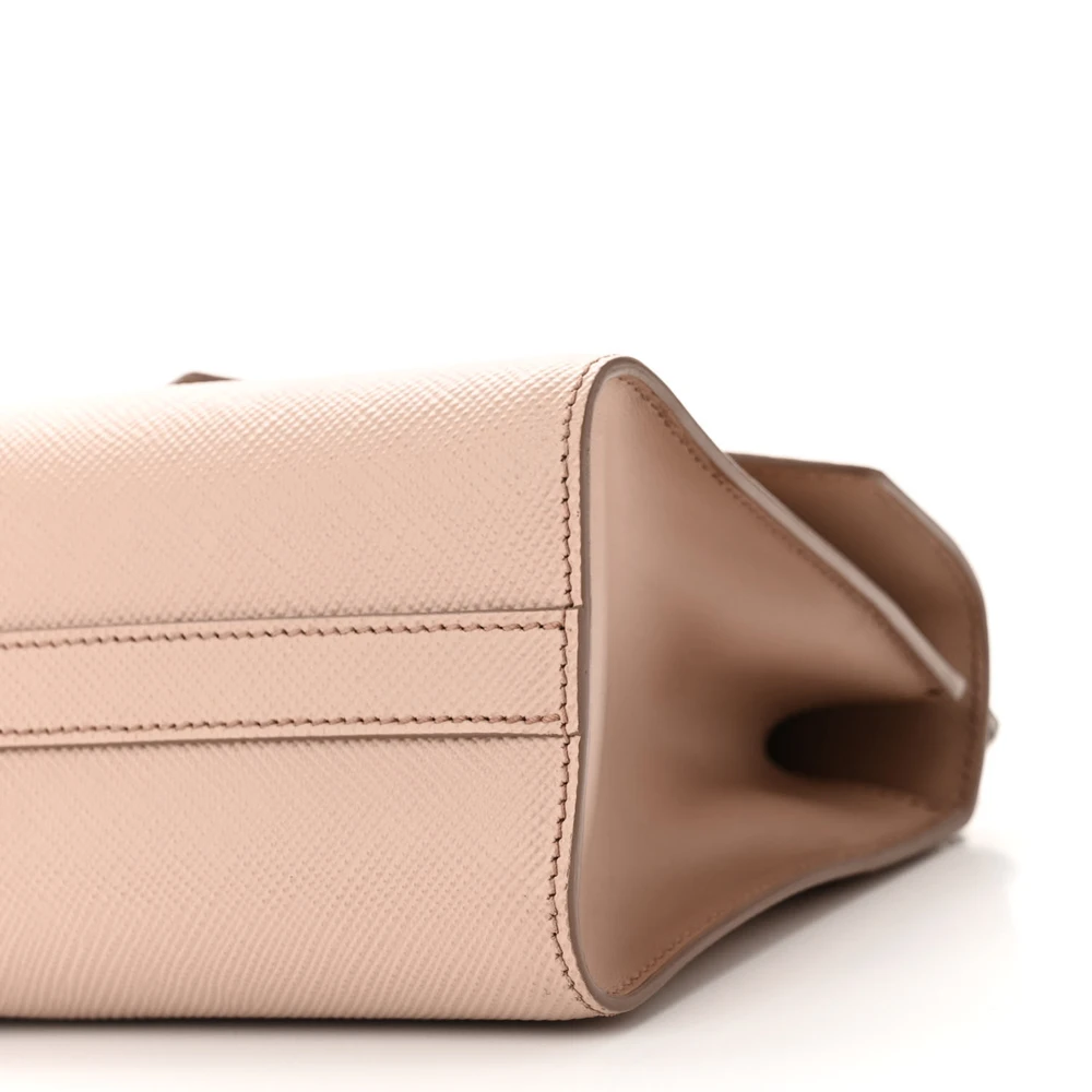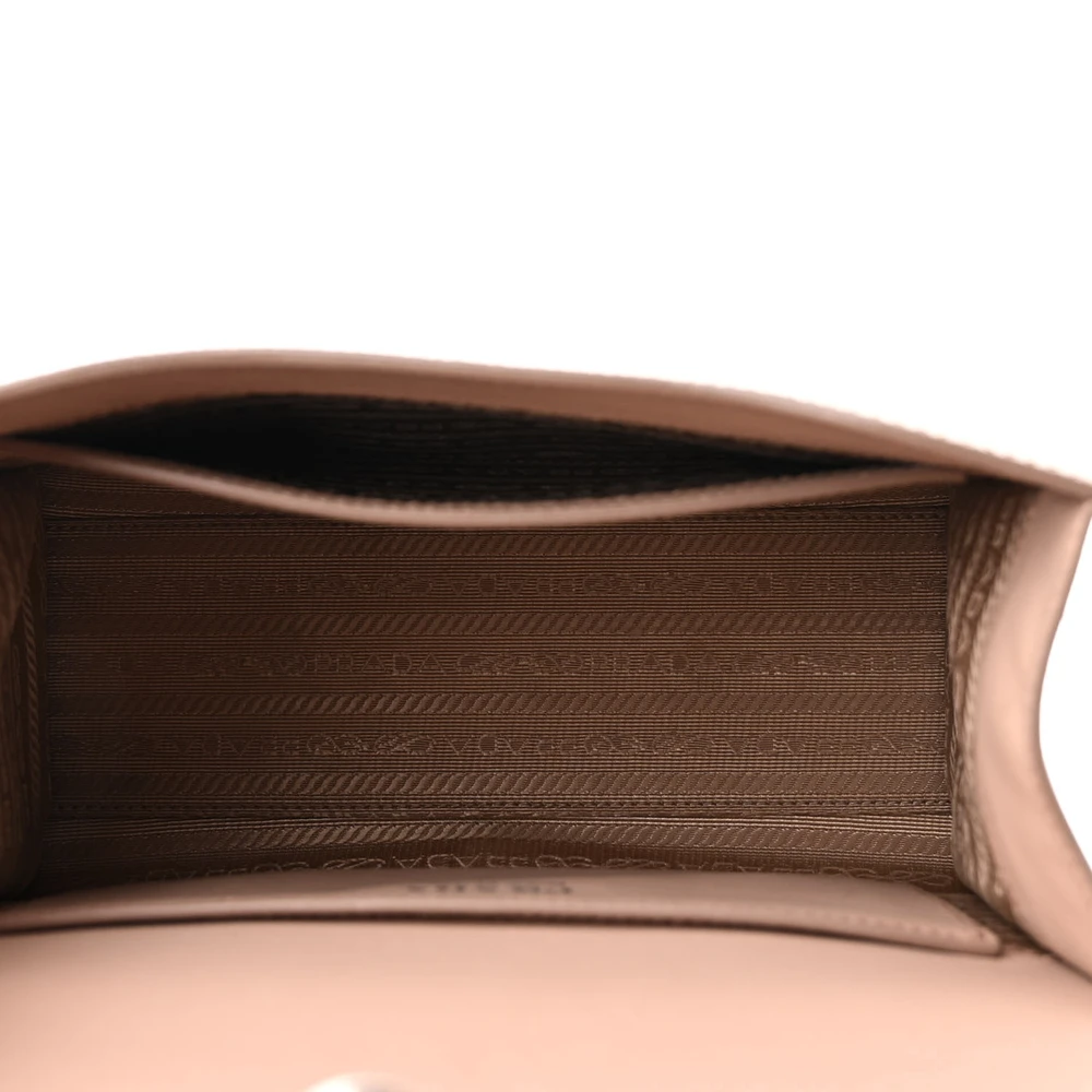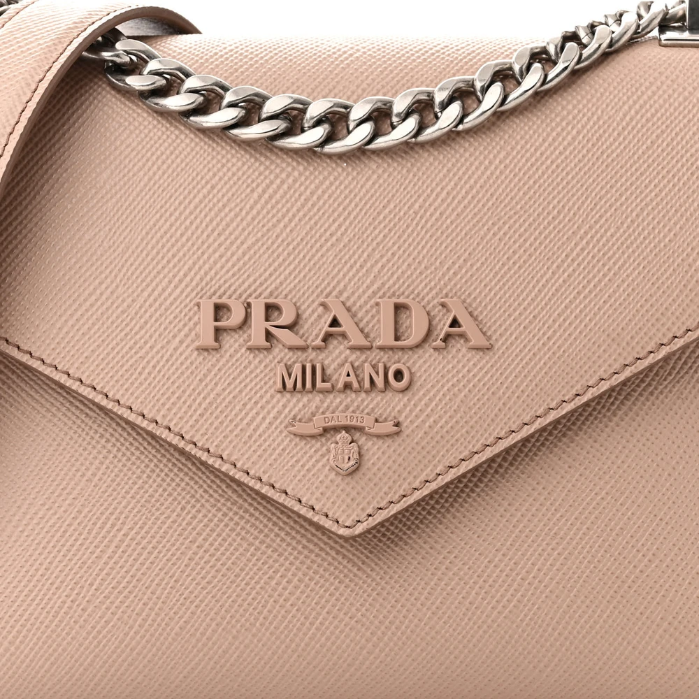 This Prada Monochrome Envelope Flap Chain Shoulder Bag in Cipria features Saffiano Cuir calfskin leather. Silver hardware enhances its minimalist design. Compact yet functional, it’s ideal for essentials. Chain strap offers versatile styling options. Perfect for both formal and casual settings. A sleek and elegant bag.
