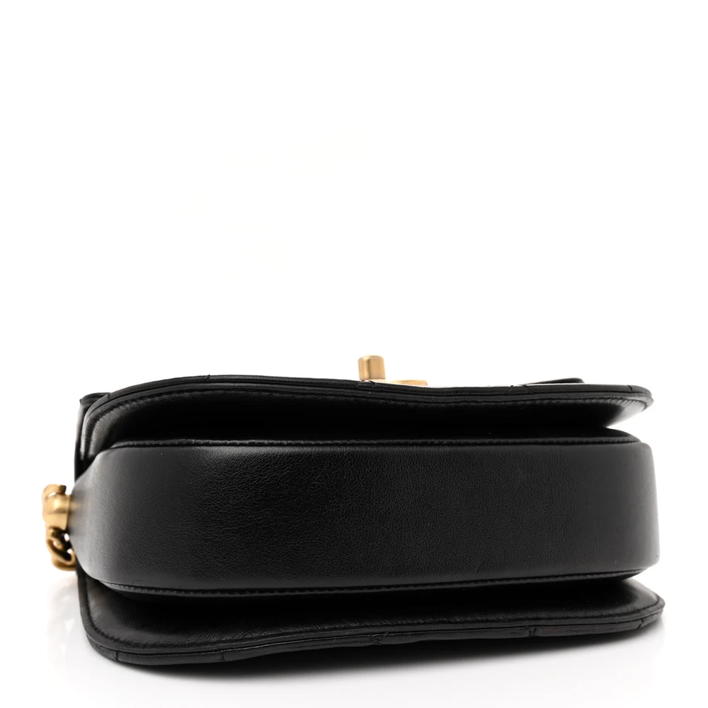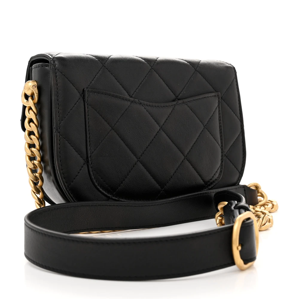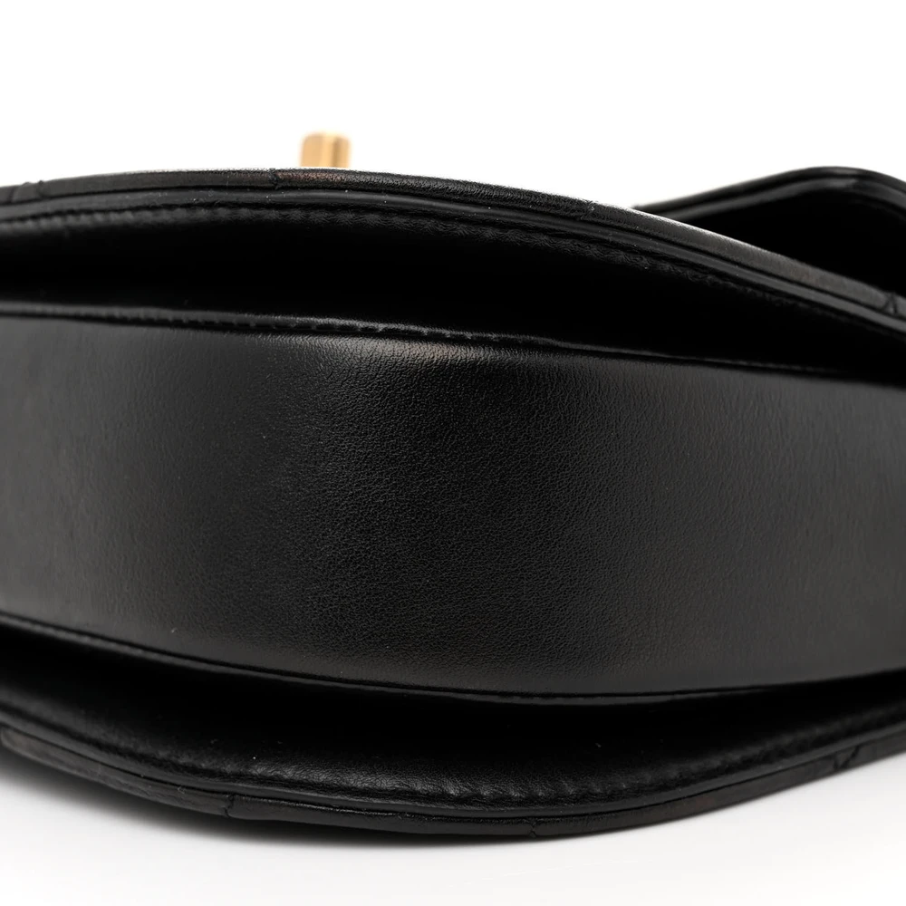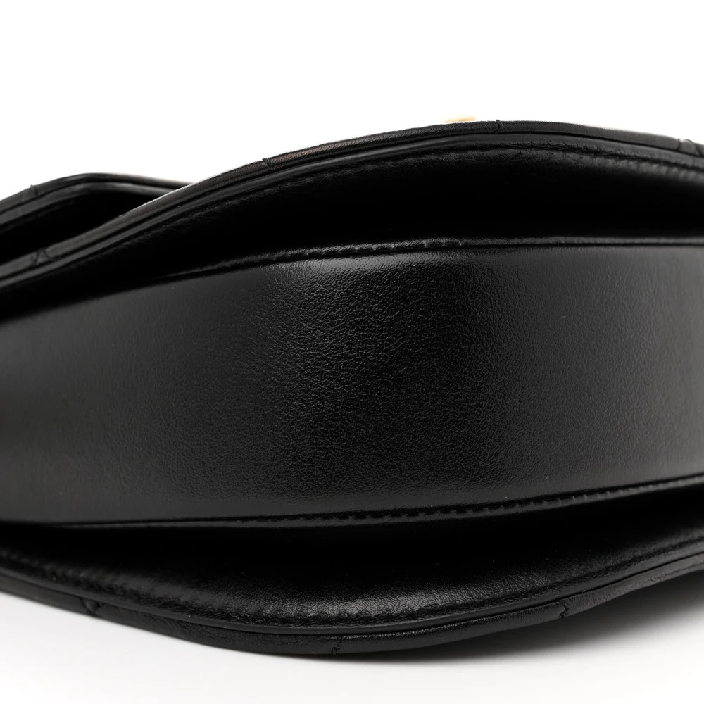 This Chanel Moon Messenger Bag Small in Black Quilted Calfskin Leather with Aged Gold Hardware exudes modern elegance. The soft quilted calfskin leather adds a touch of luxury, while the aged gold hardware provides a vintage-inspired finish. Its curved silhouette and adjustable strap offer versatility and comfort for crossbody wear. Spacious enough for daily essentials, it blends functionality with a chic aesthetic. Perfect for casual outings or evening wear. A contemporary addition to any collection.