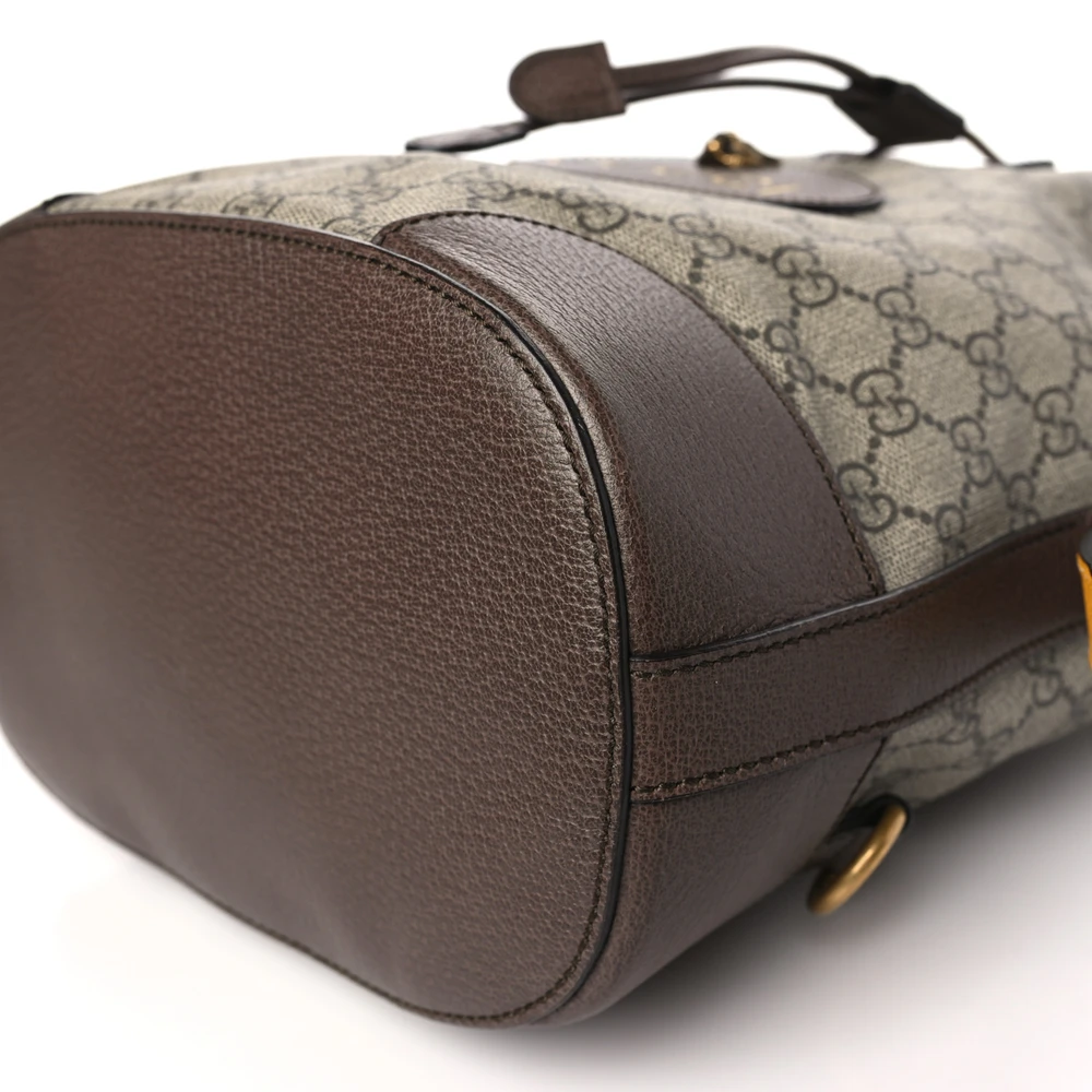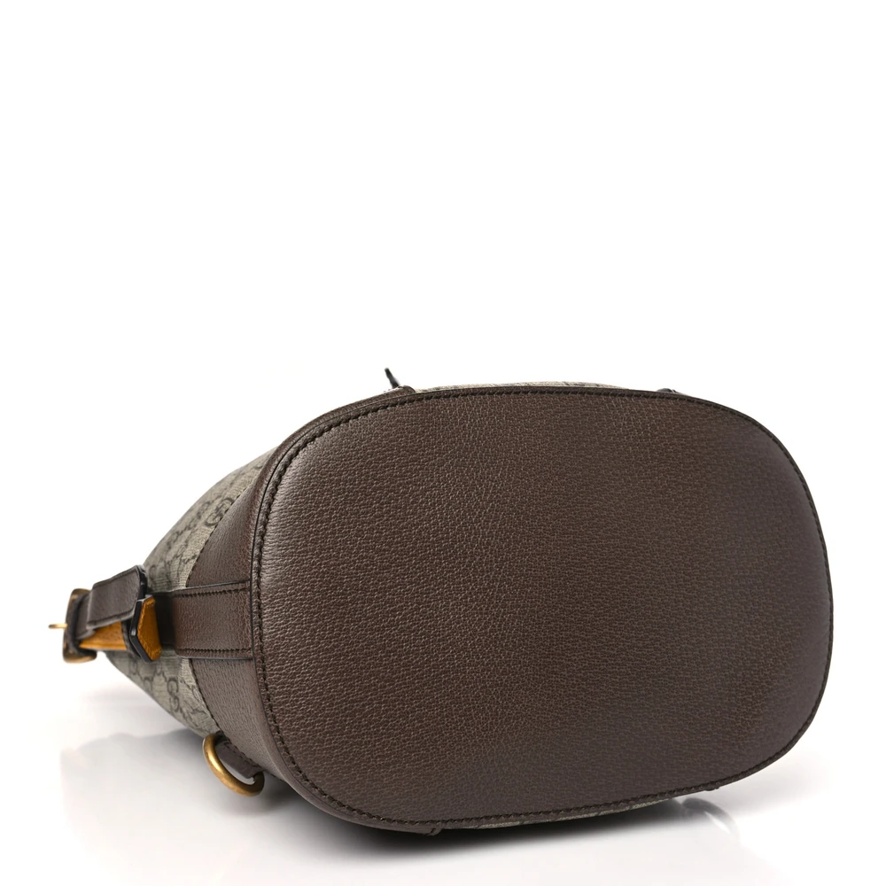 This Gucci Medium Neo Vintage Drawstring Bucket Backpack is crafted in New Acero crop GG Supreme monogram canvas. Gold hardware complements its classic design. Spacious interior accommodates daily needs. Drawstring closure ensures security. A stylish and practical accessory.