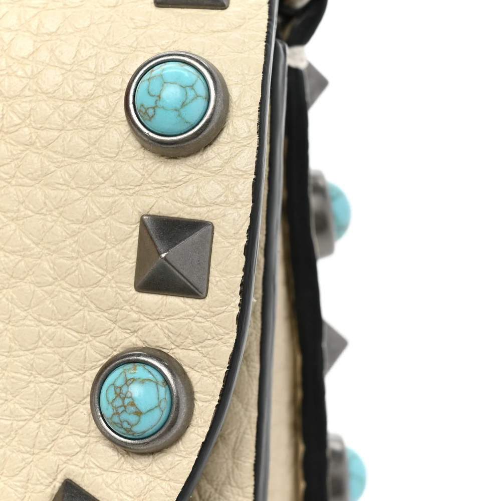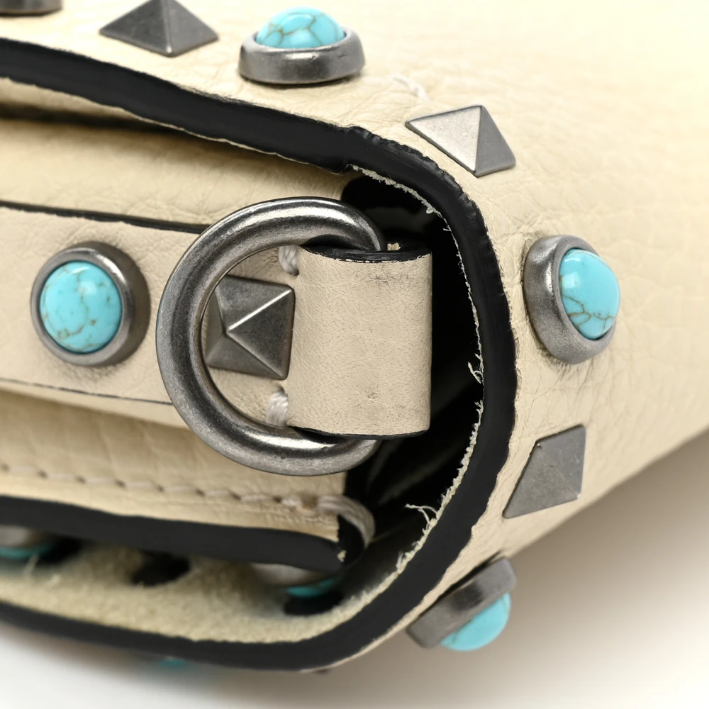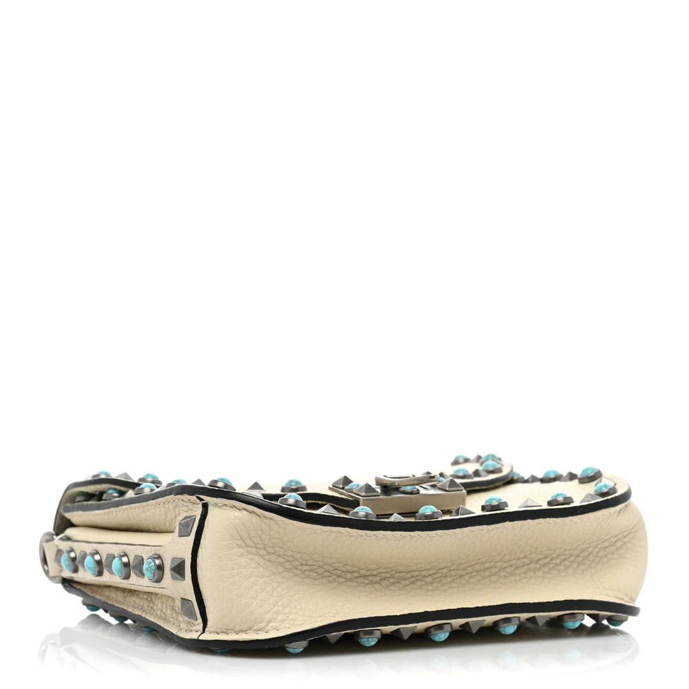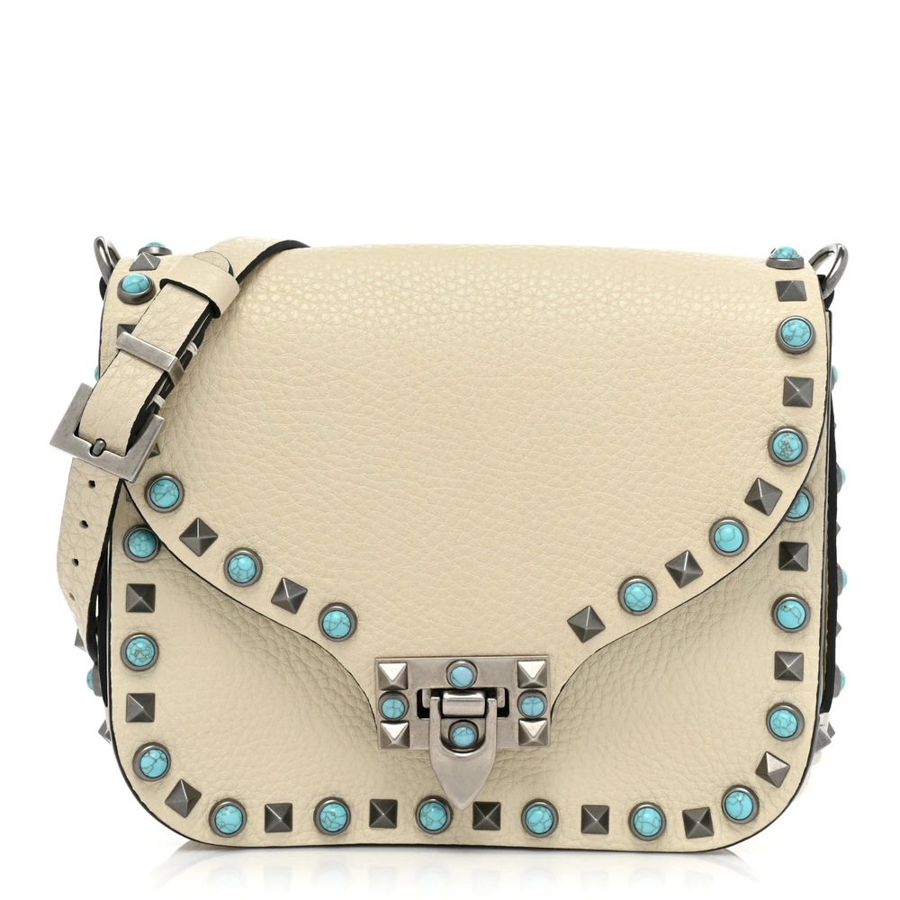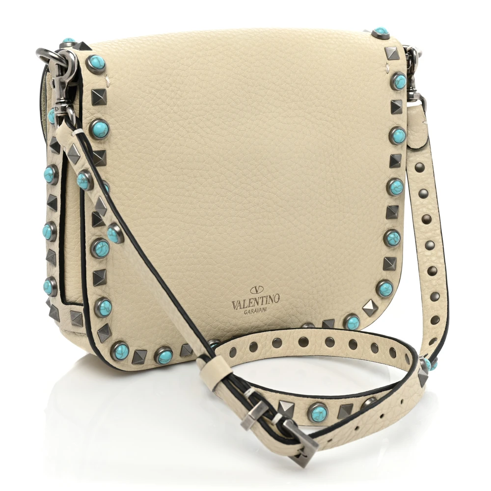 This Valentino Garavani Turquoise Rockstud Rolling Flip Lock Crossbody Bag in Light Ivory is unique. Grained calfskin leather and turquoise Rockstuds create a striking look. Compact yet spacious for essentials. Perfect for casual outings or stylish statements. A bold accessory with timeless appeal.