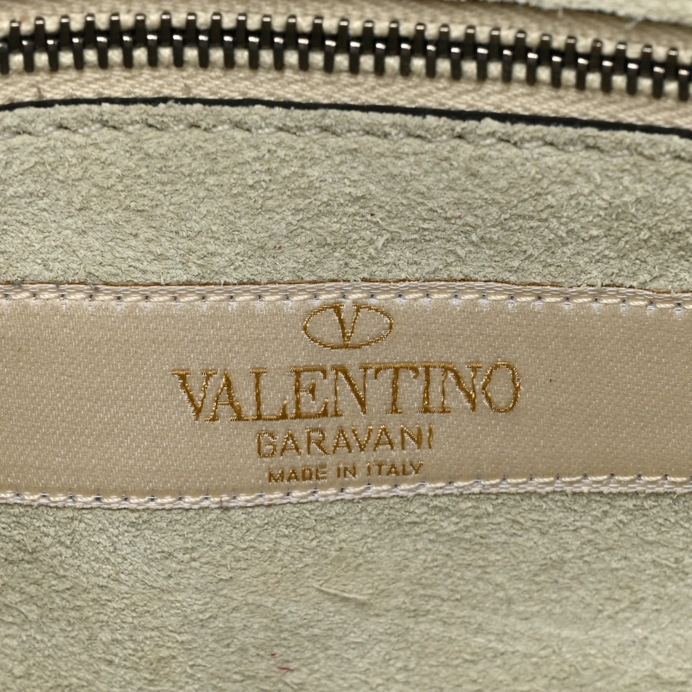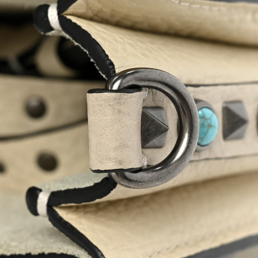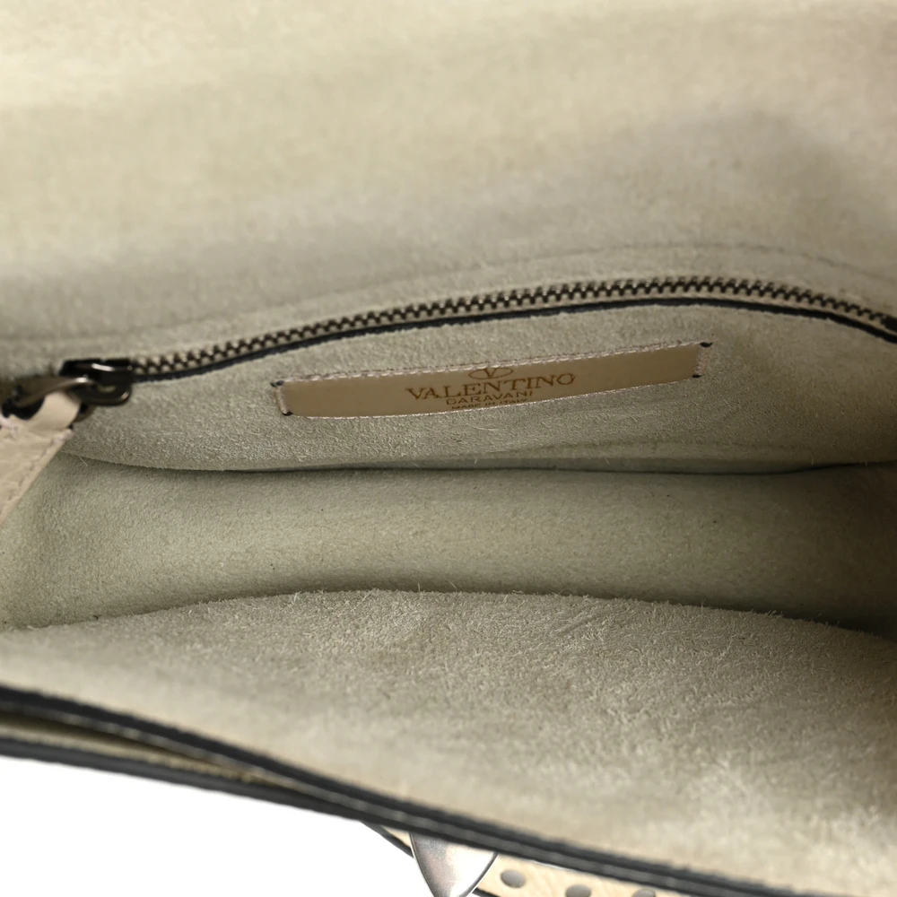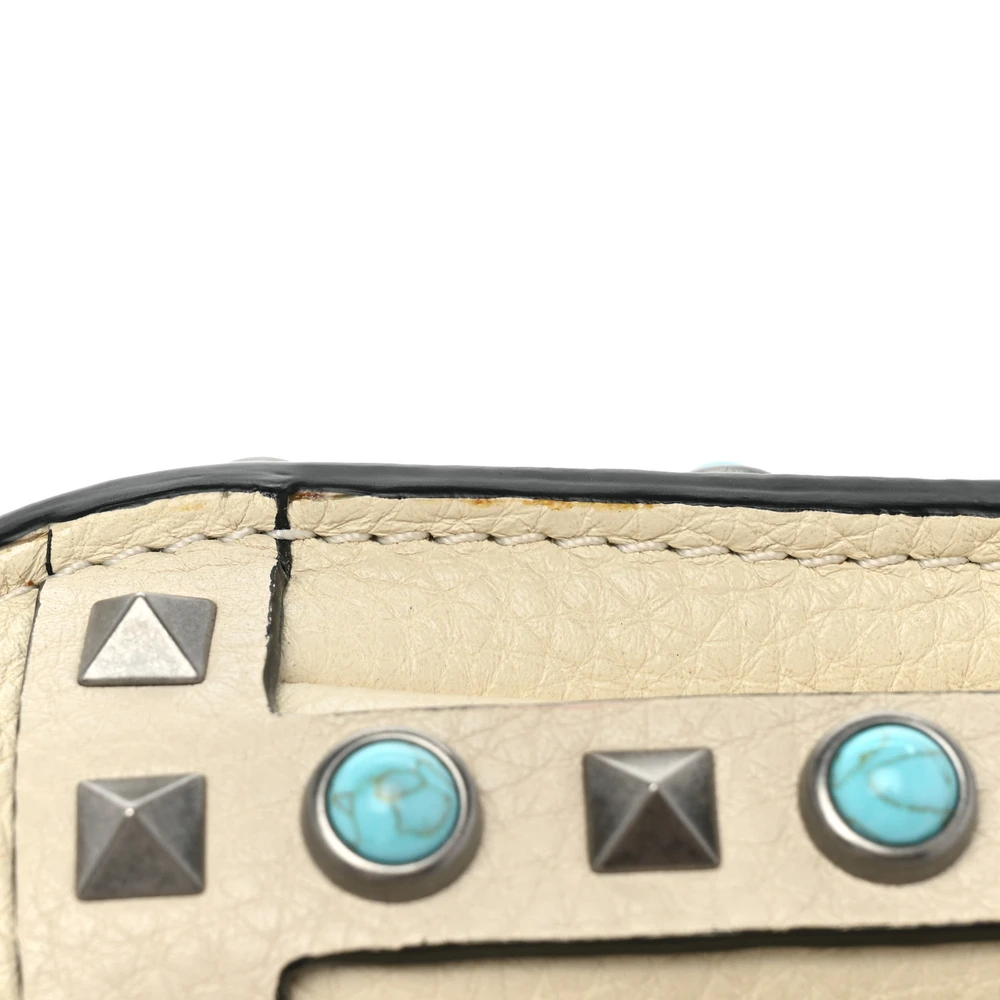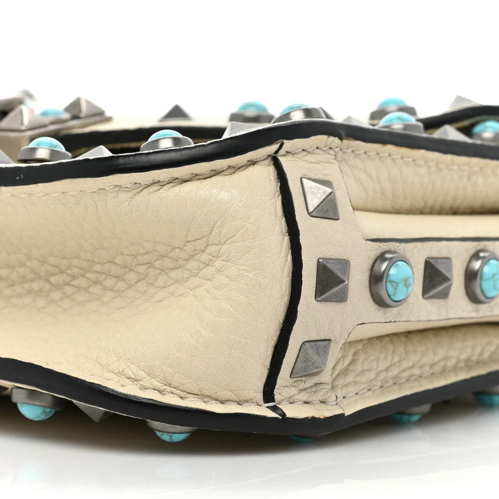 This Valentino Garavani Turquoise Rockstud Rolling Flip Lock Crossbody Bag in Light Ivory is unique. Grained calfskin leather and turquoise Rockstuds create a striking look. Compact yet spacious for essentials. Perfect for casual outings or stylish statements. A bold accessory with timeless appeal.