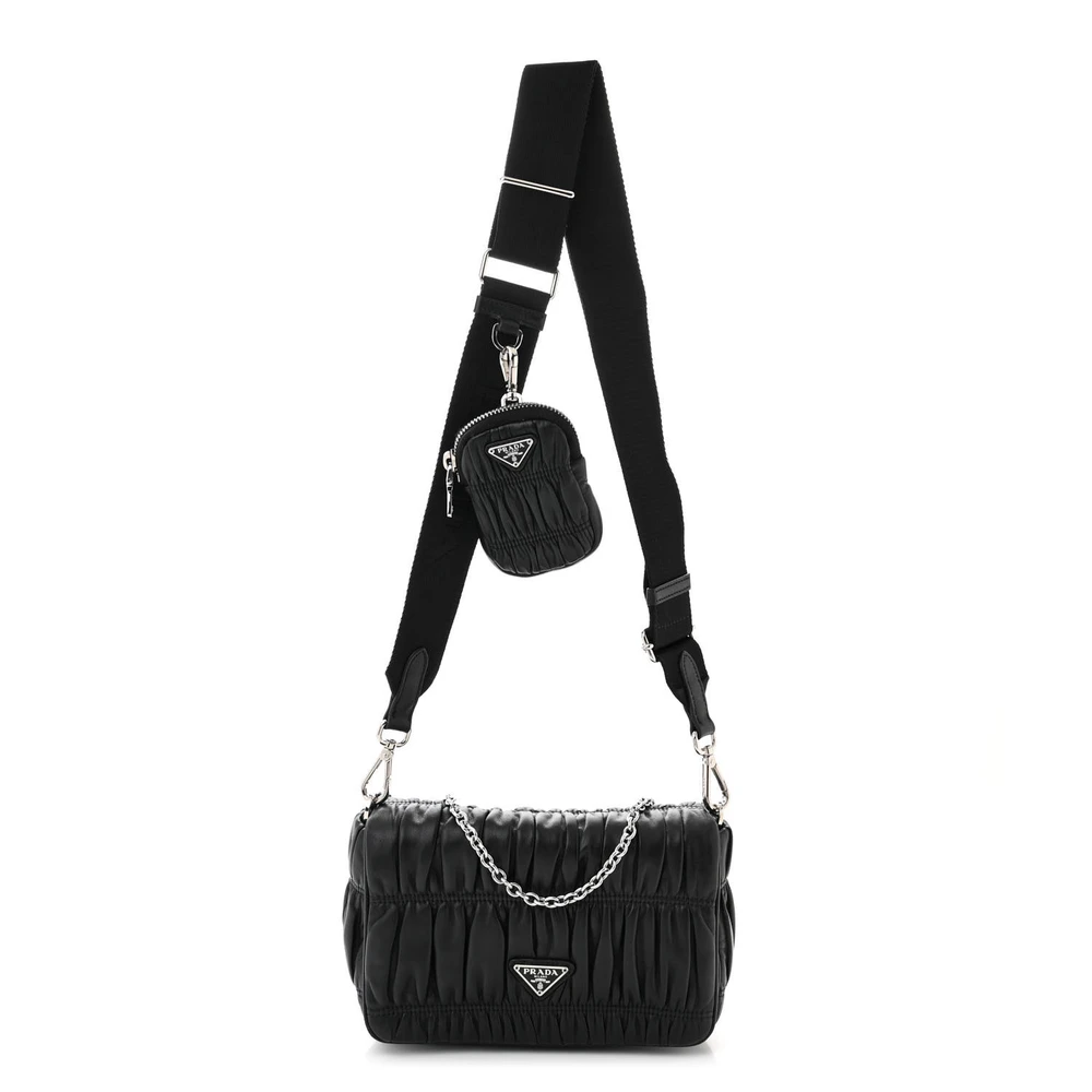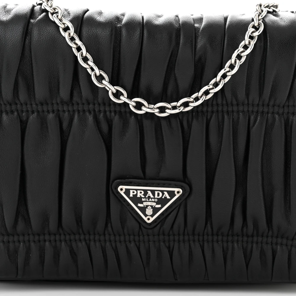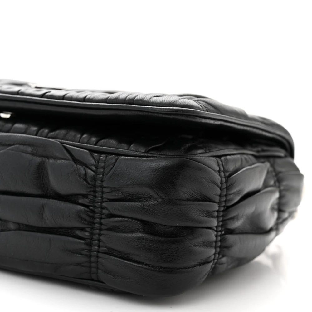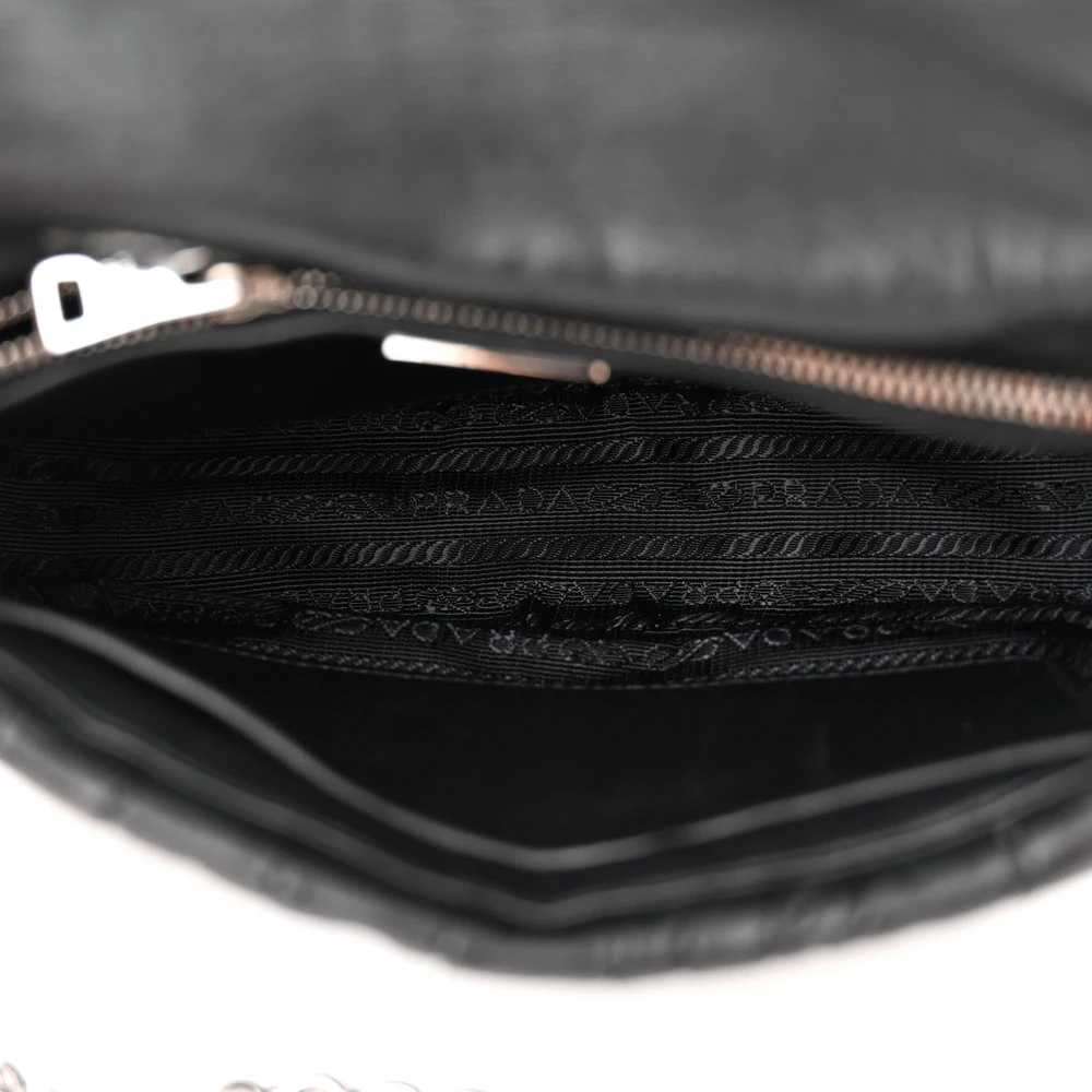 This Prada Medium Gaufre Flap Shoulder Bag in Black features nappa leather construction. Silver hardware adds a contemporary touch. Spacious interior provides practical storage. Comfortable strap for effortless carrying. Perfect for casual or formal settings. A stylish and versatile shoulder bag.