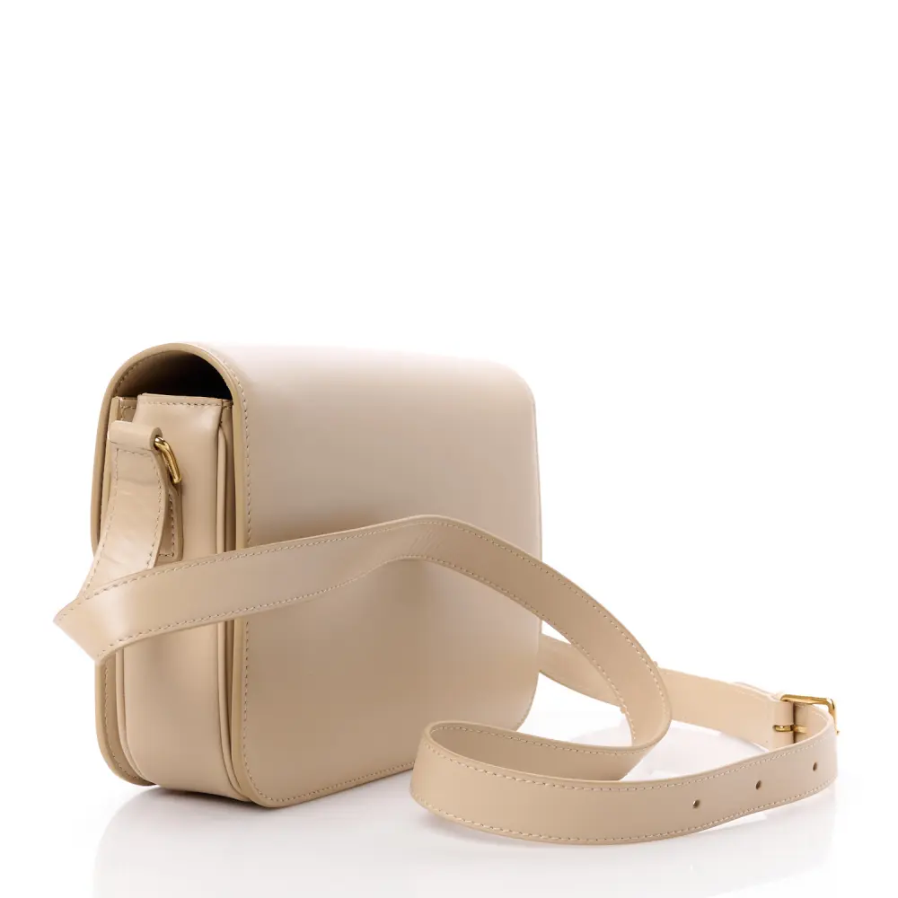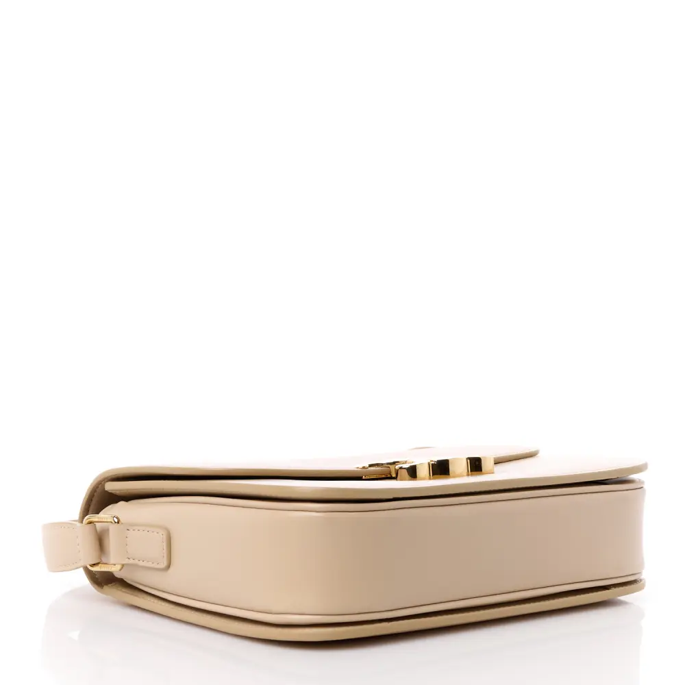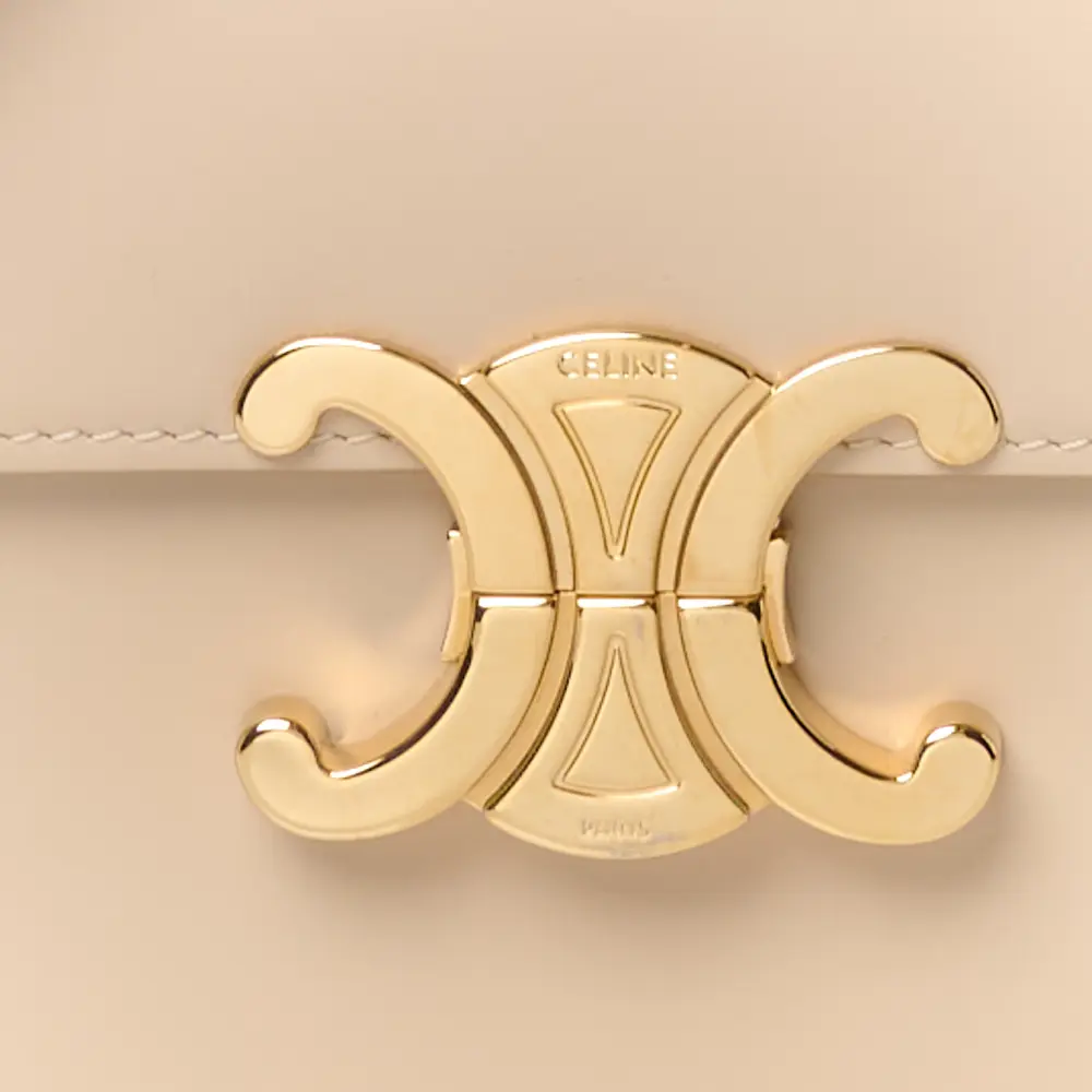 This Celine Medium Triomphe Bag in Nude showcases shiny calfskin leather with gold hardware. Its structured silhouette adds a touch of sophistication. Spacious yet elegant, it suits everyday essentials. The adjustable strap ensures comfortable wear. A polished choice for modern, versatile styling.